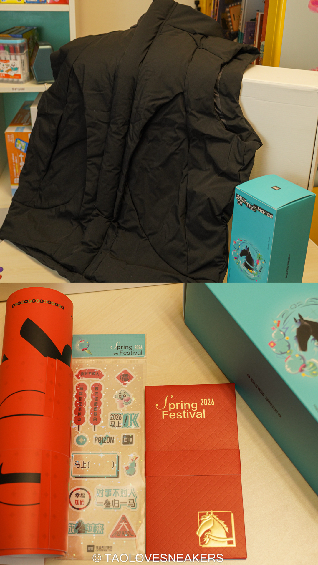 我一定要先说这个羽绒马甲!贴心小马甲有没有!,我觉得颜值和质感都很在线,双拉链设计很实用,POIZON的拉链头小细节真心喜欢。黑色果然百搭,平时出门随便套都好看。 礼盒里还有对联、福字、红包和贴纸,仪式感满满!偷偷许个愿:不知道以后有没有机会收到更多给自己的鞋子呢?浅浅期待一下!✨ #羽绒暖暖计划 #新年礼盒 #盒选新年礼物 #马年怎么能少了小马甲