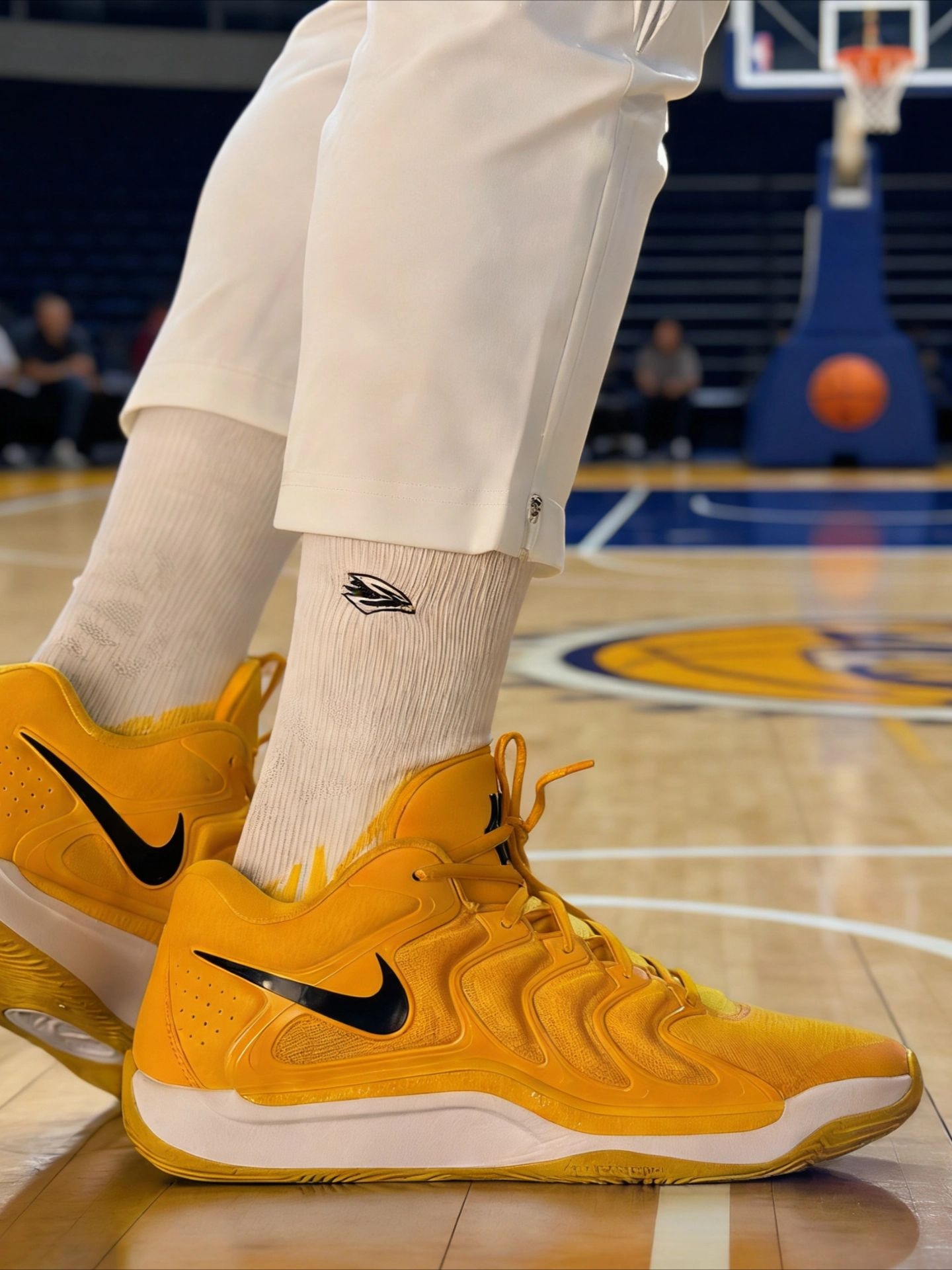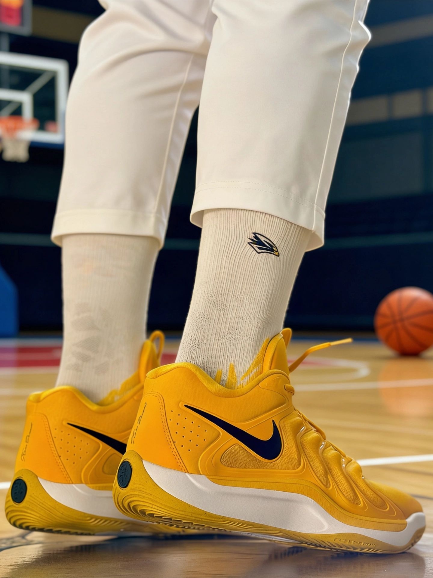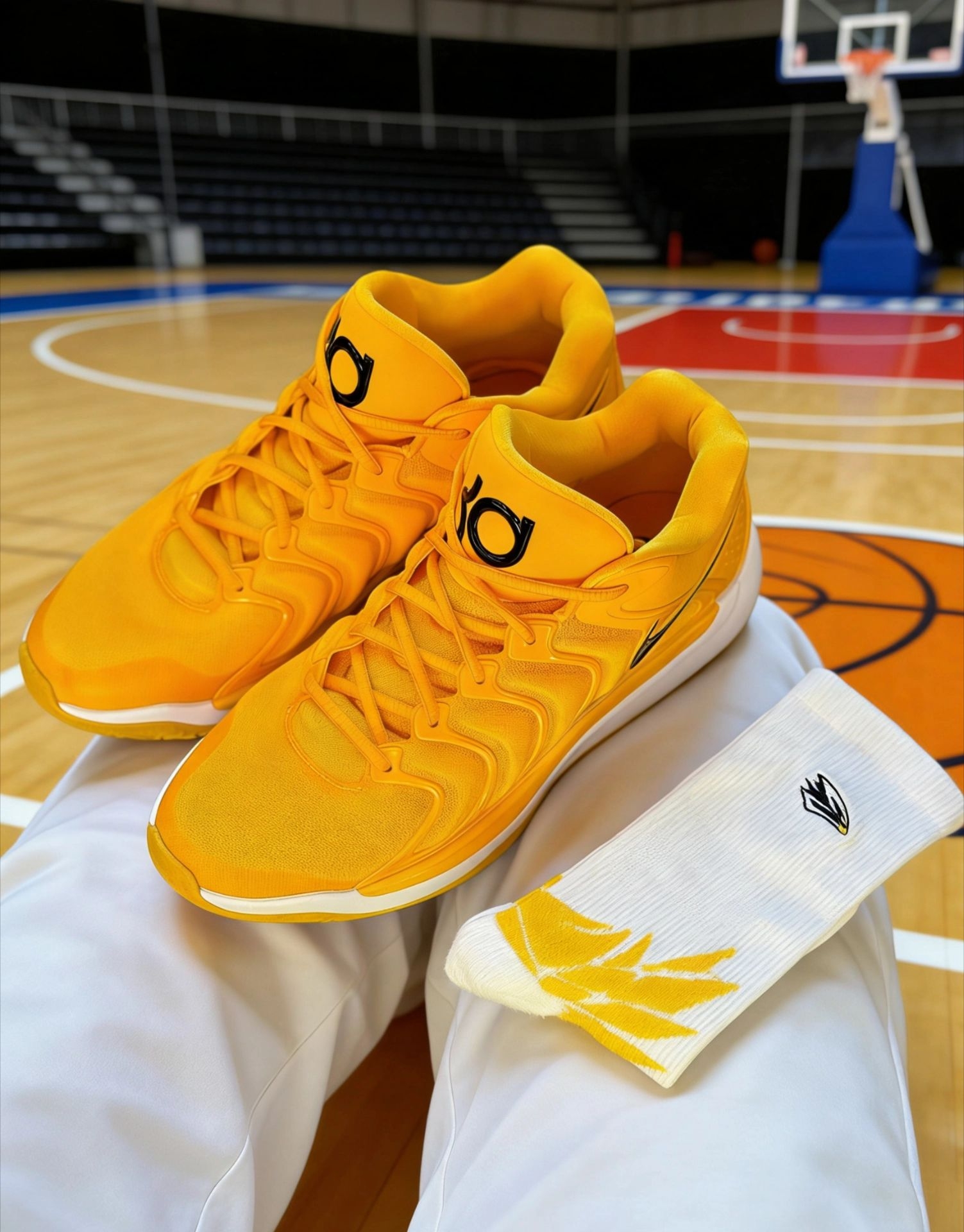 KD17实战还是帅?这个配色你怎么看?|||好久没发球鞋OOTD了,刚入的KD17 TB黄真的亮眼。特意搭了双维动隼的球袜,美版鞋偏紧,这轻薄款袜子正好中和一下。上脚包裹感强但不勒,高帮造型美式味儿很足。袜子和鞋的黄色细节呼应很到位,日常这么穿出街回头率超高🏀。#晒晒你的必入袜子鞋 #复古袜子穿搭 #维动球袜 #复古袜子穿搭 ##美式复古袜子