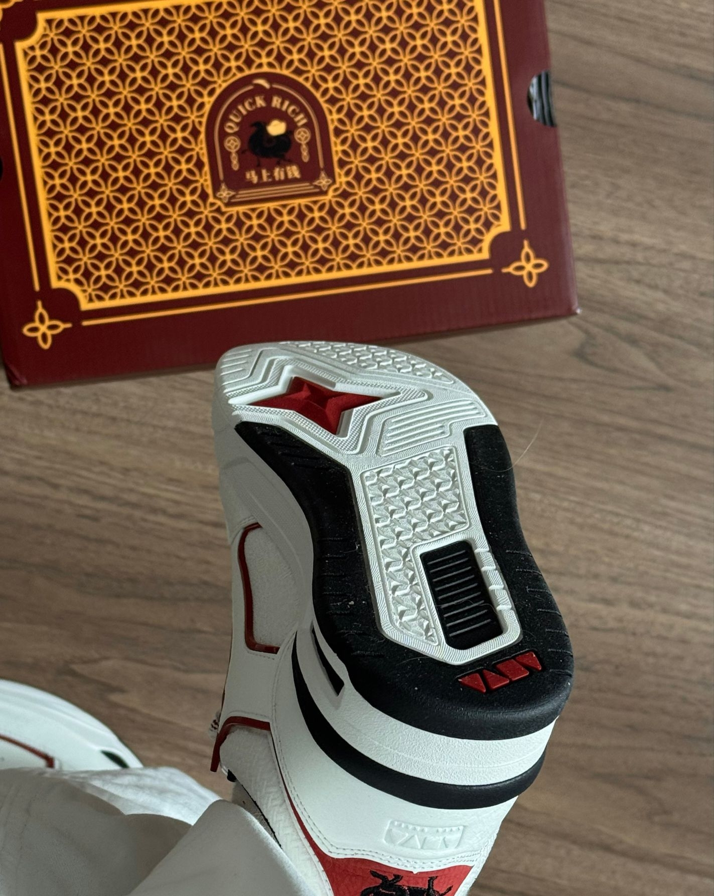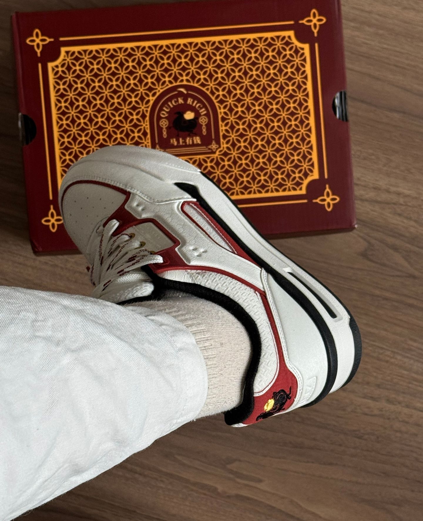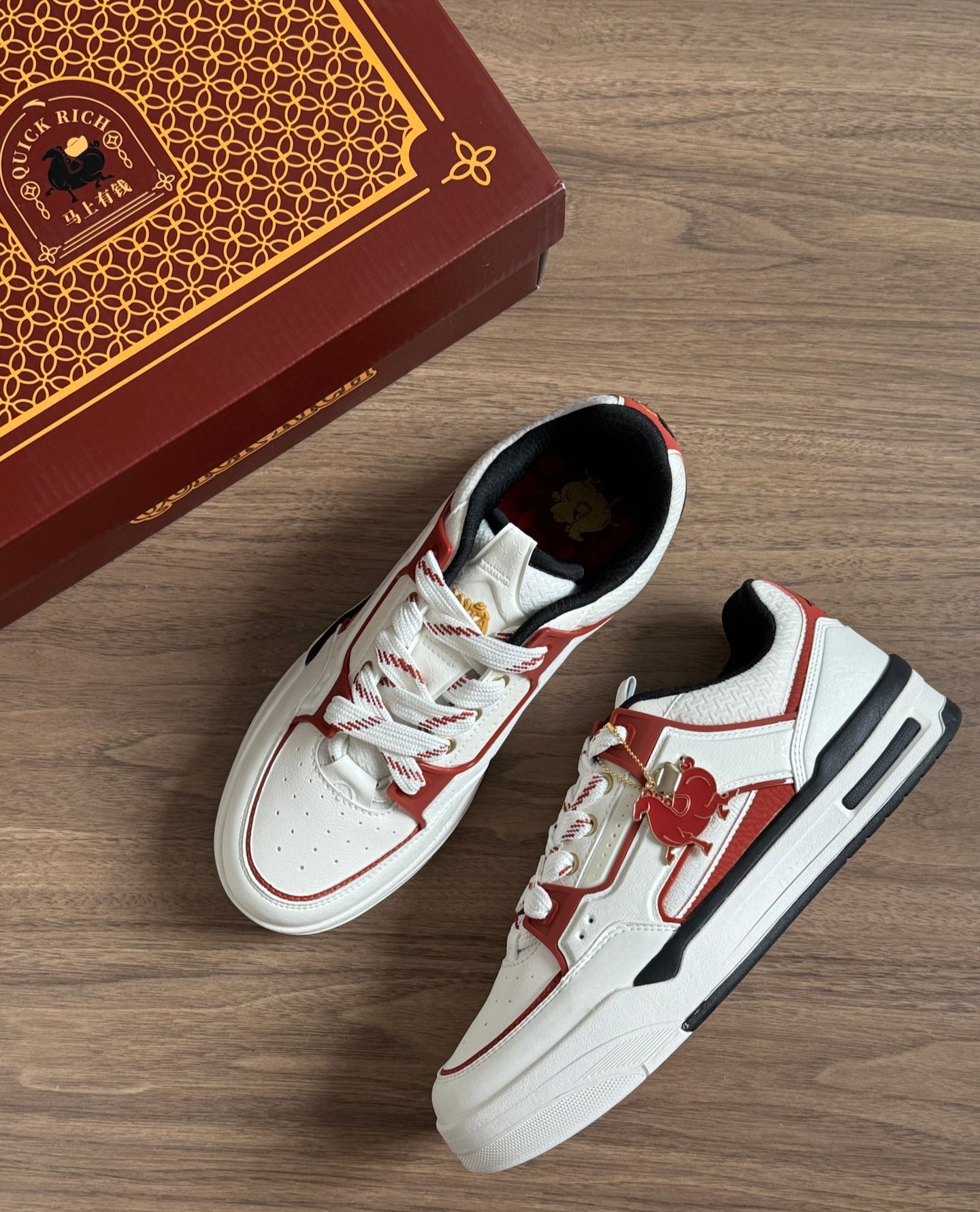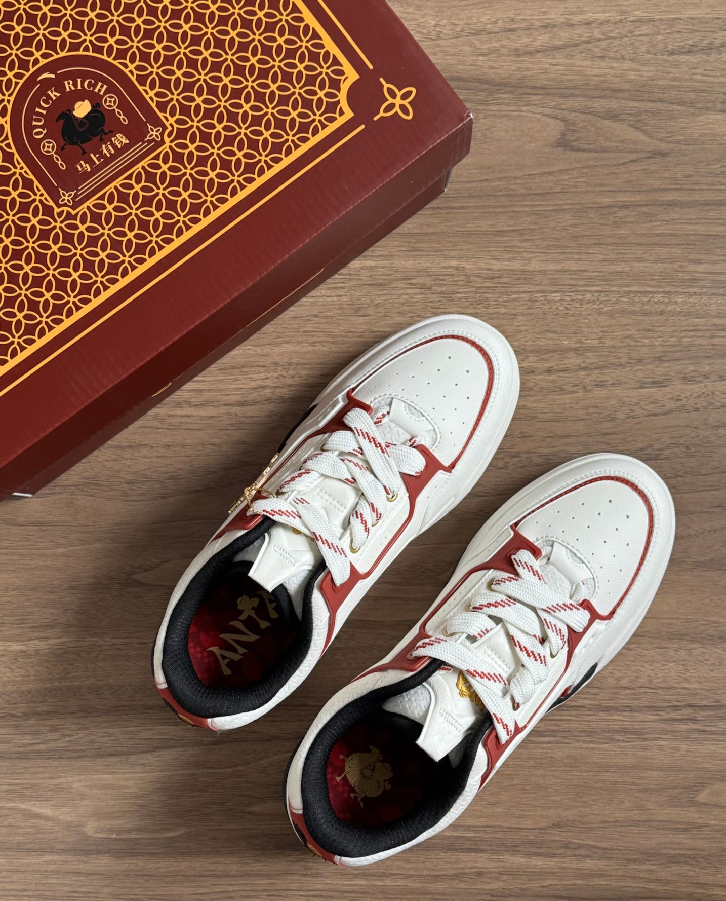 好喜欢这双骜杰板鞋👟 鞋后跟的马上有钱设计很适合新年穿💰 寓意很好耶✔️ 上脚感觉很舒服☁️ 挺软乎的,侧边小挂饰,好爱😘