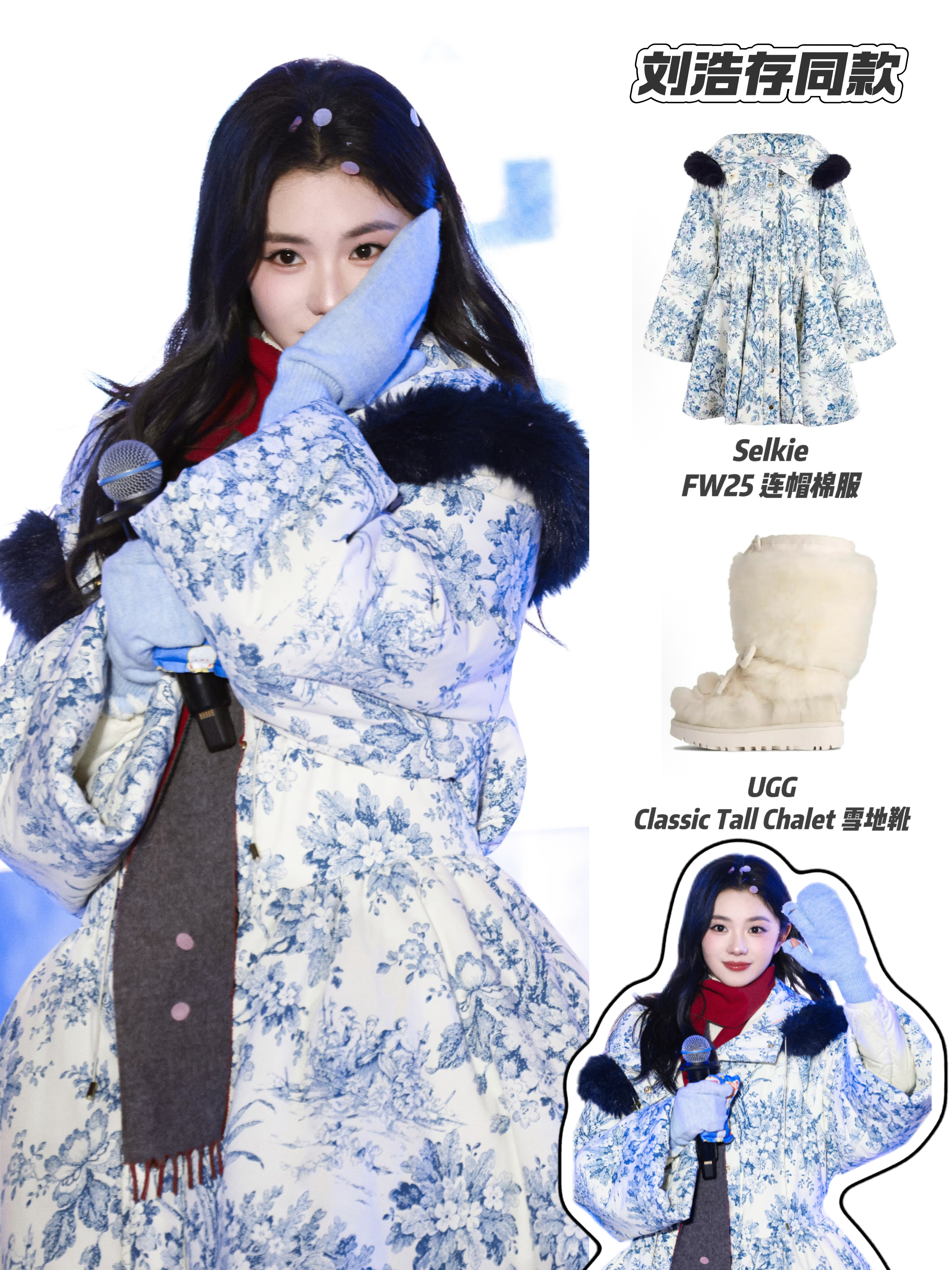 存子这套穿搭把冬日甜妹氛围感拉到满分💯 Selkie蓝白碎花棉服自带蓬蓬裙摆和毛球装饰,像从童话里走出来的冰雪公主,UGG雪地靴和白袜把保暖和可爱焊在了一起。童话感拉满!冬日氛围感直接封神❄️