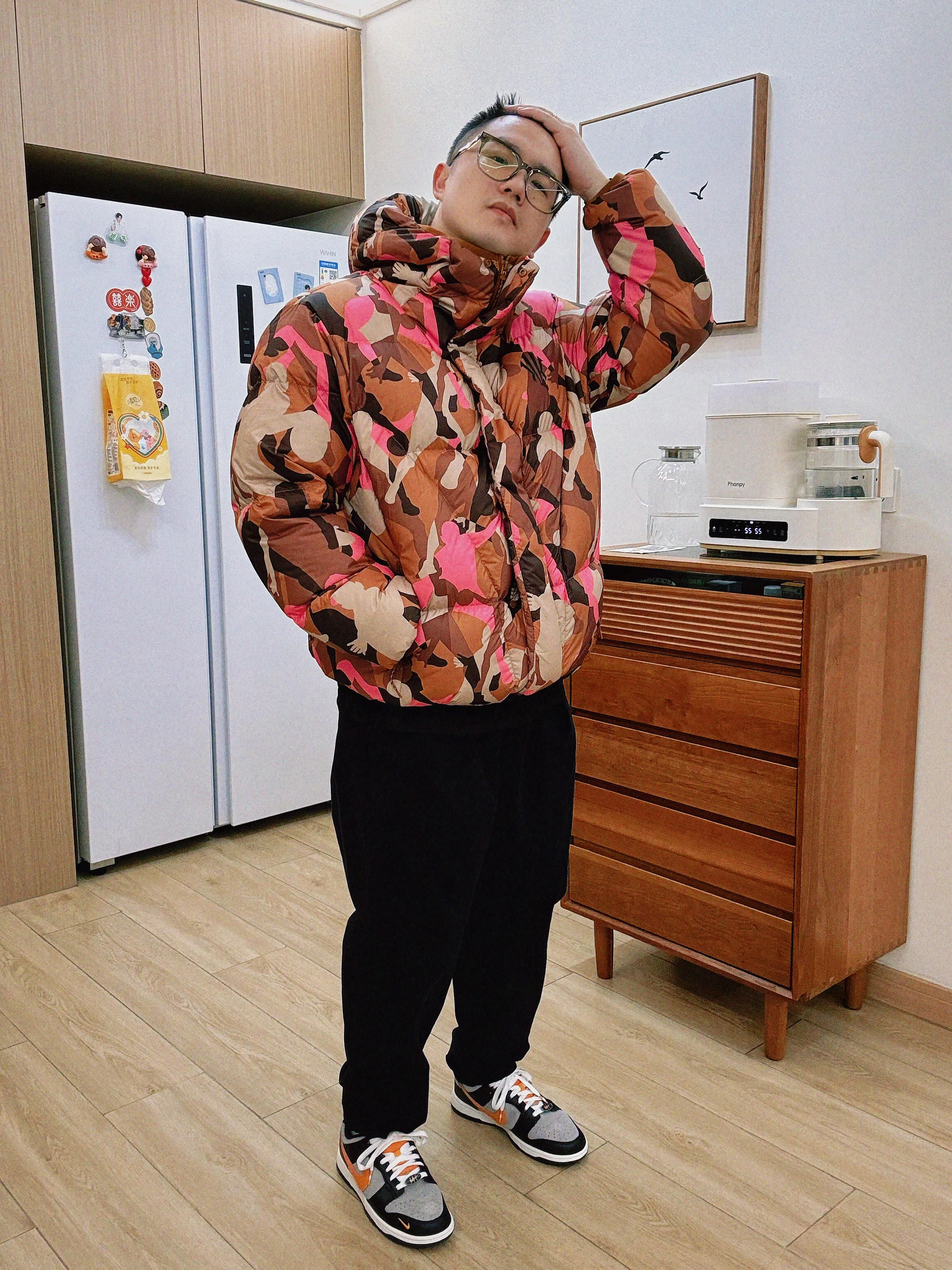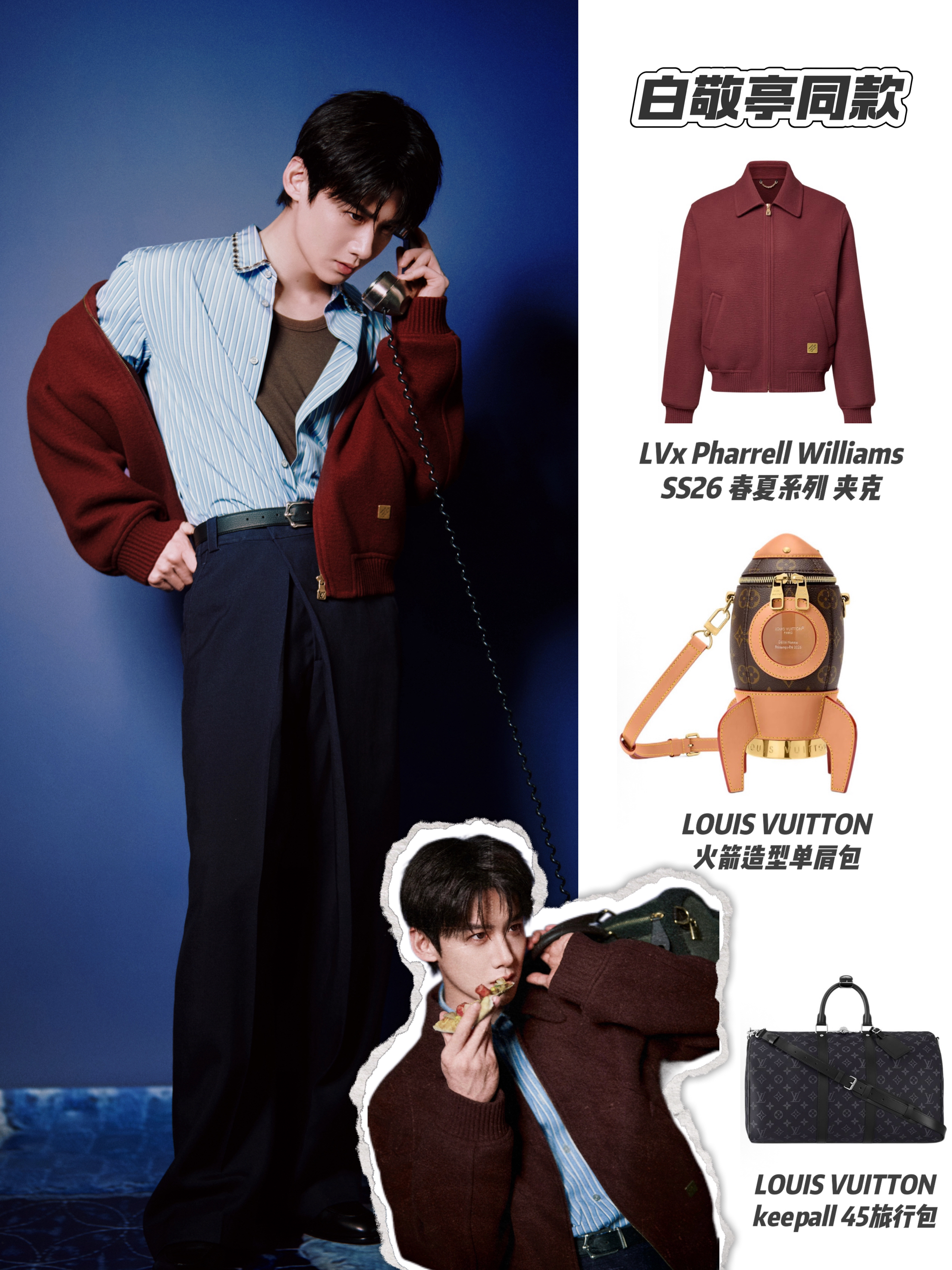 小白这件LV和Pharrell联名系列把复古贵气直接拿捏住🤏 酒红色夹克自带绒面肌理,质感高级又显白,内搭的蓝白条纹衬衫为整体注入清爽细节,搭配黑裤利落挺拔。火箭造型单肩包和Keepall旅行包作为点睛配饰,整套造型既适合出席活动,又能轻松驾驭日常出街😎