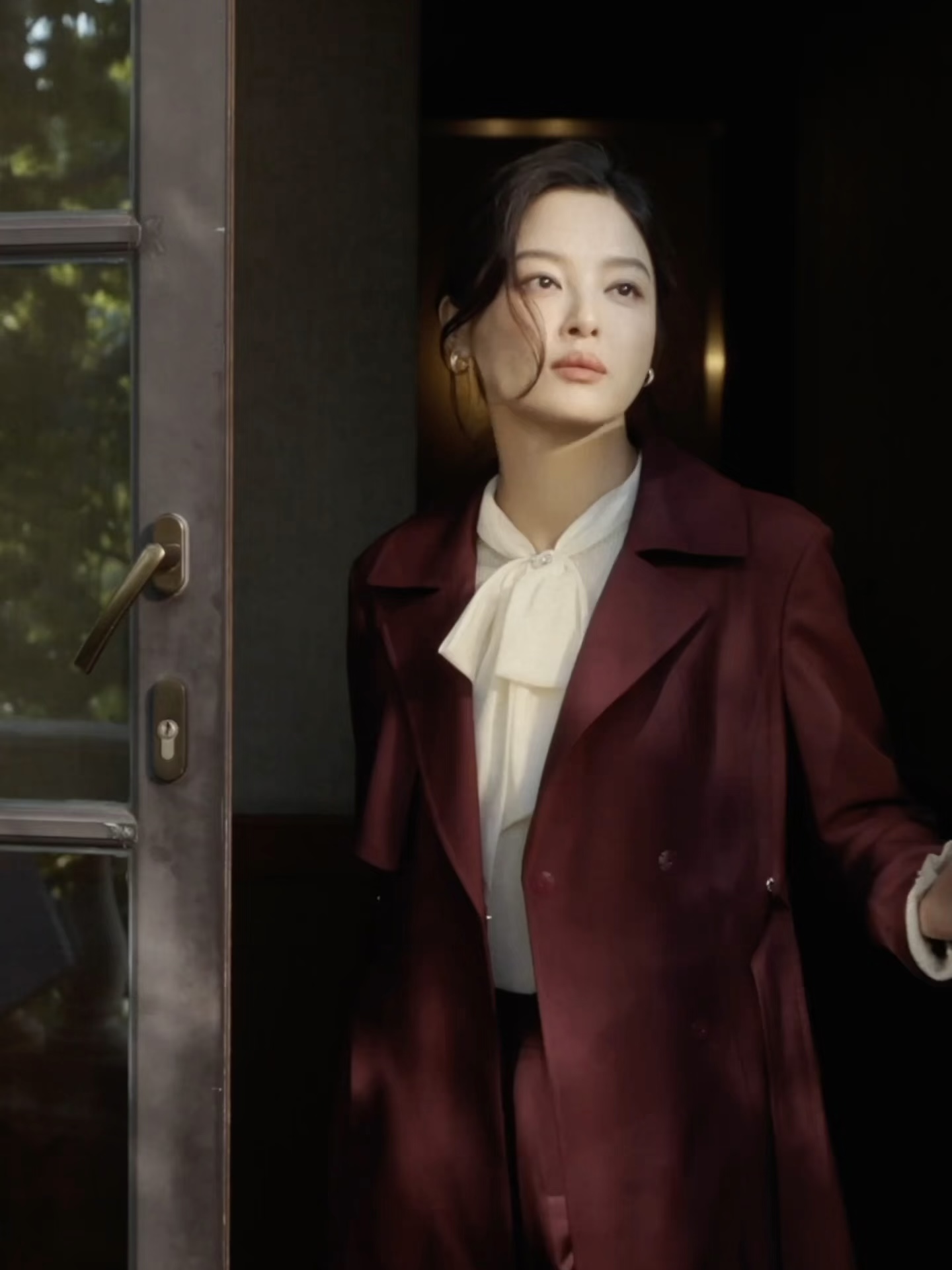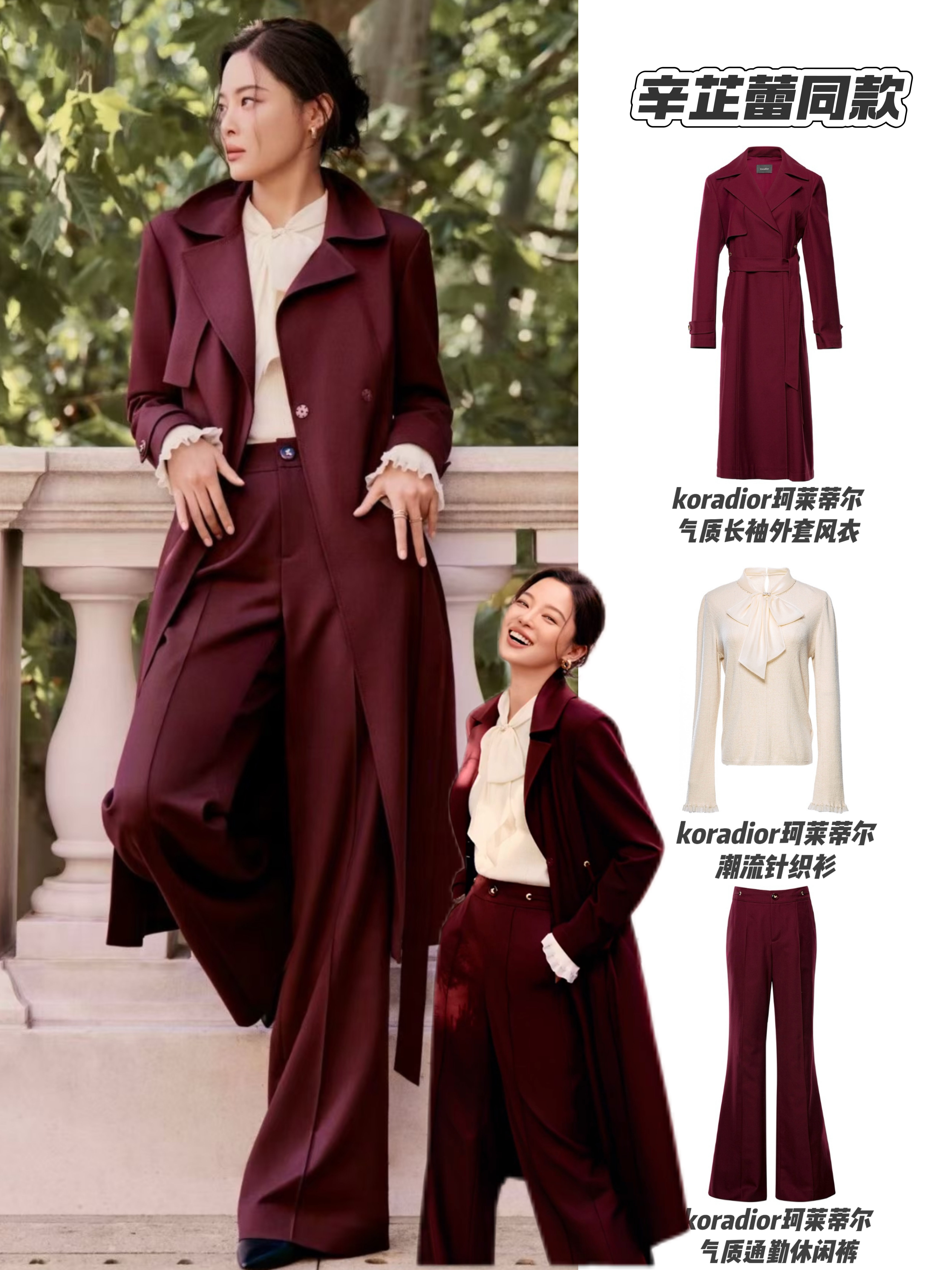 辛芷蕾这套穿搭是秋日氛围感与优雅气场的完美融合🍂 珂莱蒂尔酒红色风衣自带复古华贵感,阔腿裤更显比例优越。内搭的米白针织衫以蝴蝶结领和蕾丝袖口增添柔美感。整套造型既适合通勤,也能轻松驾驭秋日下午茶或轻熟风约会☕️