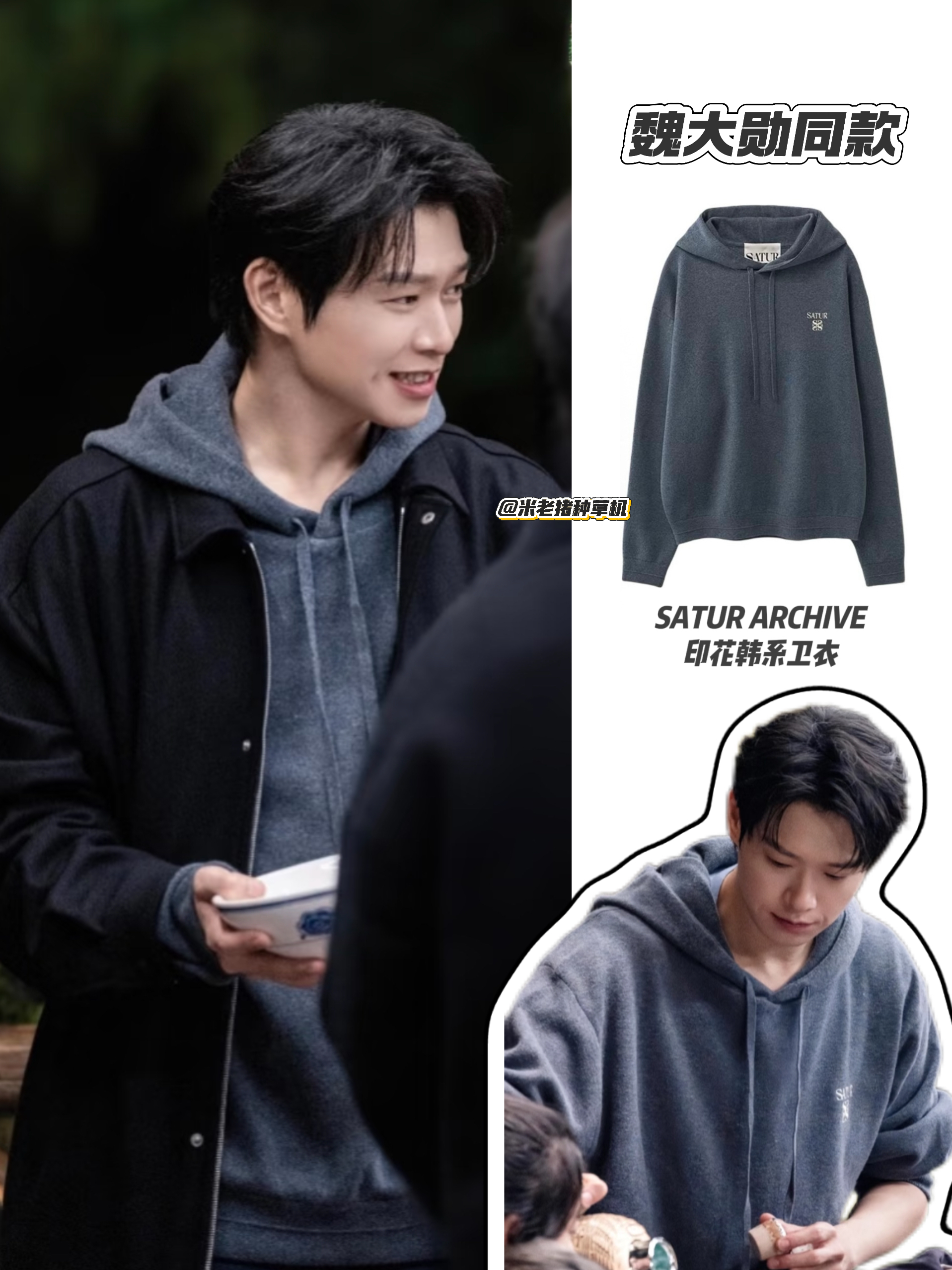 被魏大勋帅晕!这件炭灰卫衣把男友感焊在身上了 SATUR ARCHIVE的炭灰色连帽卫衣自带软糯质感,宽松版型慵懒随性,外搭一件极简黑色教大衣,在休闲中增添了利落层次。深浅灰黑的配色低调又显质感,把韩系松弛感焊在了身上,出门都会被要联系方式的程度🤩
