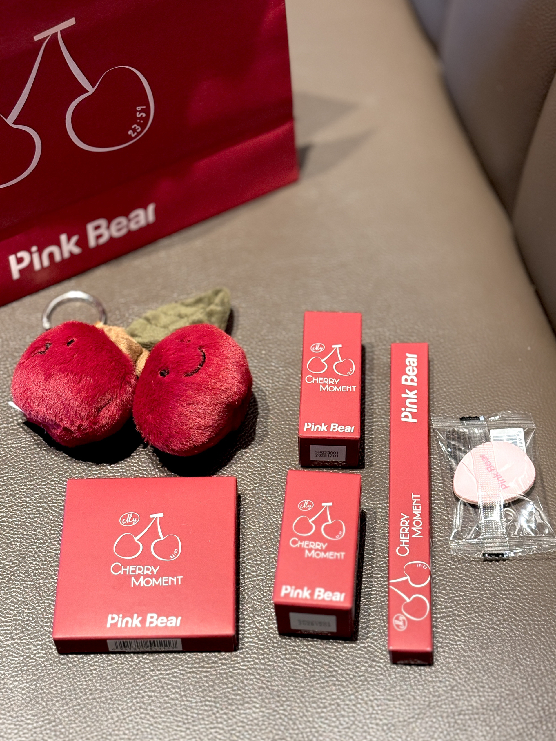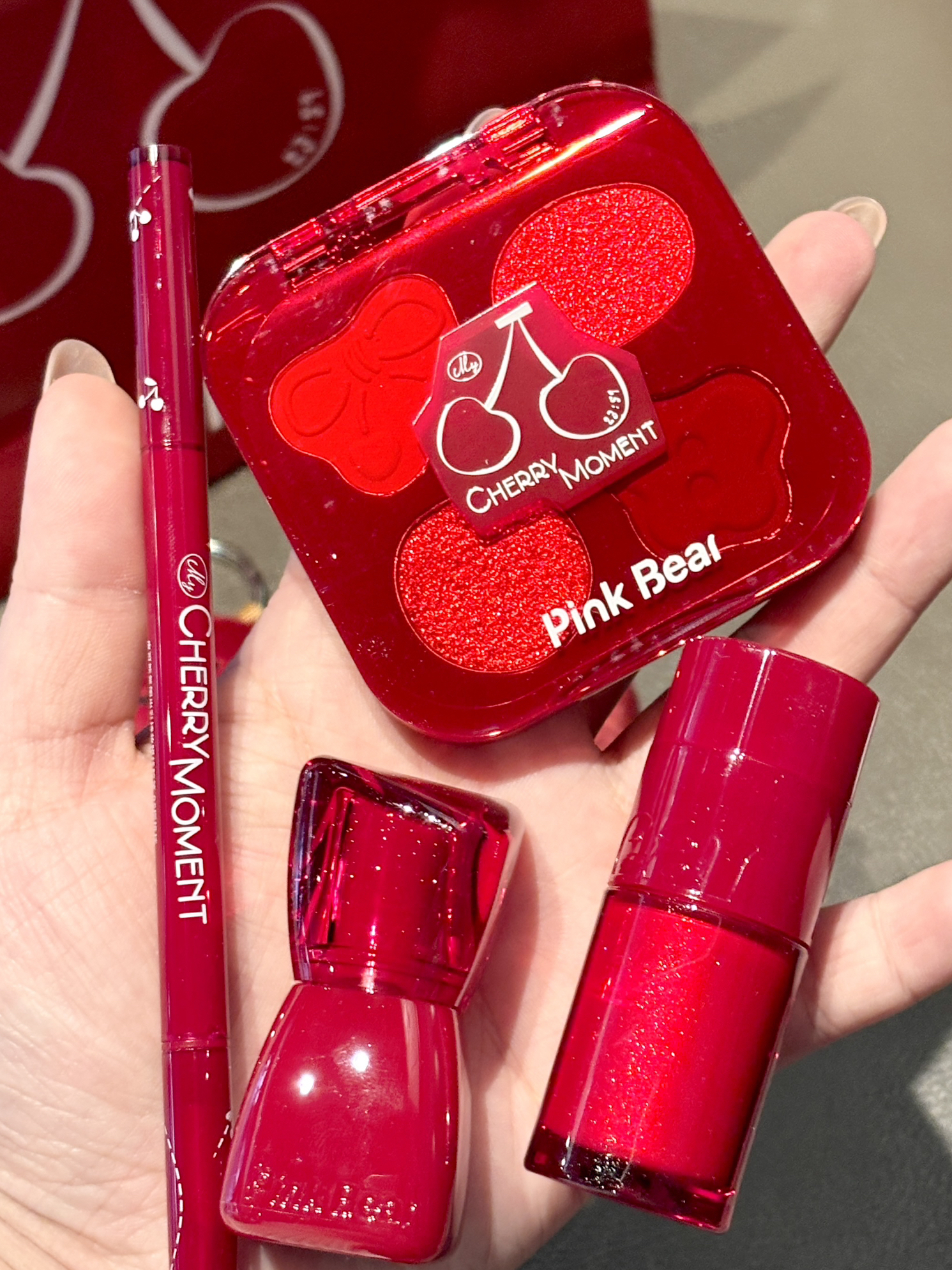Pinkbear你是懂女孩子的! 新年限定樱桃系列直接戳中我的心巴 红樱桃包装敲喜庆 新年氛围感拉满 丰唇蜜涂完是嫩嘟嘟的水光唇 润而不粘超舒服 干唇爱了 眼影盘是低饱和粉棕调 粉质细腻不飞粉 日常通勤画贼合适 眼线胶笔顺滑不晕染 手残党也能轻松画好眼妆 还有多用霜blingbling的可闪啦 咱就是说新年画个元气樱桃妆直接搞定 自用或者当新年礼物也合适呢~