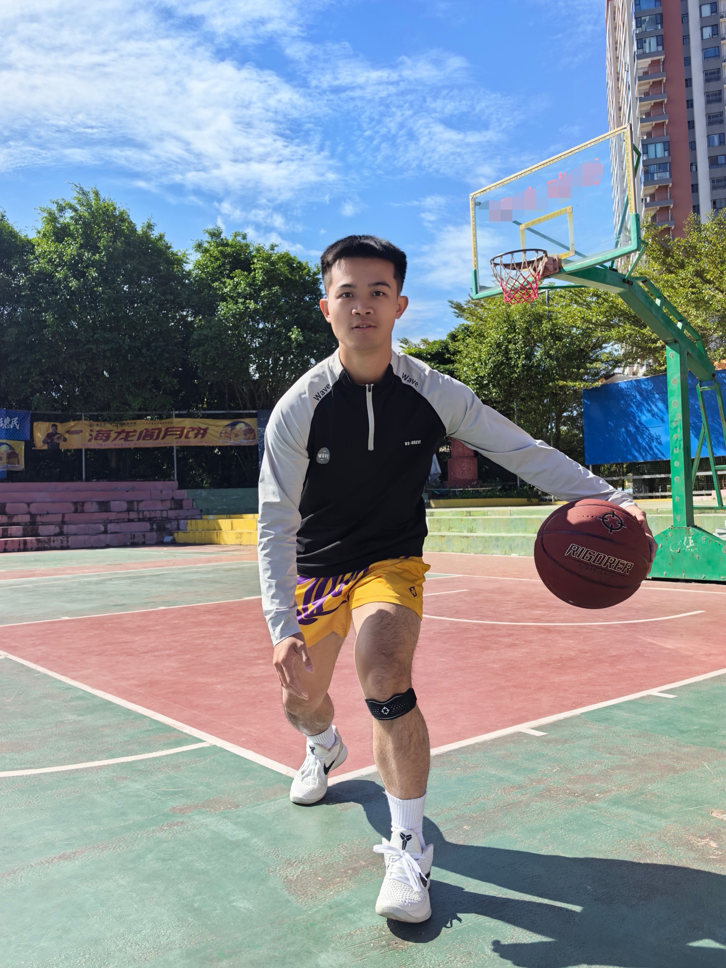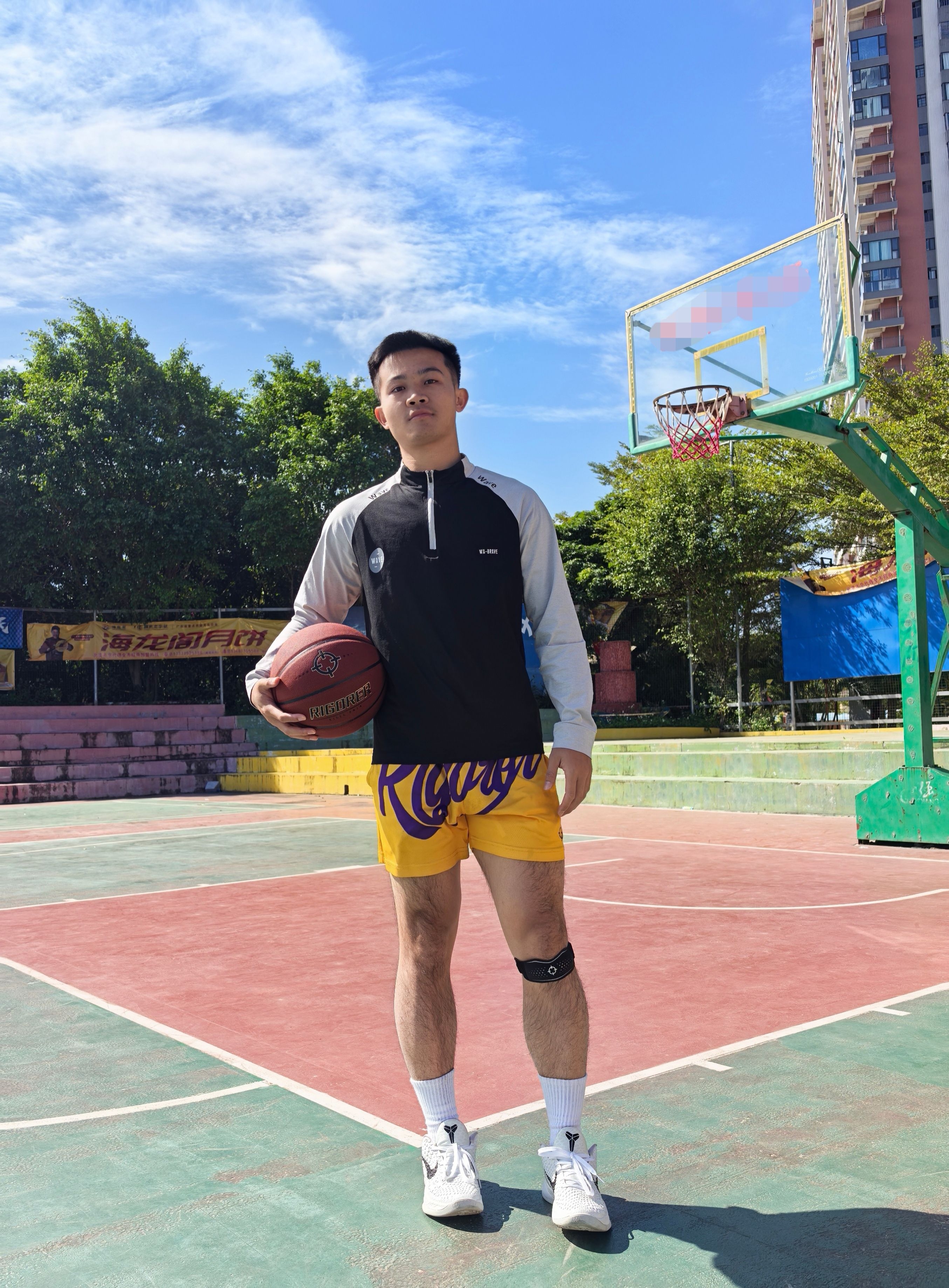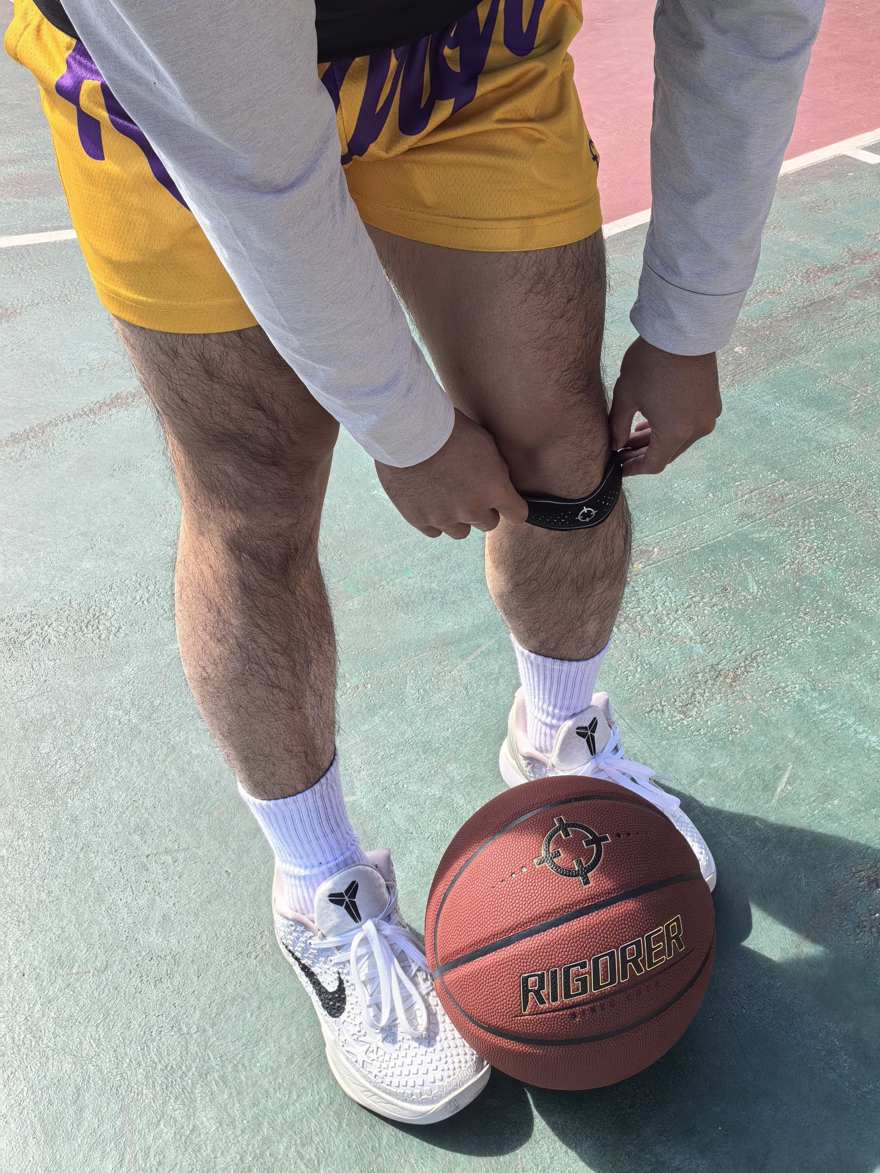 今天这套准者 RIGORER 打球装备主打的就是简单,但实用性拉满 手上拿着我超喜欢的一个篮球,经典的红棕配色,简约大气! 重要的是手感相当炸裂,这PU表皮平时训练、比赛打起来那叫一个顺手,运球很黏手,投篮很丝滑 防尘黑科技用这颗球在室内场和外场都适应!膝盖上面的髌骨带可好用了,魔术贴调节大小真方便,简单但实用!做好运动防护保护好膝盖健康打球