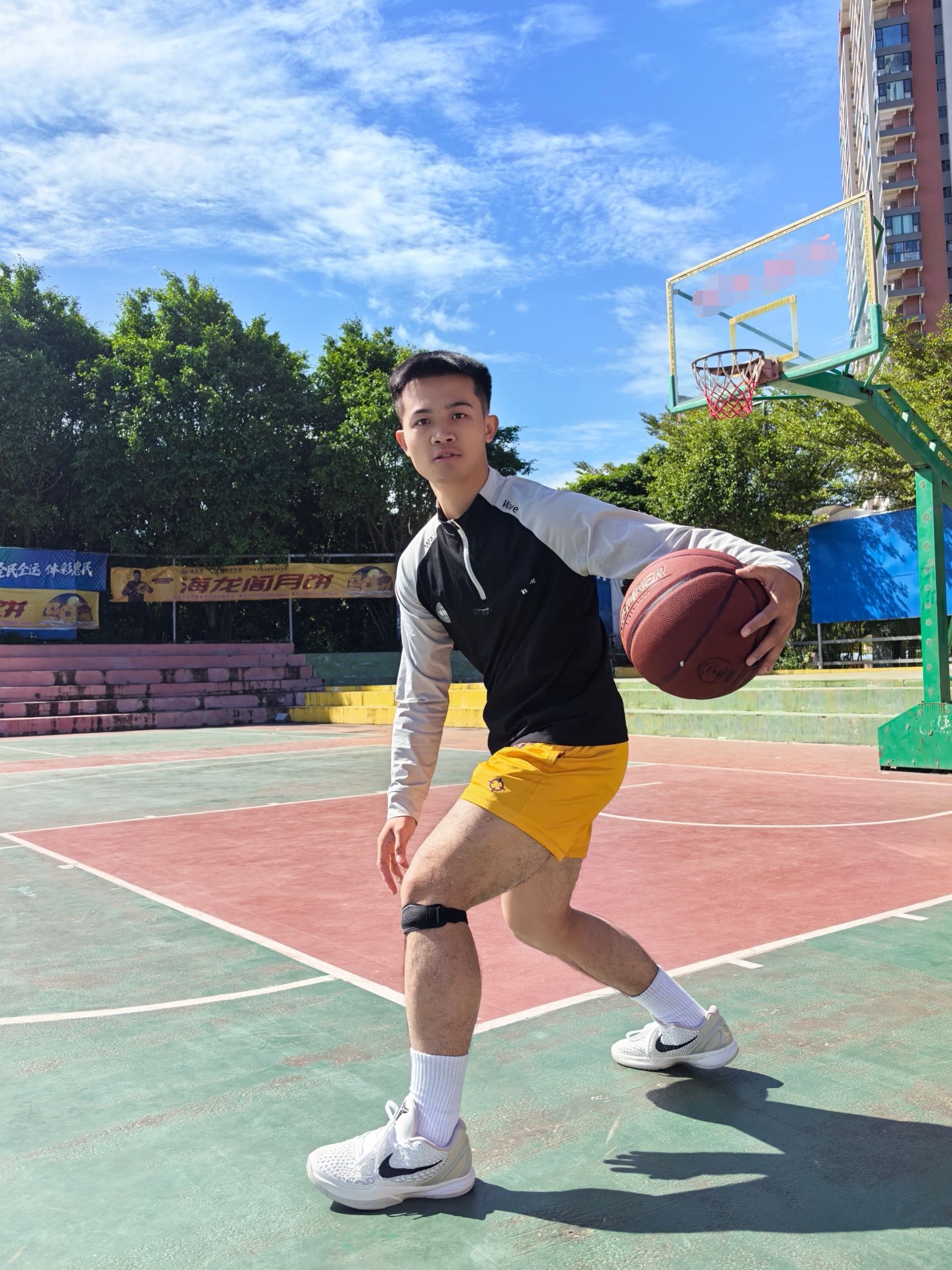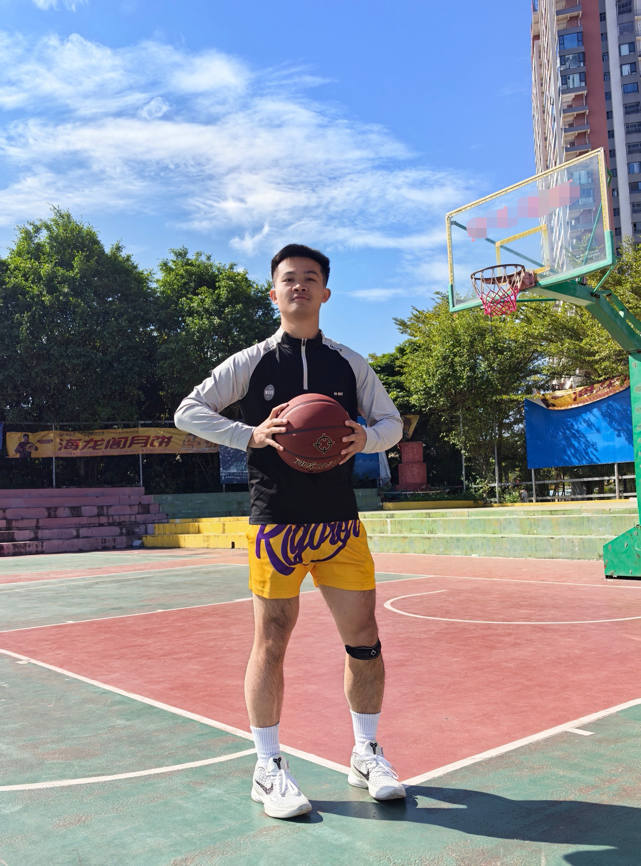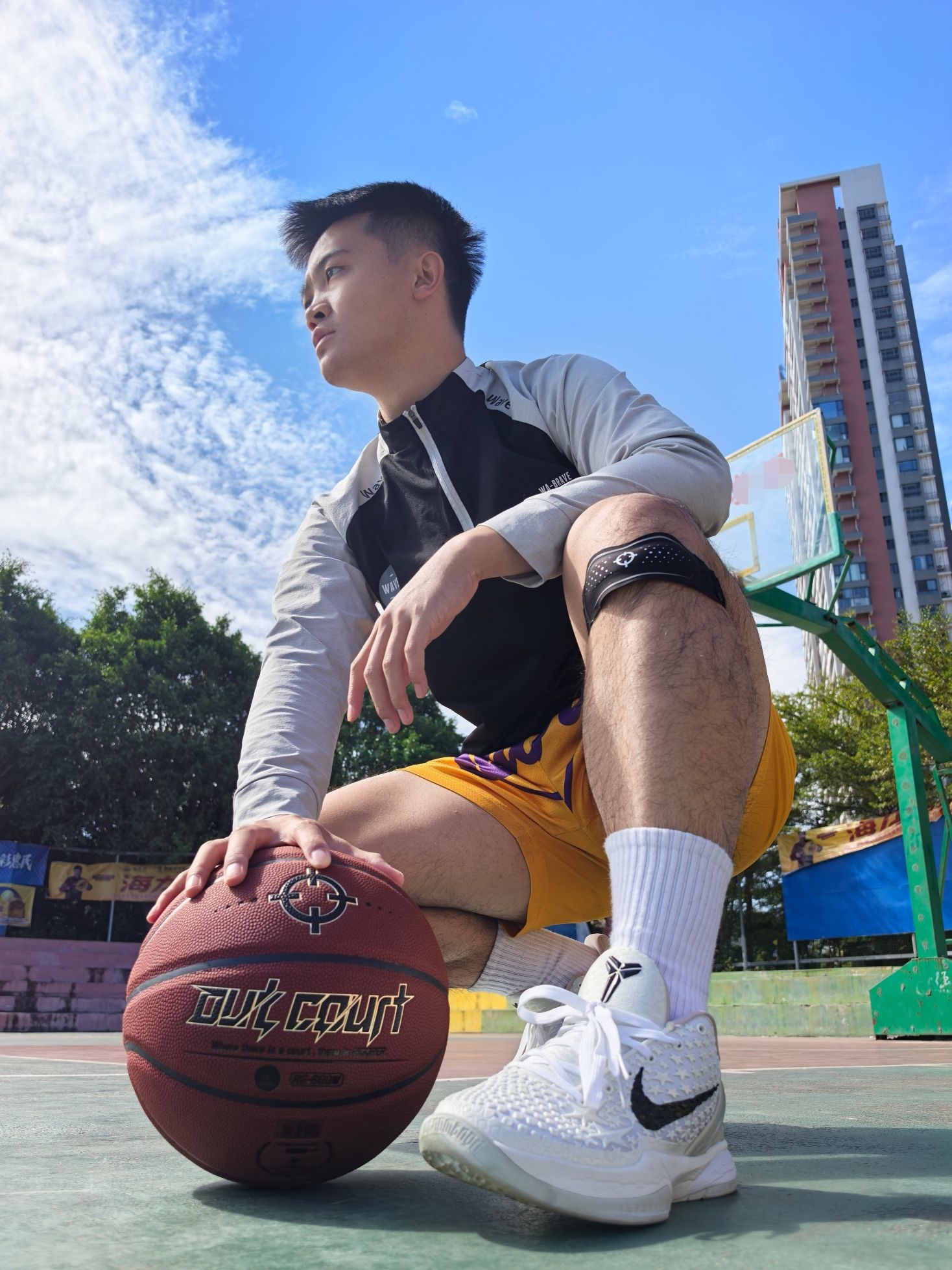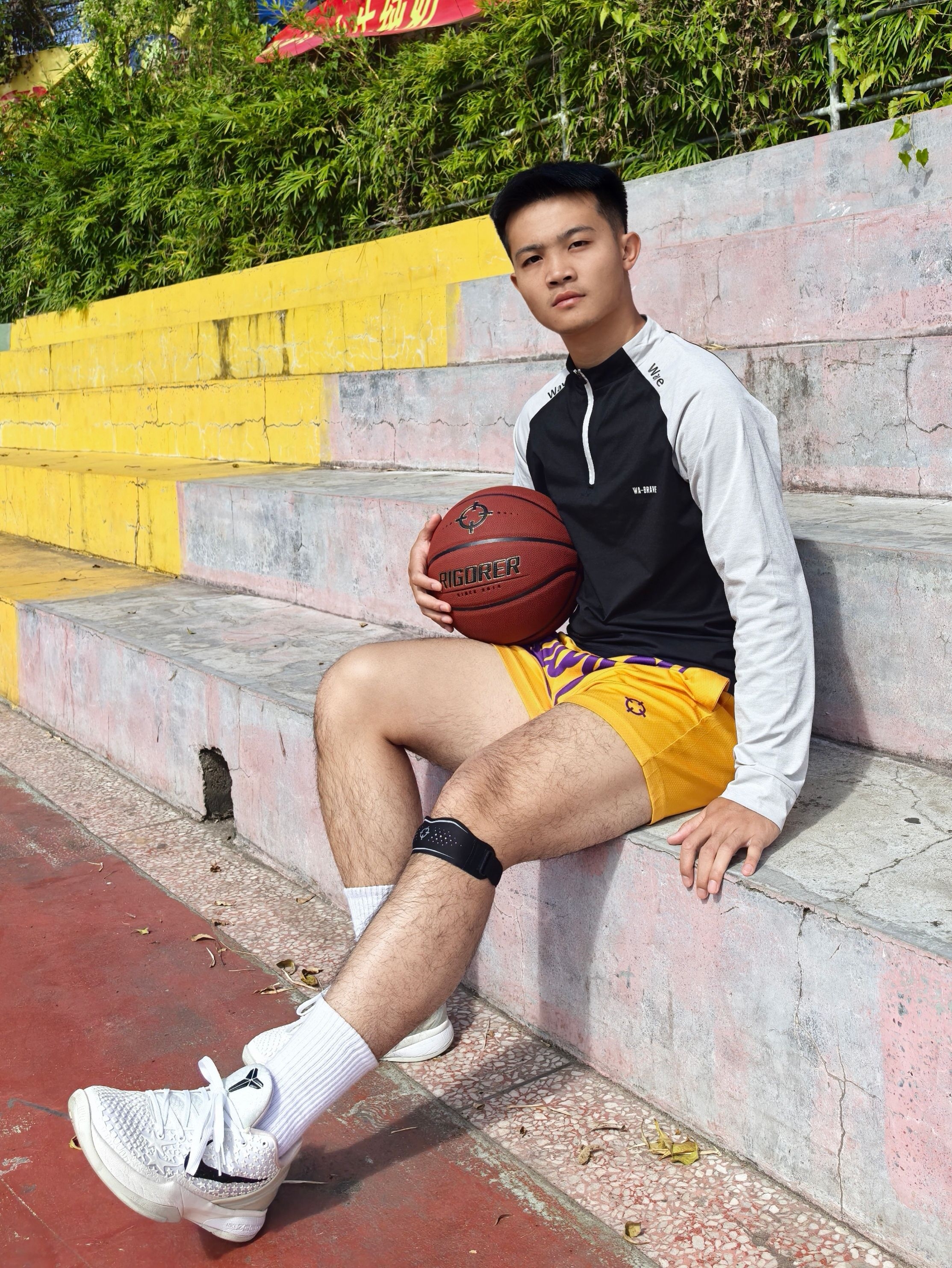 今天这套准者 RIGORER 打球装备主打的就是简单,但实用性拉满 手上拿着我超喜欢的一个篮球,经典的红棕配色,简约大气! 重要的是手感相当炸裂,这PU表皮平时训练、比赛打起来那叫一个顺手,运球很黏手,投篮很丝滑 防尘黑科技用这颗球在室内场和外场都适应!膝盖上面的髌骨带可好用了,魔术贴调节大小真方便,简单但实用!做好运动防护保护好膝盖健康打球