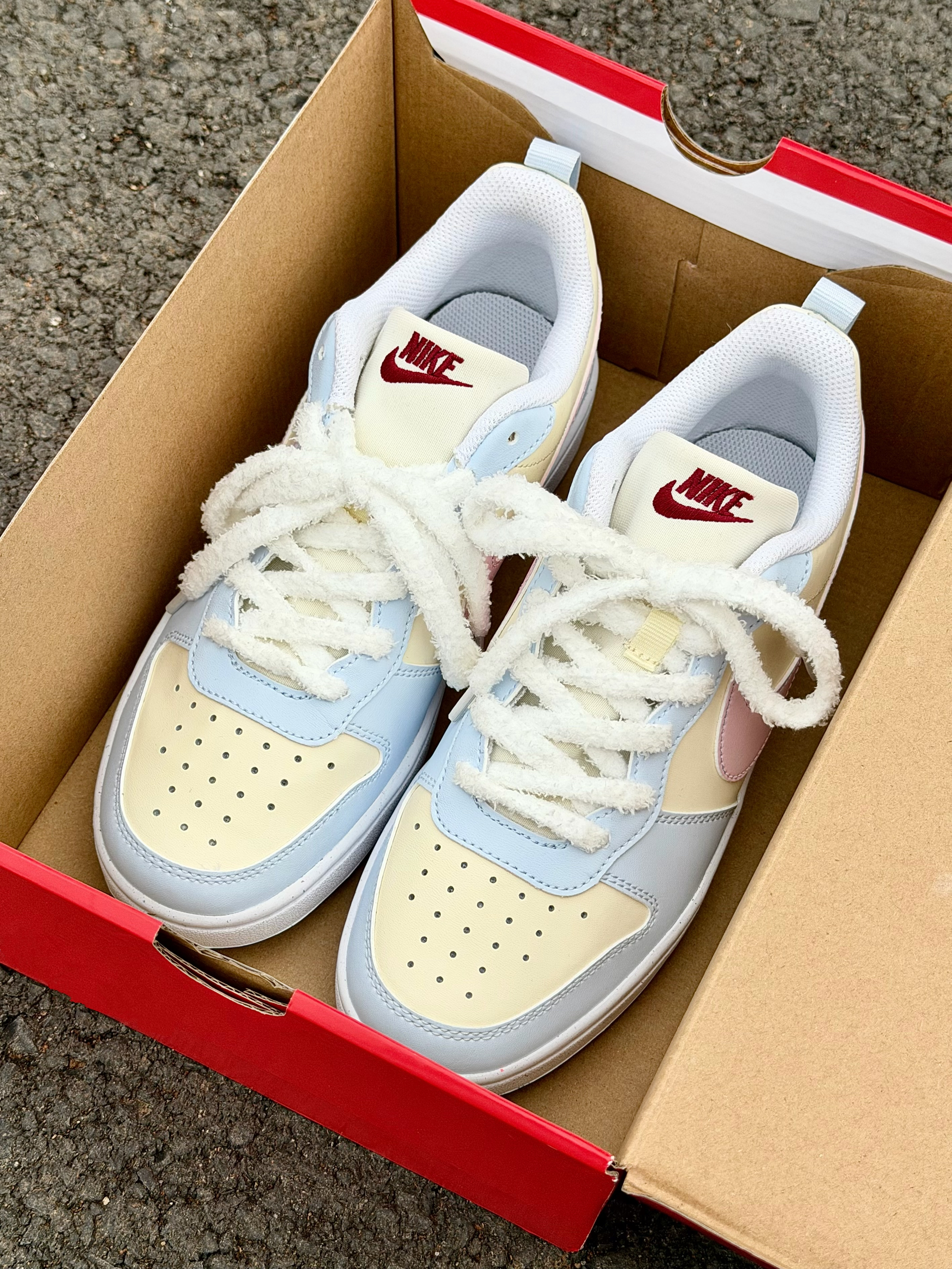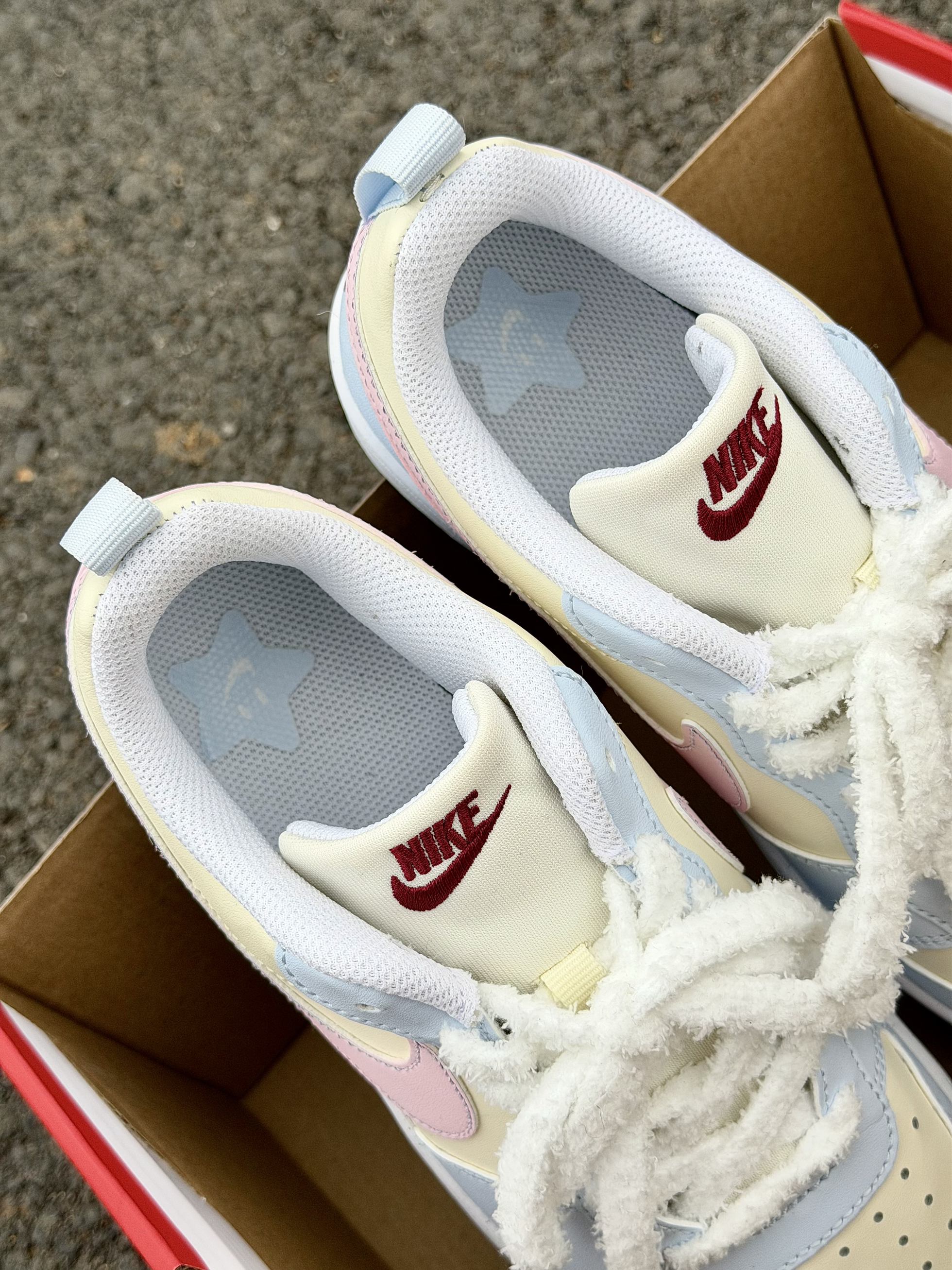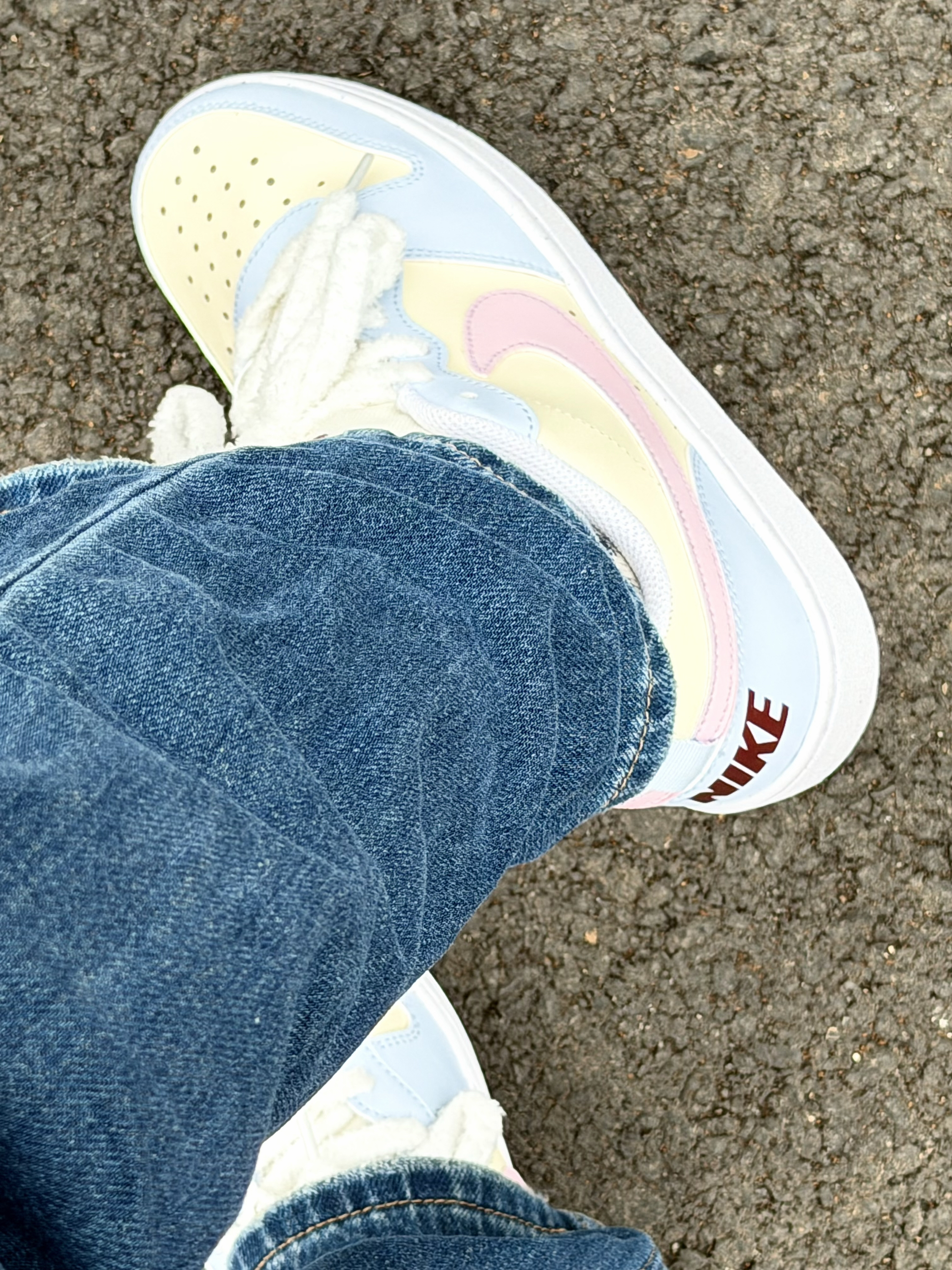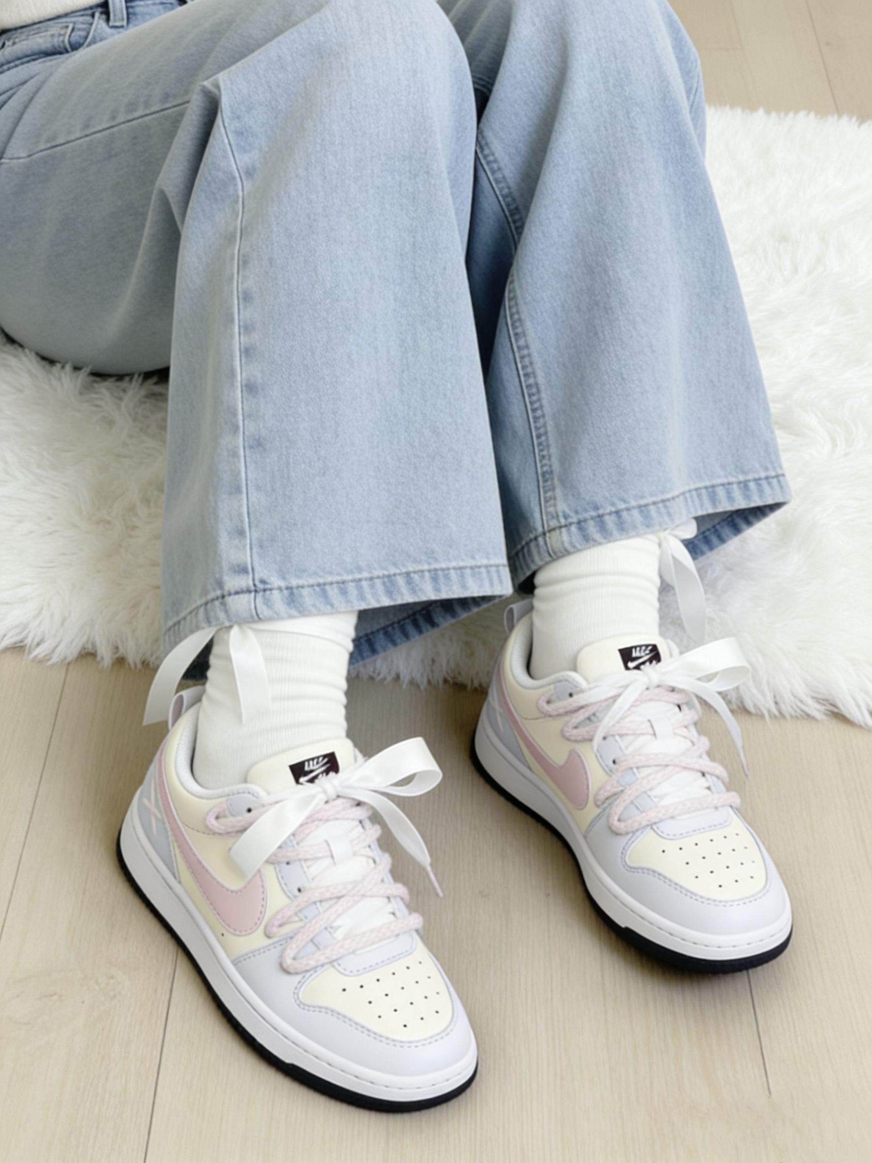 Nike 这双奶乎乎的浅色系板鞋好 ins 啊~ 浅蓝色搭奶黄色➕粉色 logo 这个配色忒温柔了 完全在我的心动点上 尊嘟好喜欢啊! 皮革材质舒适透气 也好打理不用担心✌️ 搭配毛茸茸的鞋带还挺特别 但有点不耐脏 我个人还是可以接受的 好看就够了😁 上脚的脚感也是软软的很舒服 走一天下来也没有不舒服的感觉不错✌️