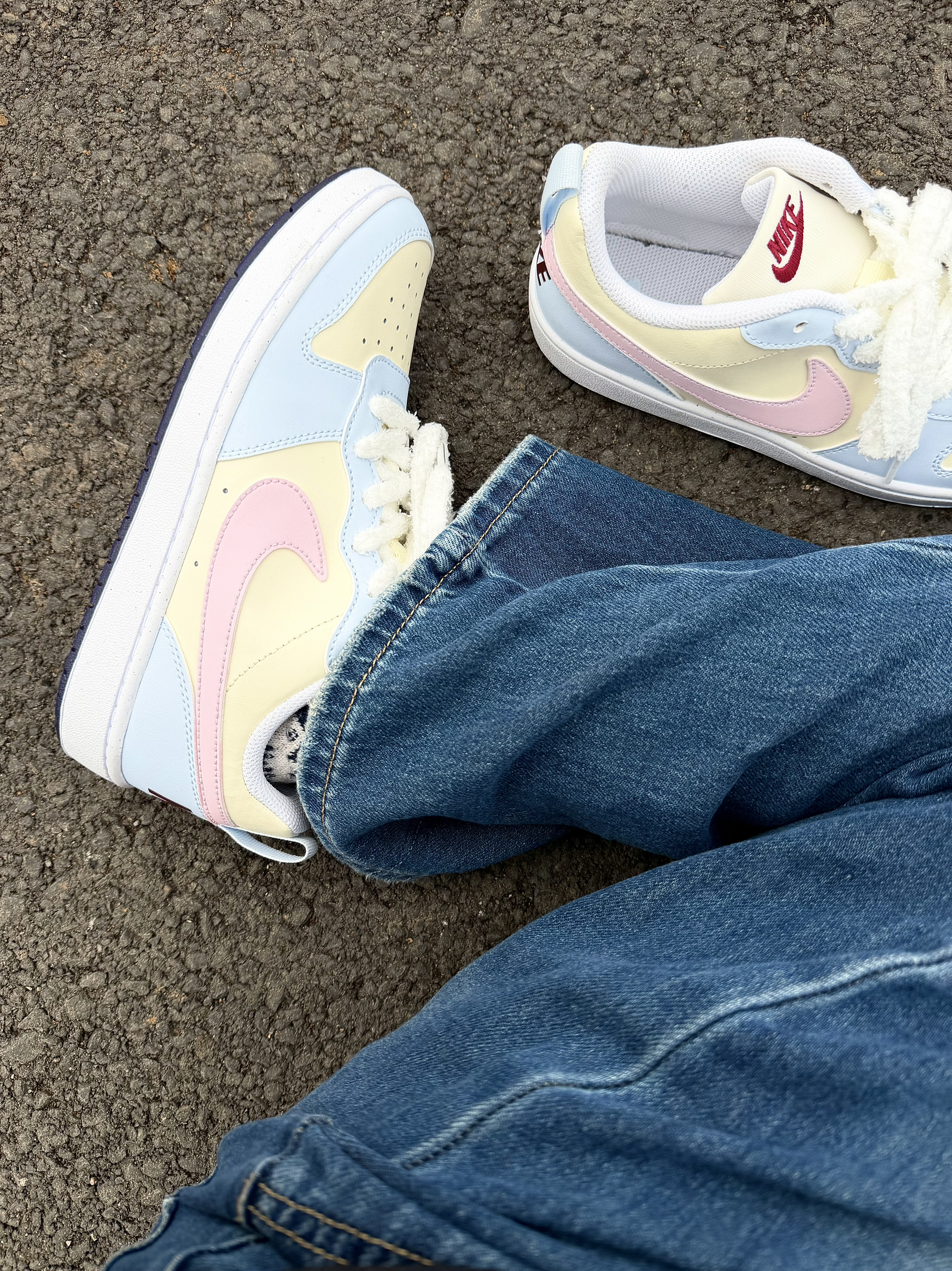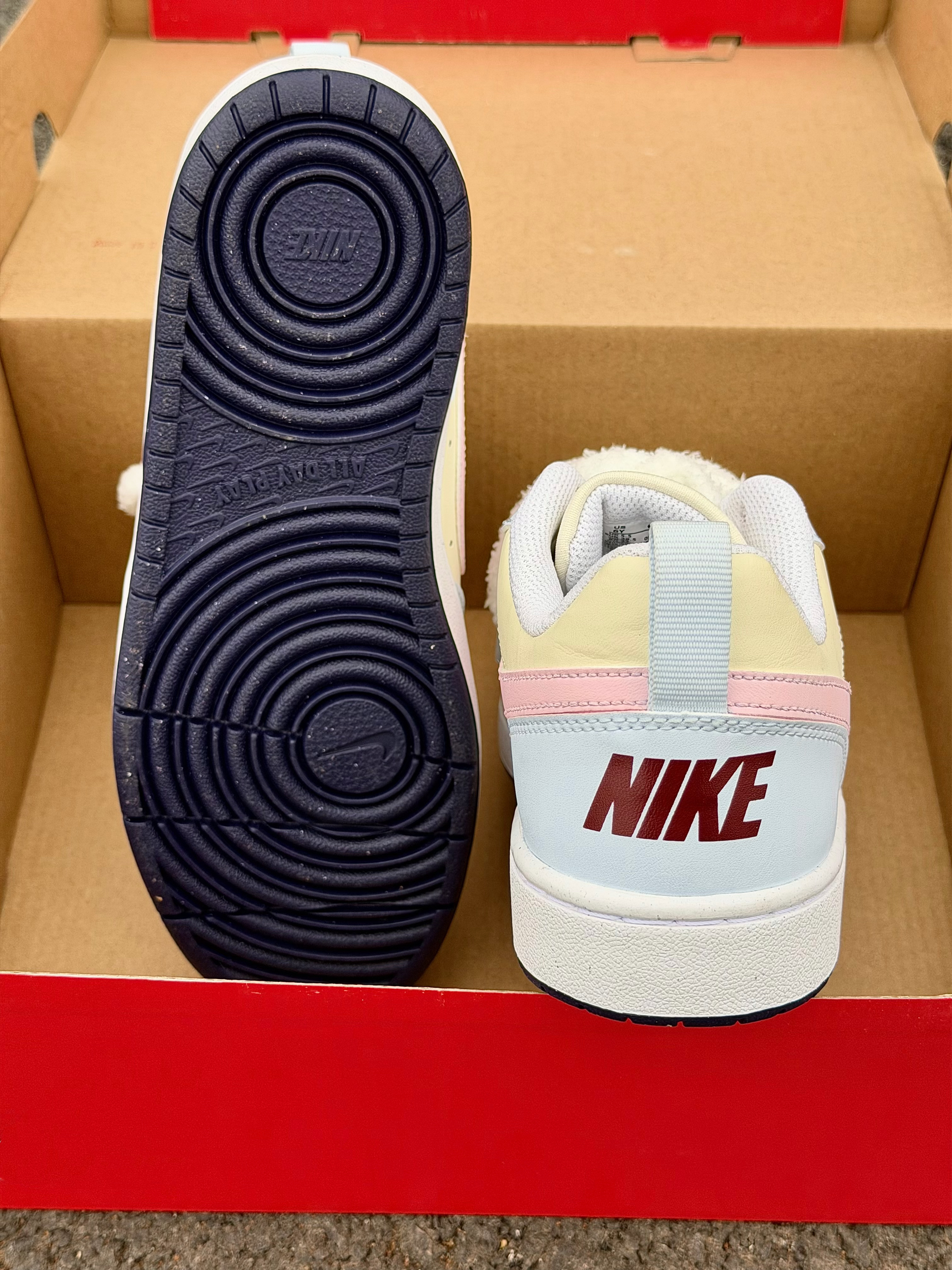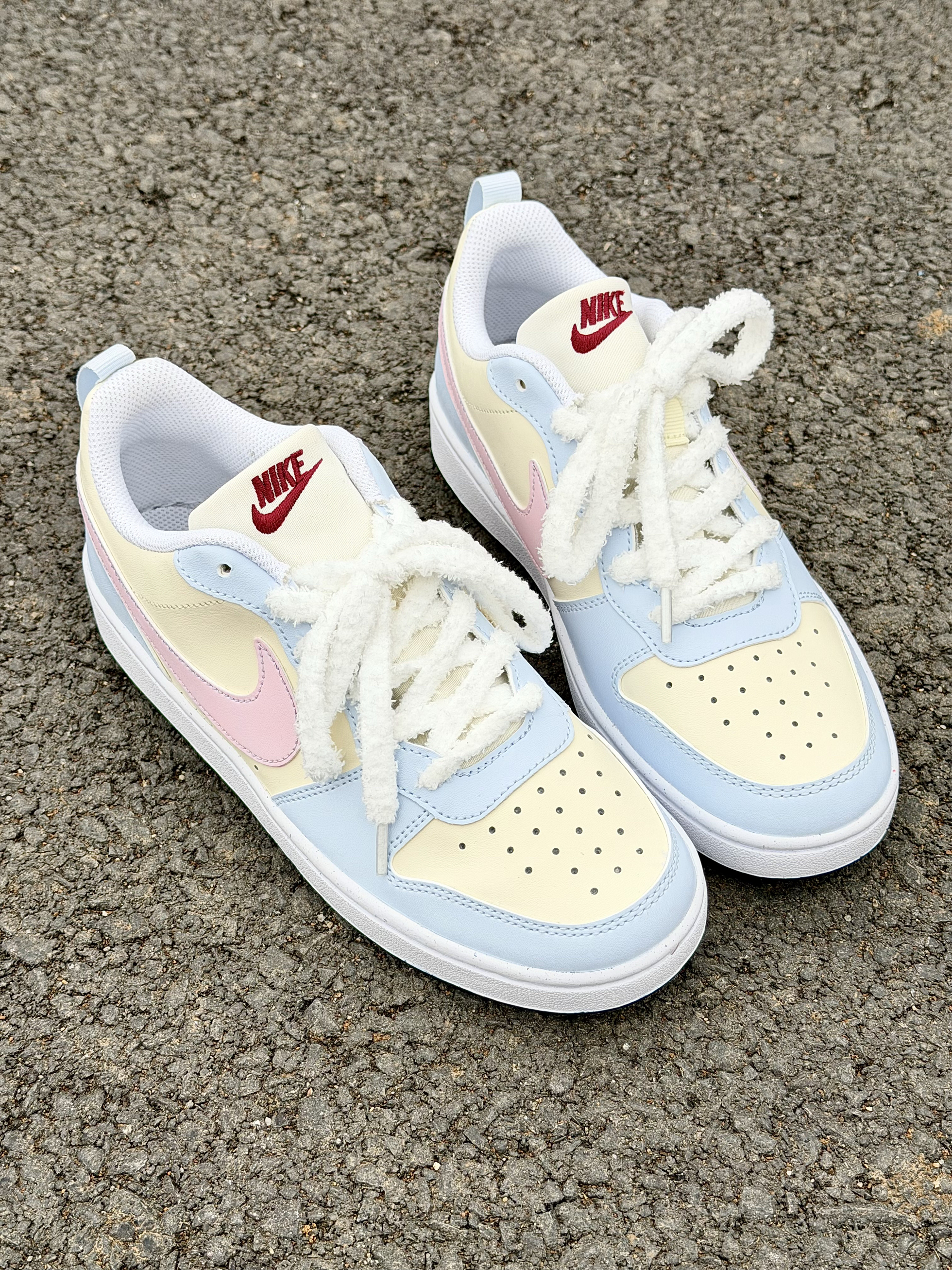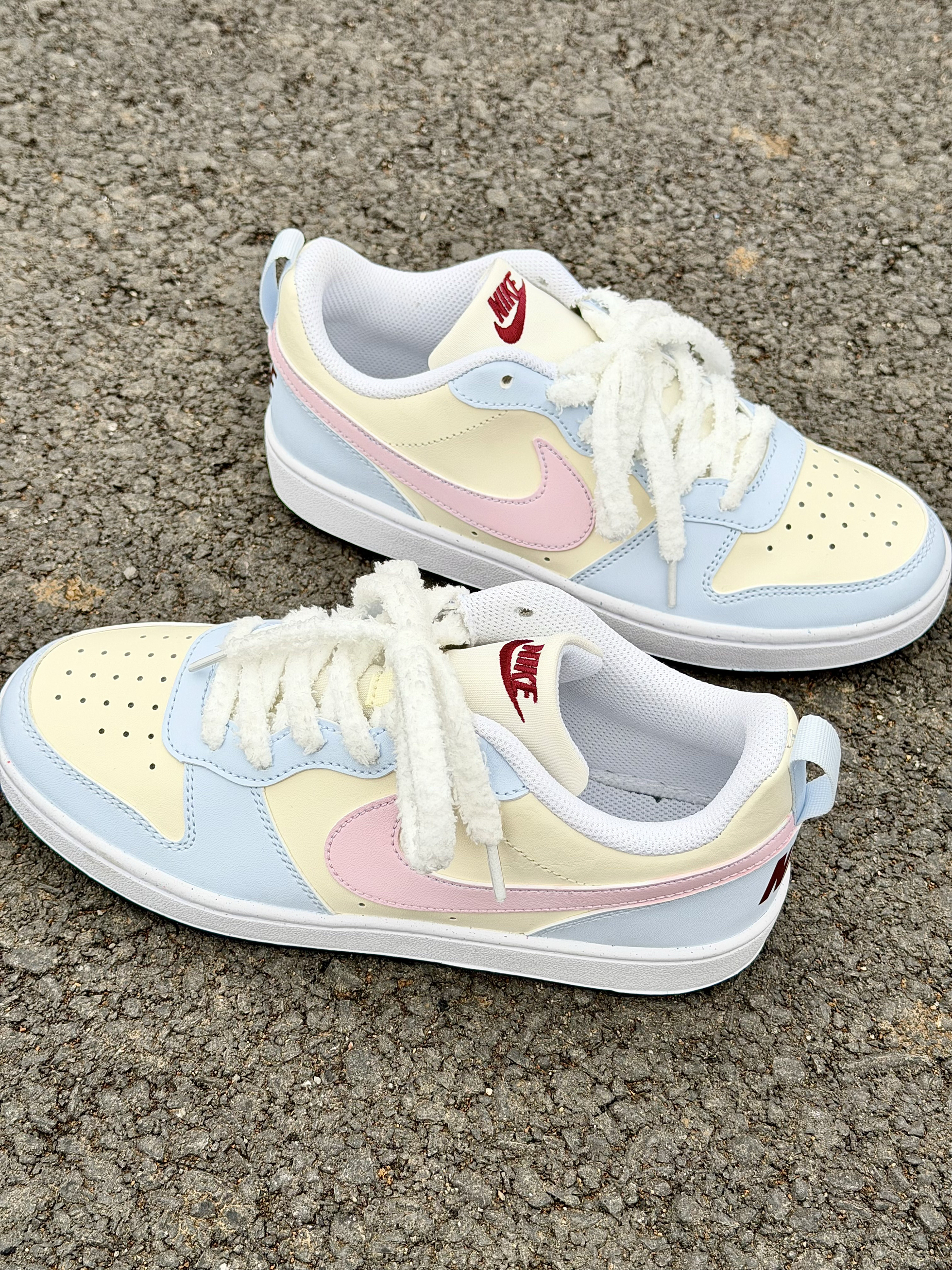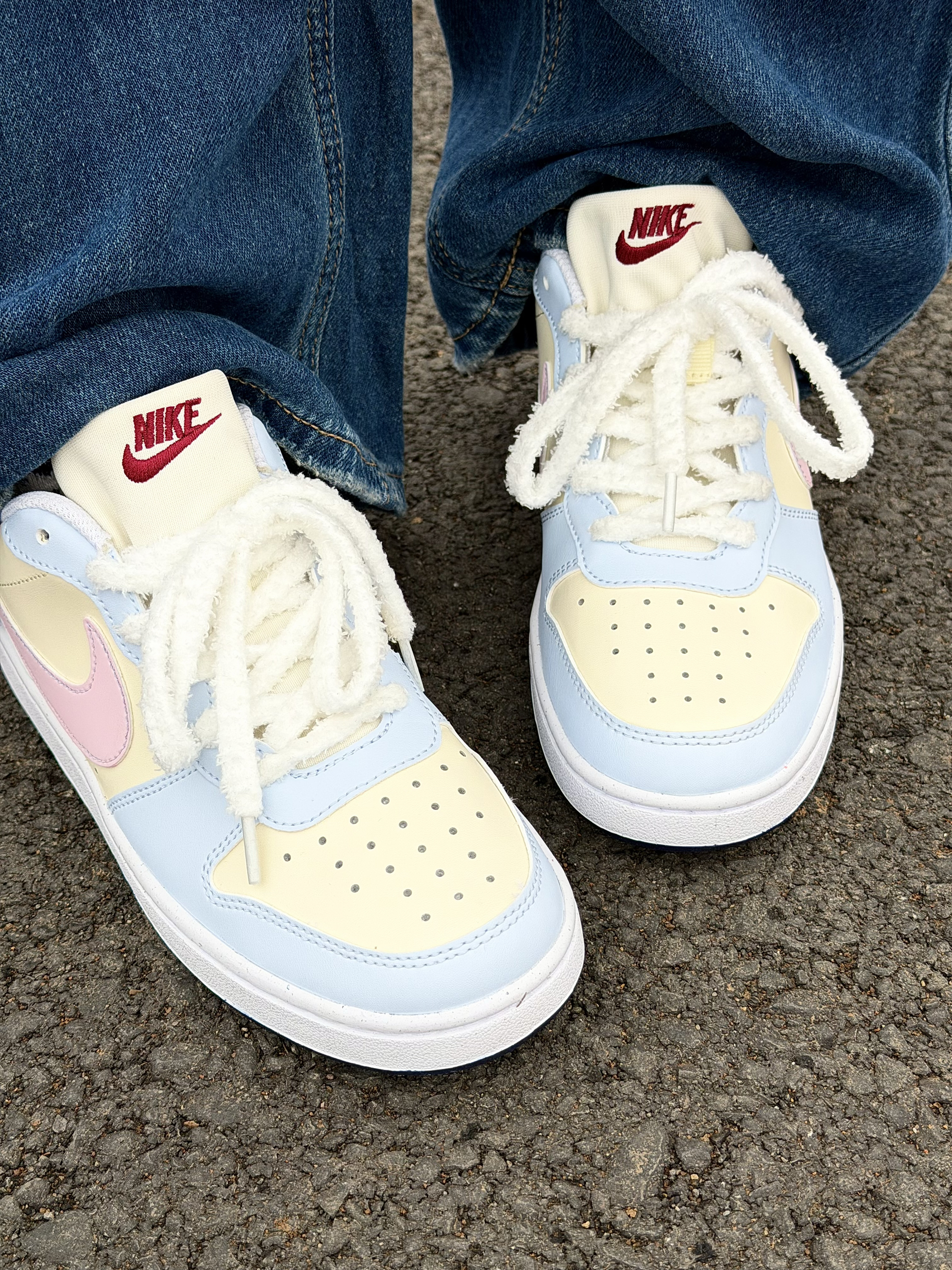 Nike 这双奶乎乎的浅色系板鞋好 ins 啊~ 浅蓝色搭奶黄色➕粉色 logo 这个配色忒温柔了 完全在我的心动点上 尊嘟好喜欢啊! 皮革材质舒适透气 也好打理不用担心✌️ 搭配毛茸茸的鞋带还挺特别 但有点不耐脏 我个人还是可以接受的 好看就够了😁 上脚的脚感也是软软的很舒服 走一天下来也没有不舒服的感觉不错✌️