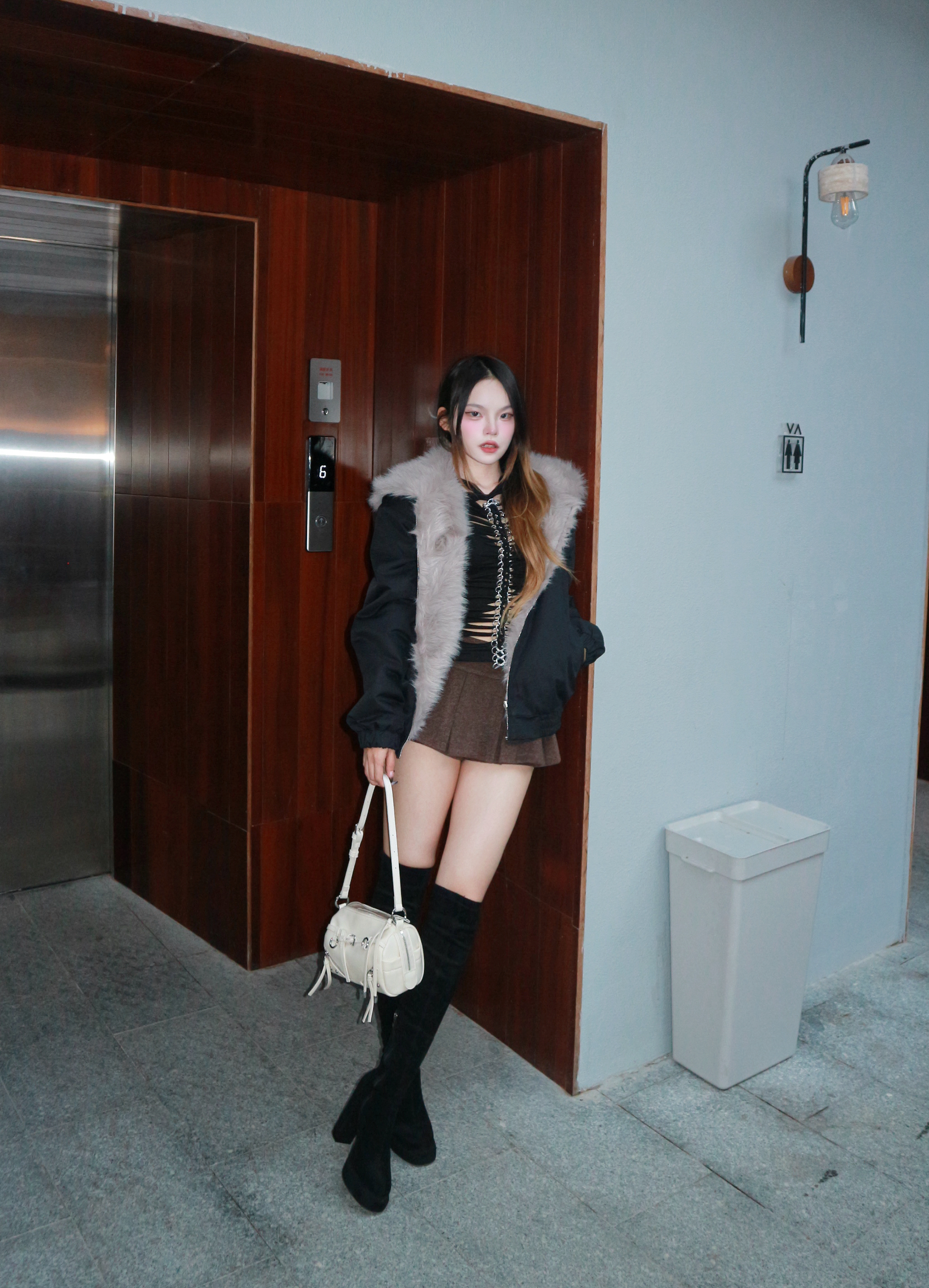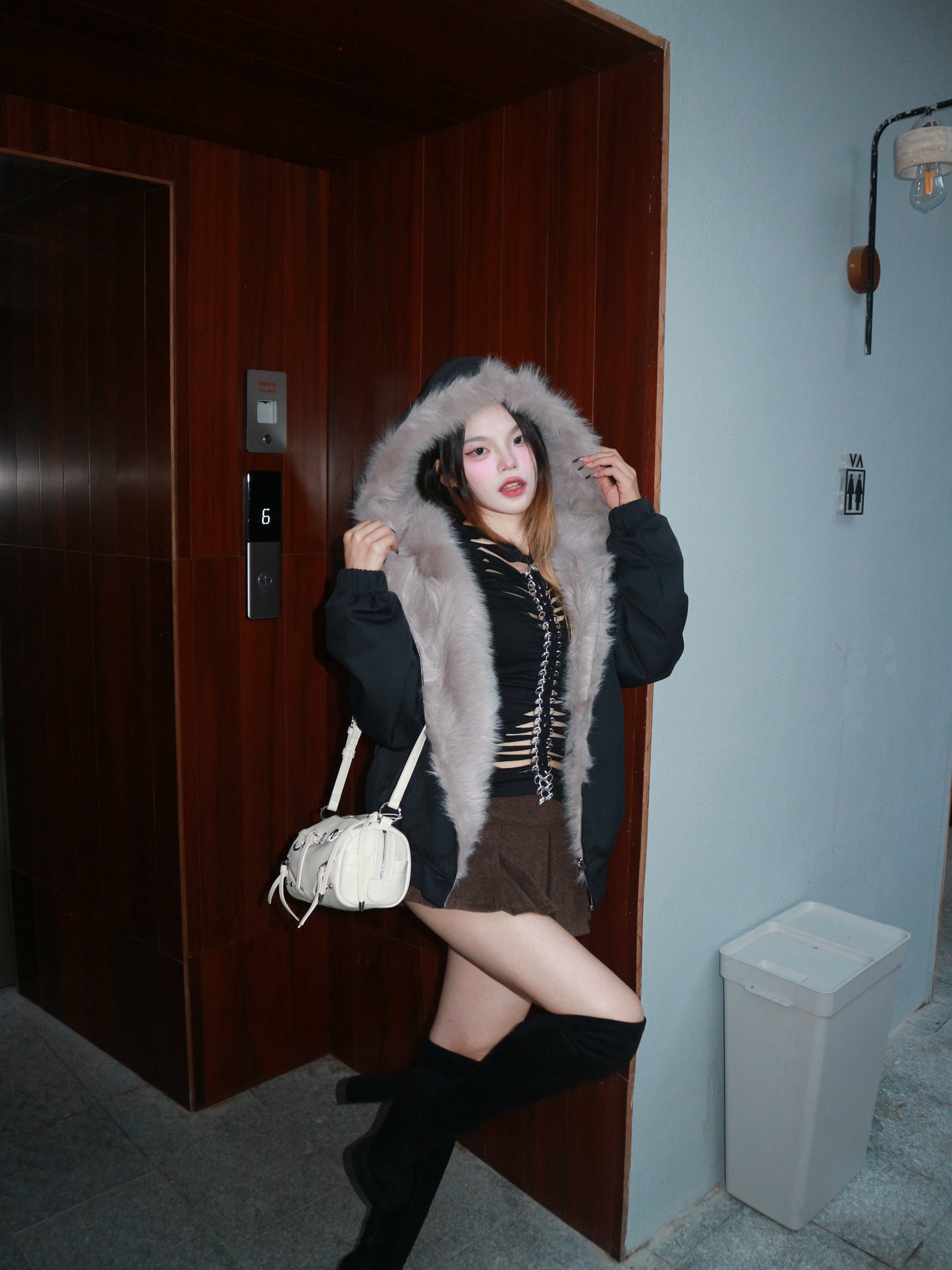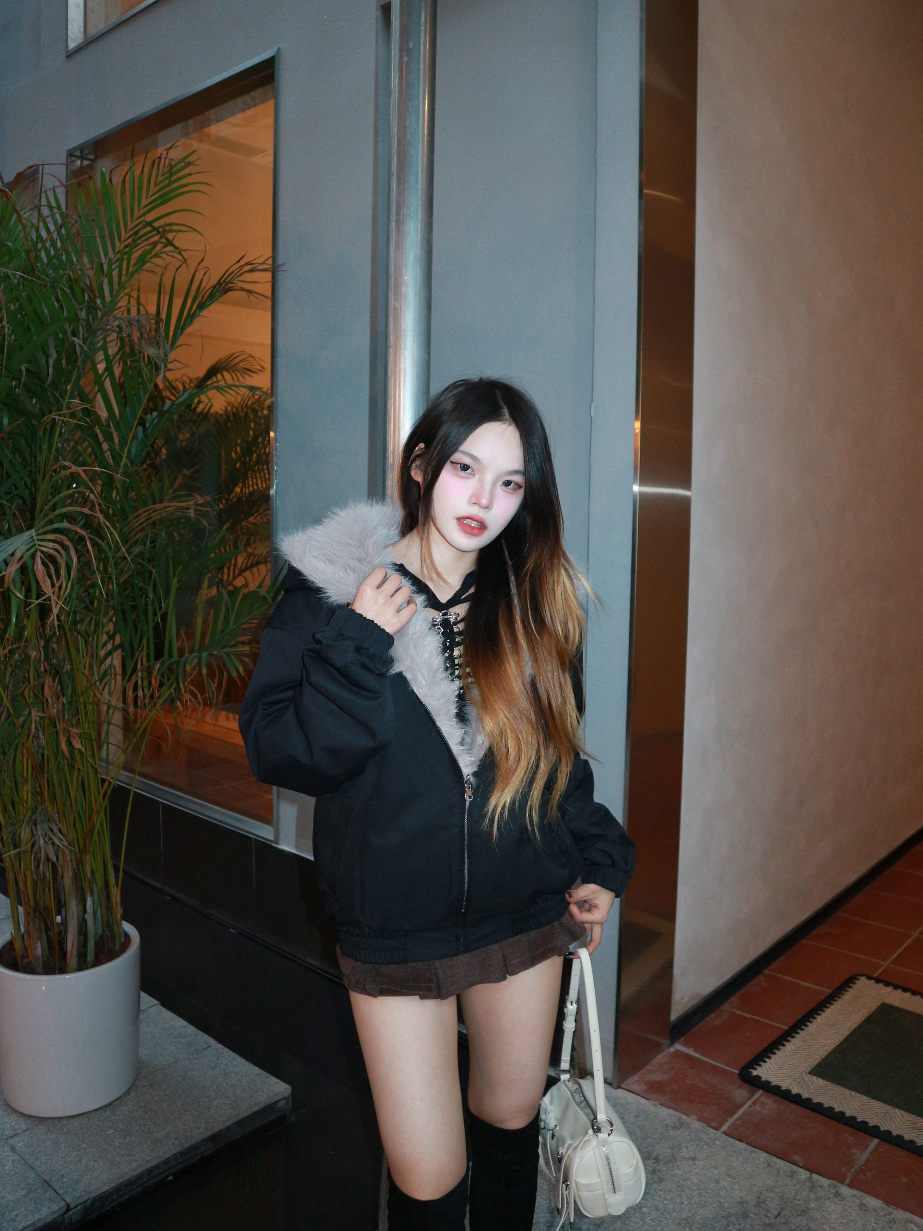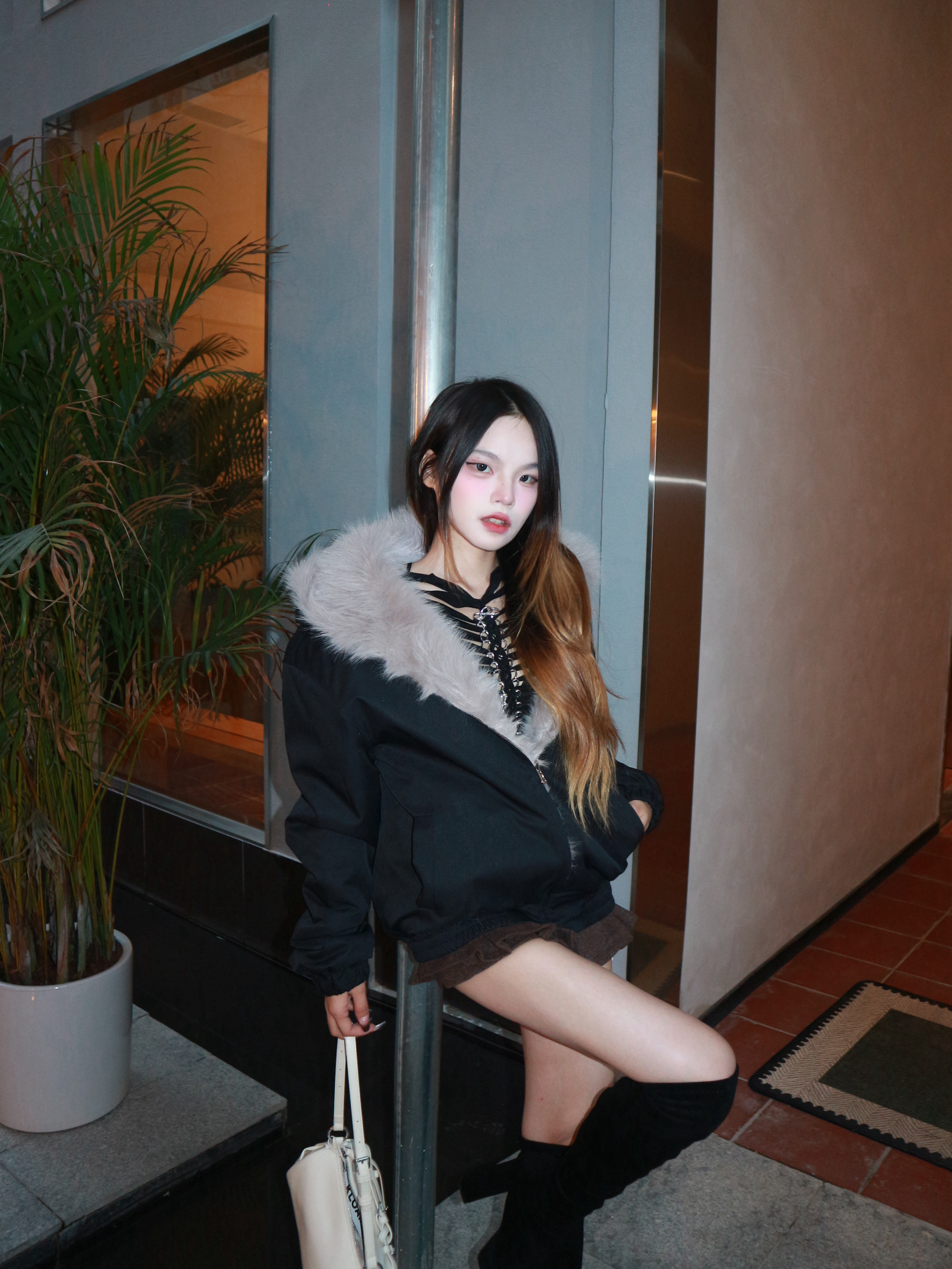 今天是又暖又辣的黑系穿搭 🖤 这件大毛领外套真的是我的过冬神器,宽松版型藏肉又显瘦,灰色大毛领一整个把氛围感拉满~ 内搭挖空小上衣+超短裙+过膝靴,背上白色小包包中和一下酷感,甜酷平衡刚刚好❄️ 165/96 我穿的是m
