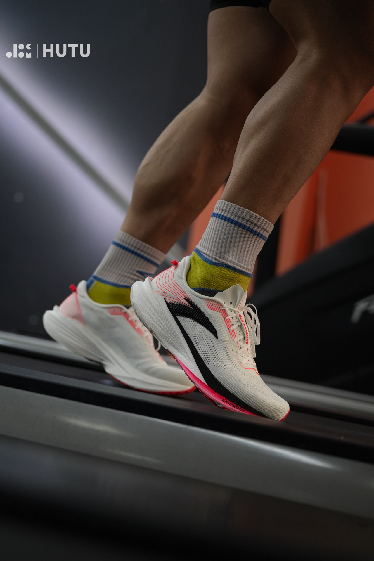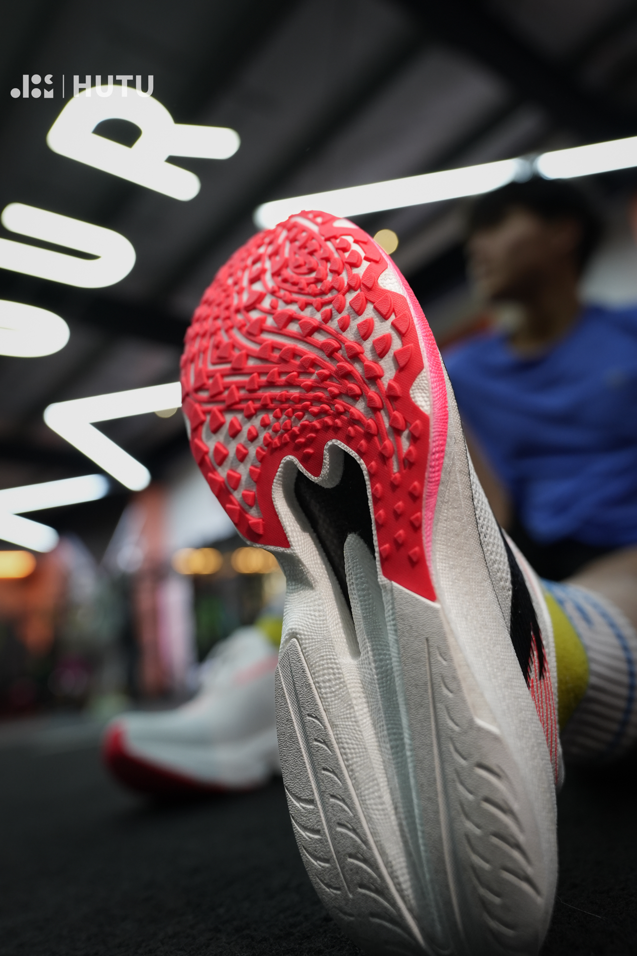 塑胶先锋2单只210g的重量让我每一步都像在贴地滑行。碳氮一体成型的中底反馈很直接,前掌蹬地时的回弹感非常扎实,就像小弹簧一样,82.8%的能量回归率不是虚标。后跟的弦科技支撑很稳,急停变向时没有丝毫晃动感。KPU齿钉抓地力在塑胶跑道上完全够用,6mm的落差对我这种前掌跑者也很友好。但是大底耐磨性还需要长测验证,你们想不想看我长测?#低头拍跑鞋