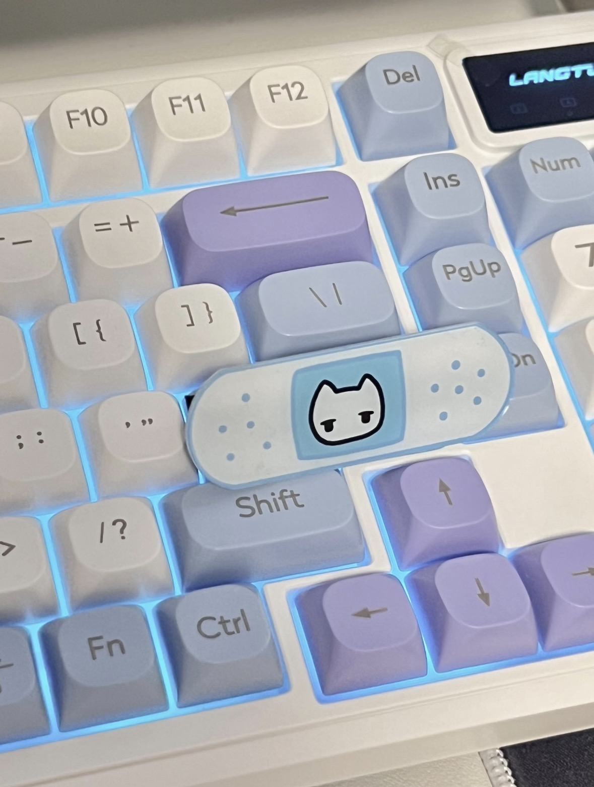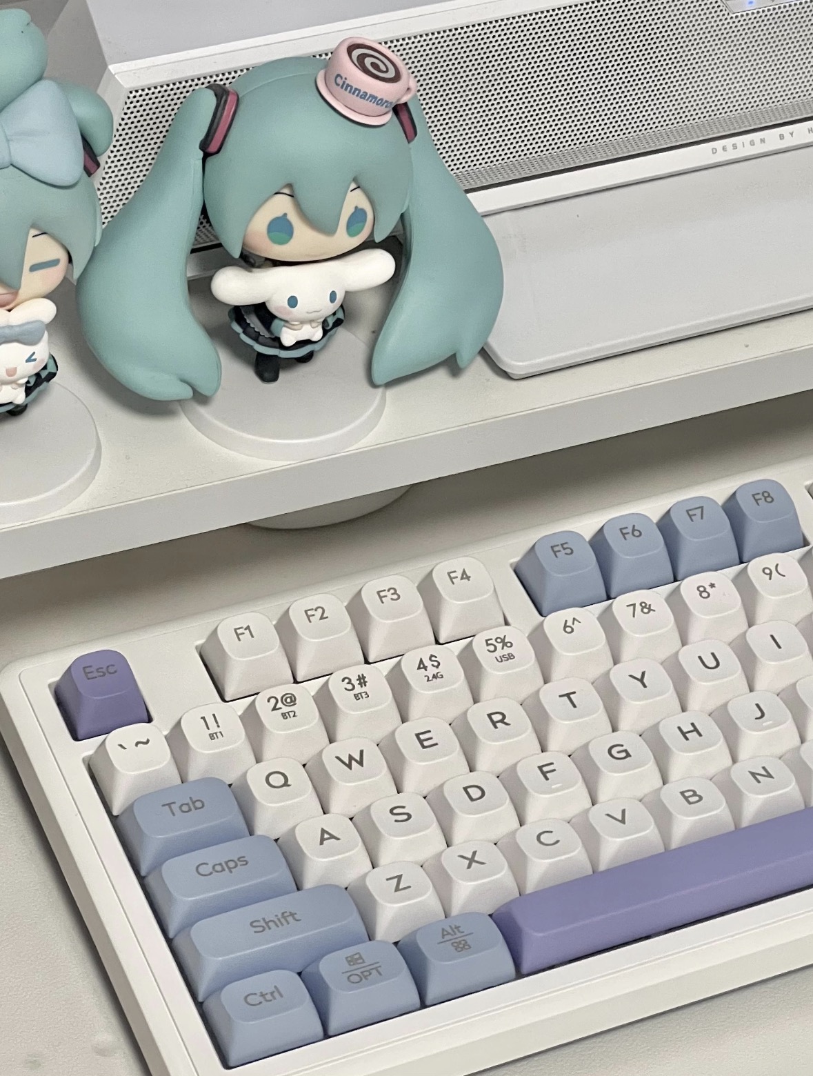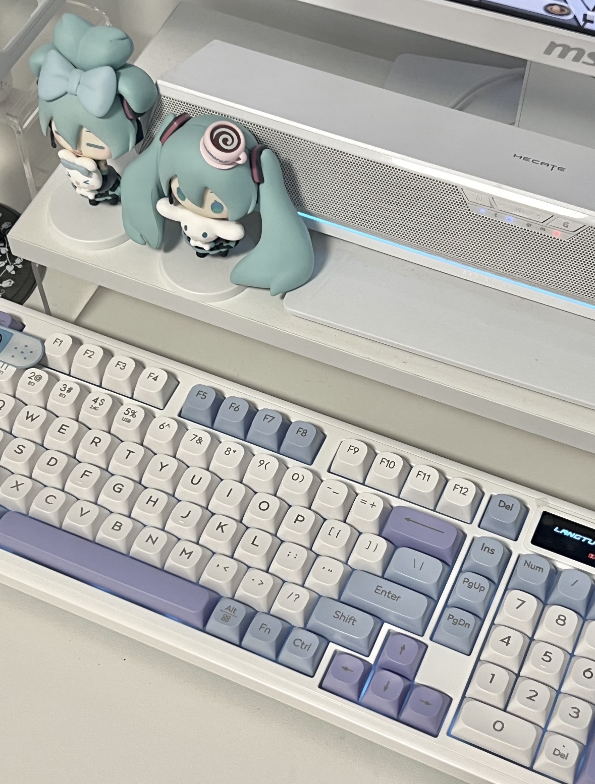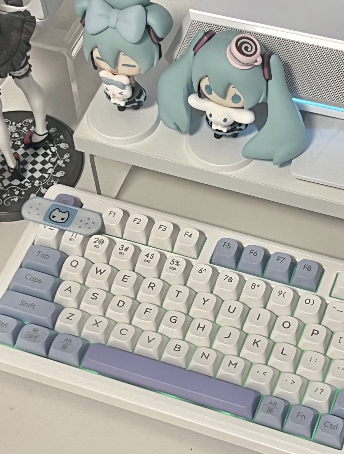 谁懂啊!这把键盘直接把我拿捏了!紫蓝渐变键帽像把春天的雾都揉进按键里,奶白底色温柔到心都化了。打字手感软弹不吵人,背光还能调,晚上加班都变成享受。搭配初音手办直接把工位氛围感拉满,颜值党闭眼冲就对了!