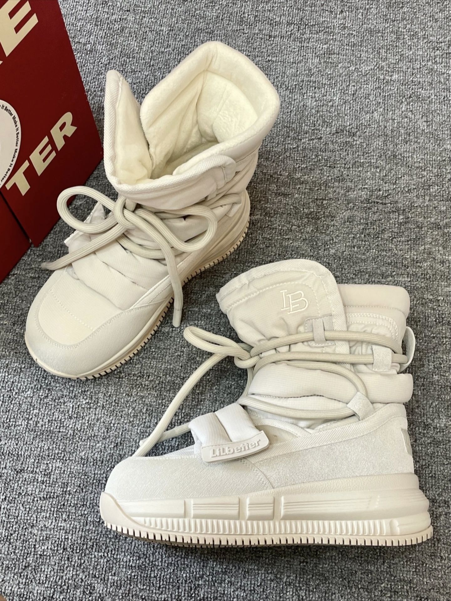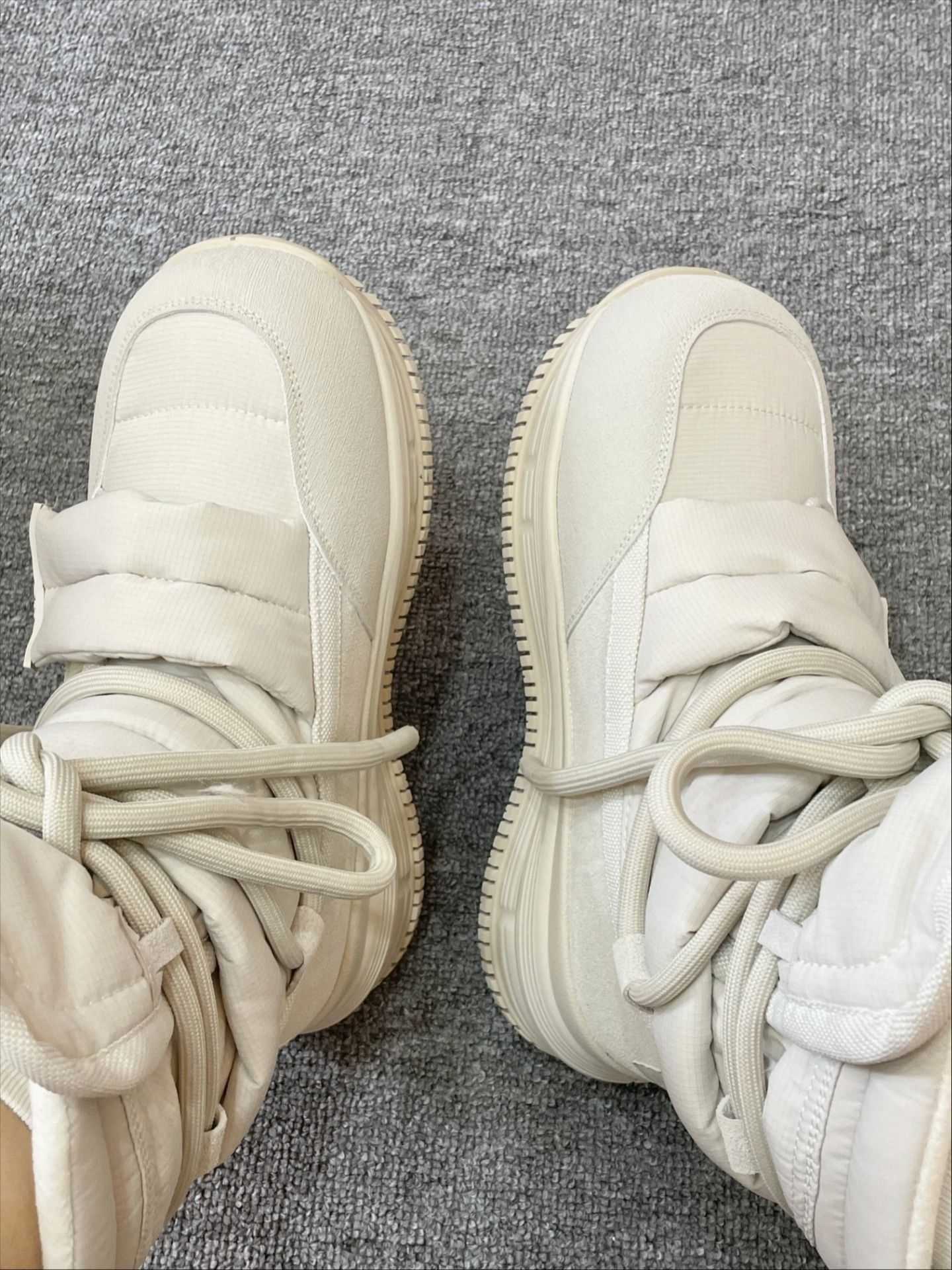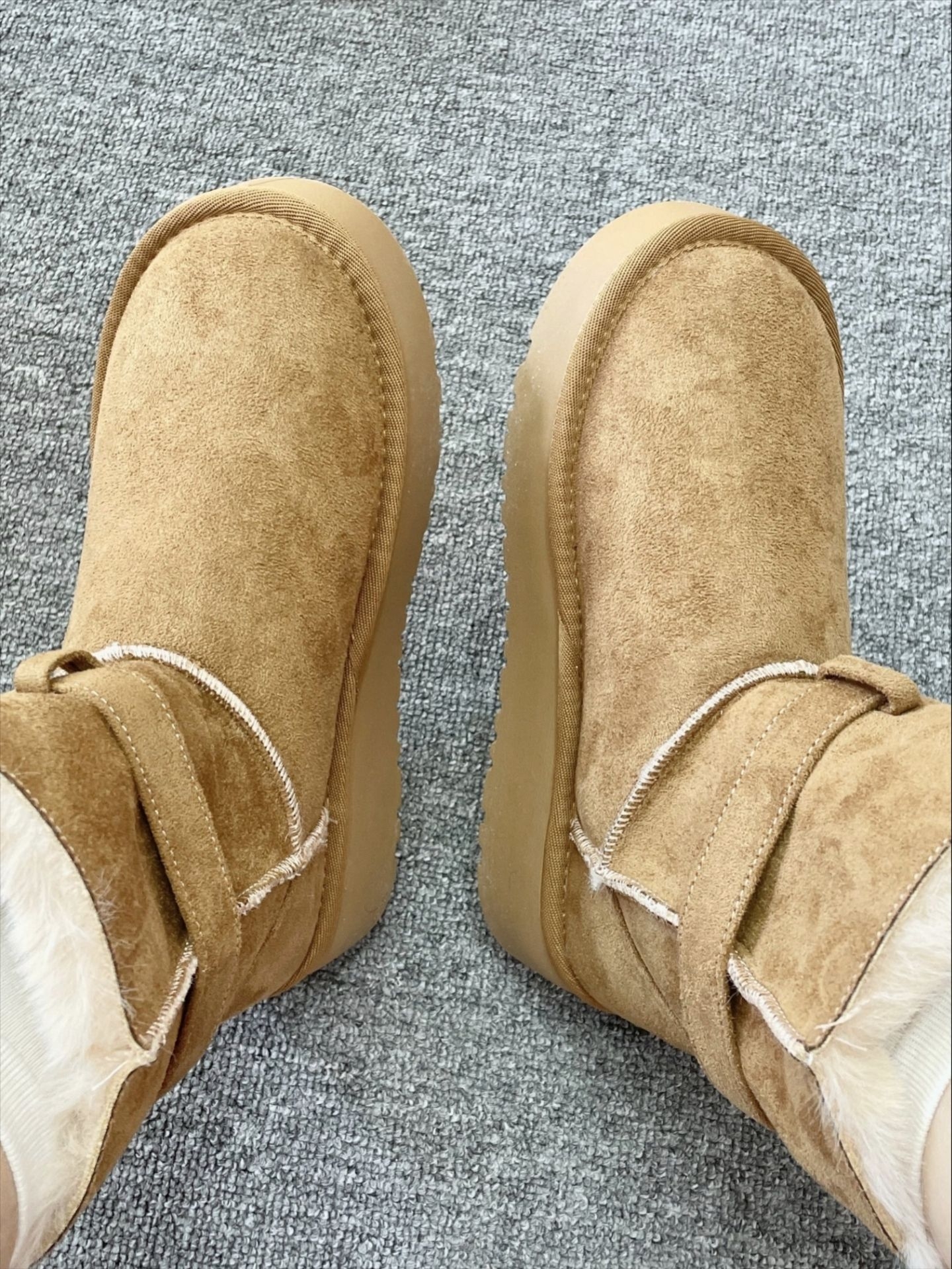 软糯的米白色像裹了一层甜奶油,视觉上就干干净净,特别提气。 鞋身采用扎实的防风面料,把冷空气牢牢挡在外面,内里茸茸的,包裹双脚像是被温暖云朵轻轻抱住。 厚底设计对小个子太友好了,瞬间拔高身形,却一点不显笨重,走起路来异常轻快。 鞋底纹理深刻,防滑性能优秀,在雨雪湿滑的路面上也能走得稳稳当当。 无论是配浅色牛仔裤还是毛绒半裙,都能搭出软萌又时髦的冬日氛围感。