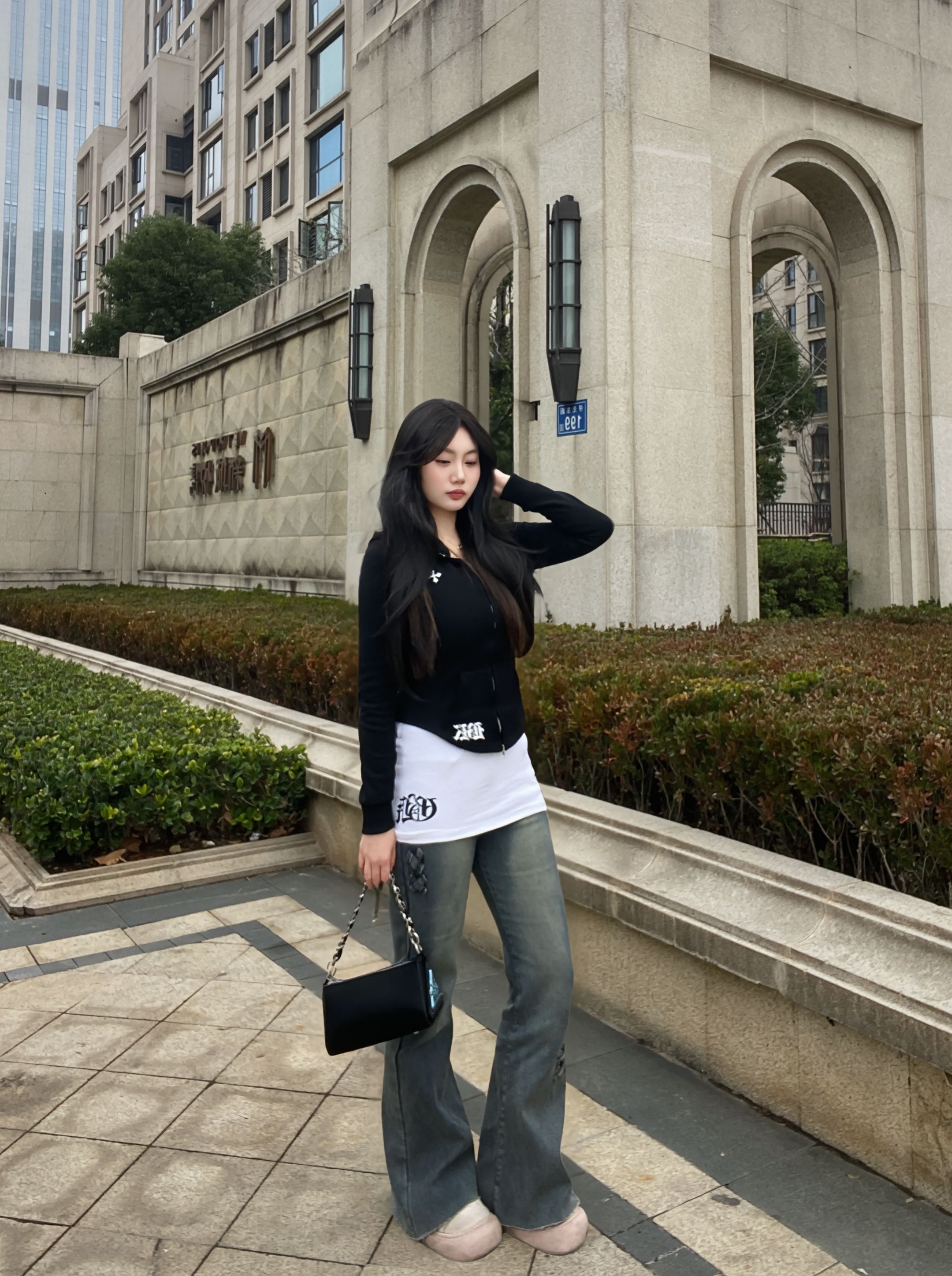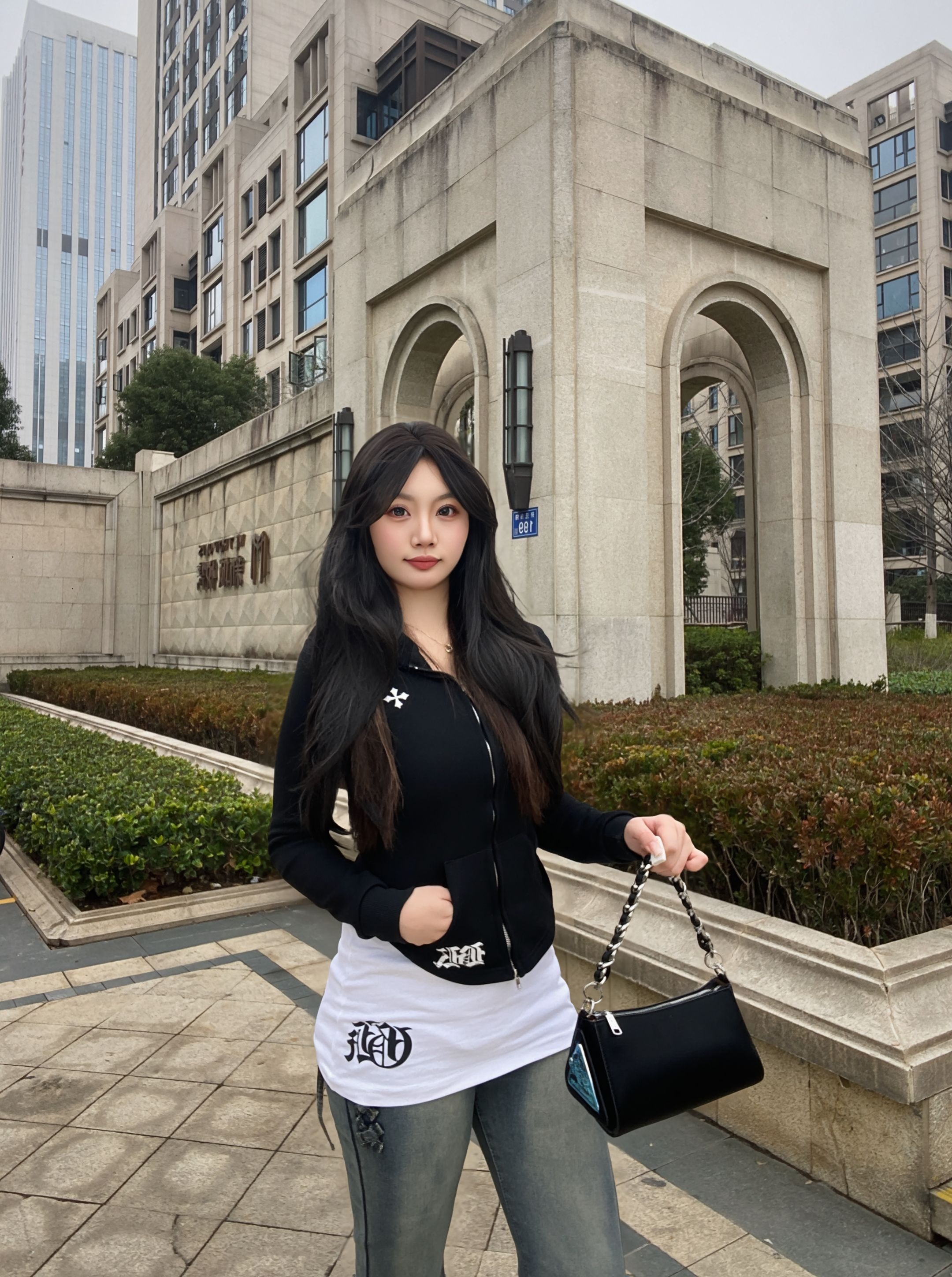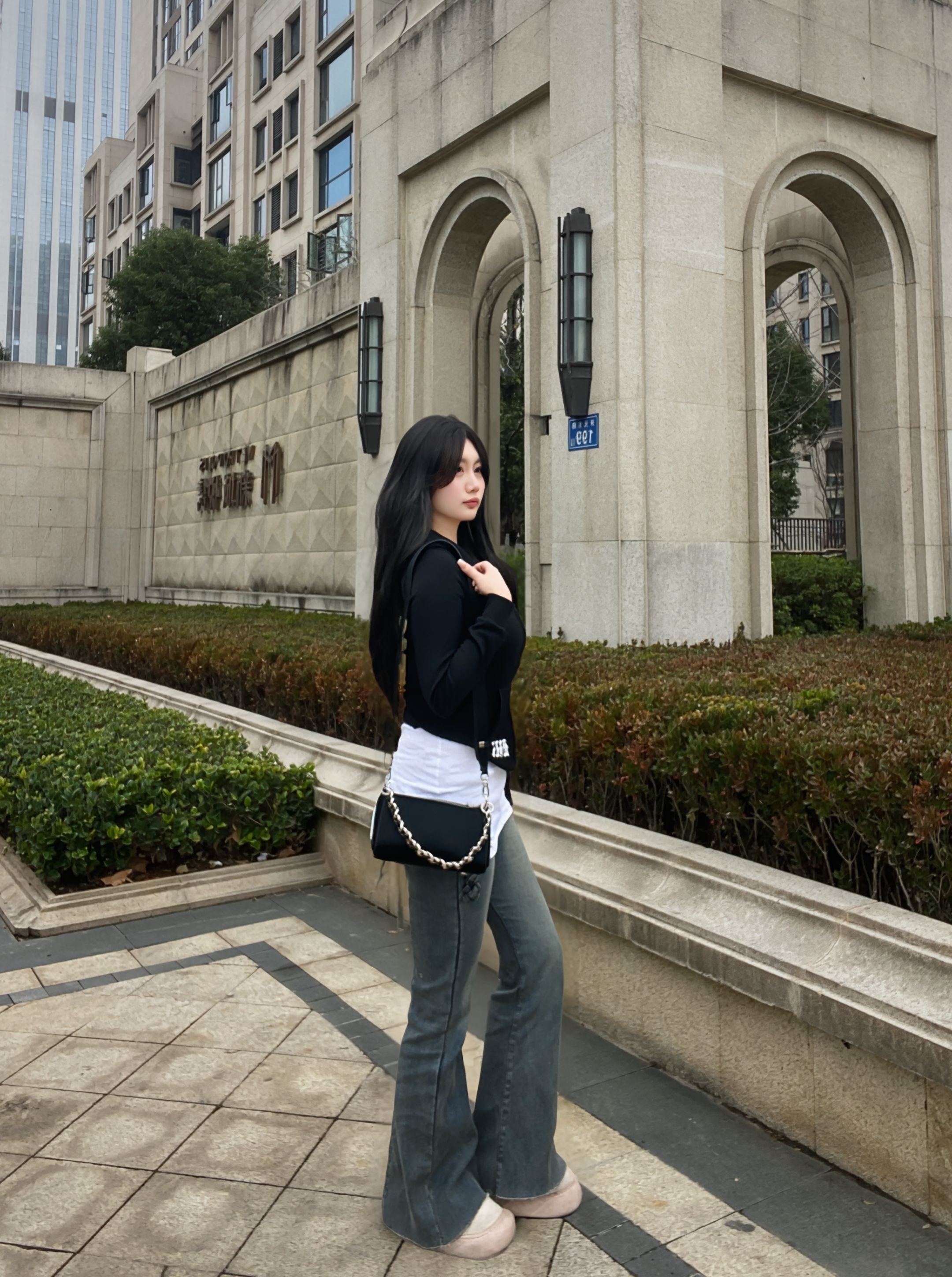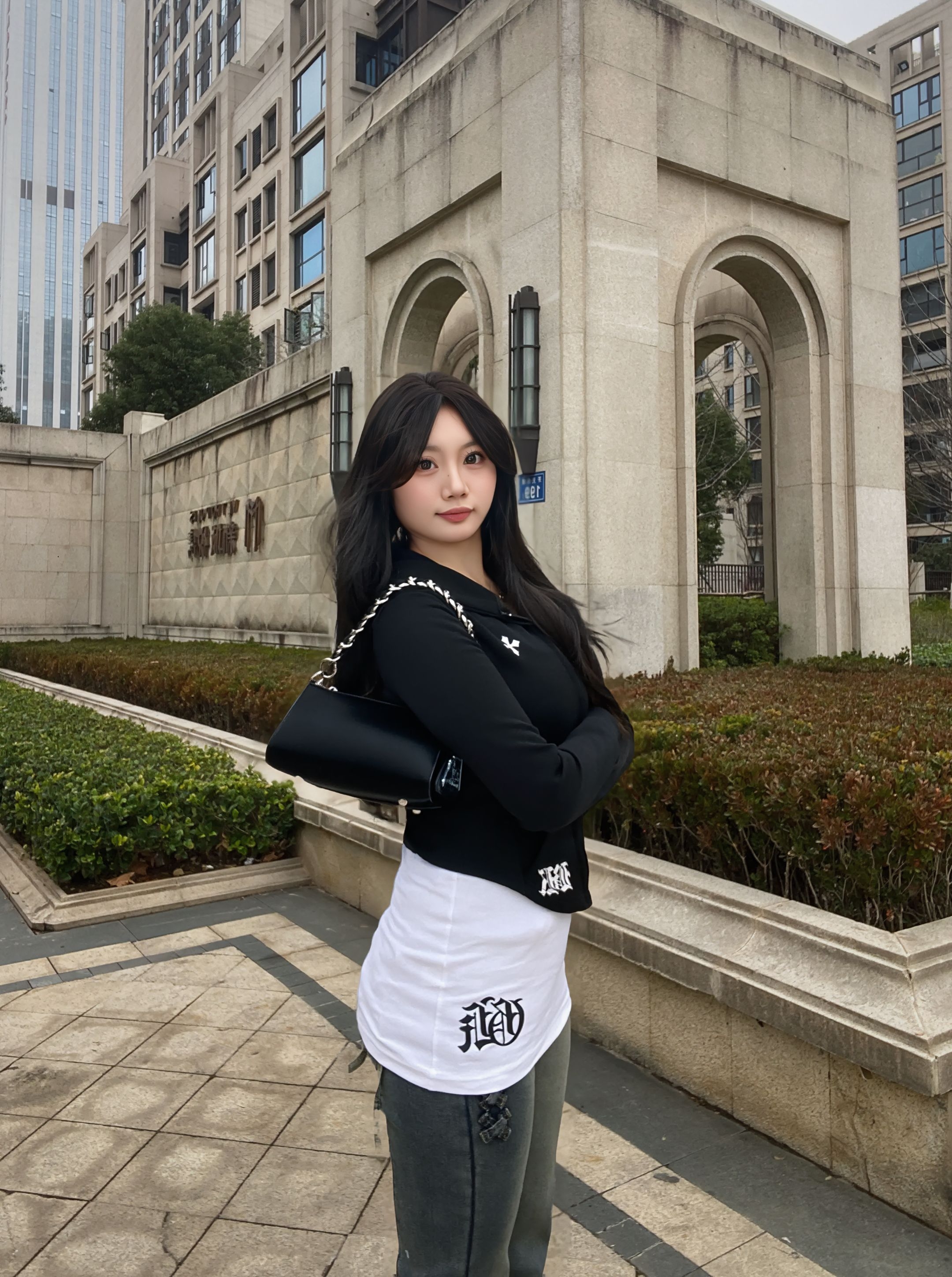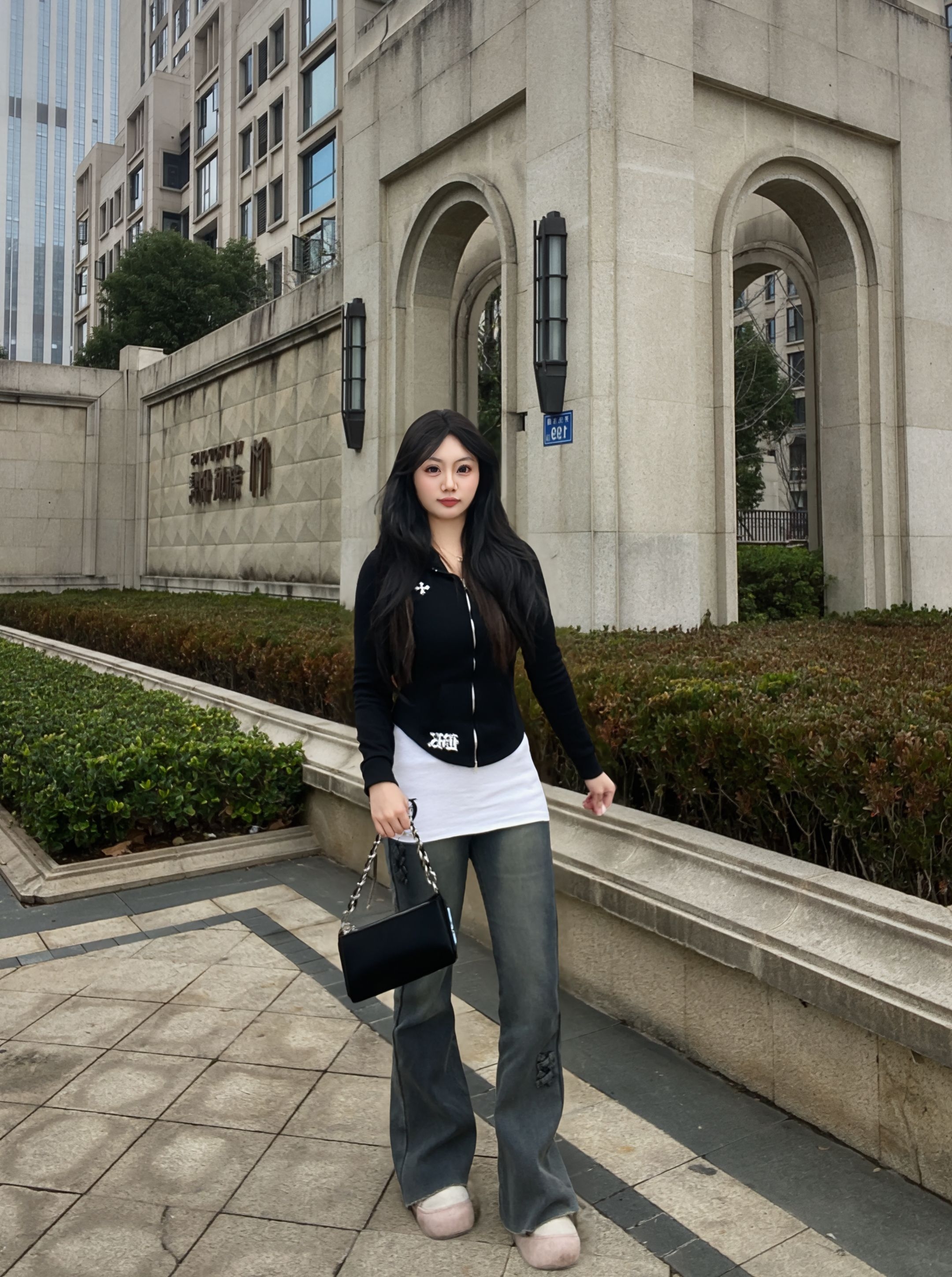 这套穿搭把“简约辣妹风”玩明白了!短款黑色拉链衫自带利落感,小面积露肤刚好平衡了酷感和性感。叠穿的白色下摆是点睛之笔,不仅能遮挡胯部线条,还能在视觉上拉长腿部比例,对梨形身材超友好。这个迪士尼包包背法很多,看个人喜好,真的好方便啊~而且也很高级奢侈精致~搭配的微喇牛仔裤垂坠感拉满,裤脚的磨破细节添了几分随性复古感,和上衣的修身版型形成松紧对比,显瘦又显高。再配上链条包和软乎乎的拖鞋,松弛感直接拉满...