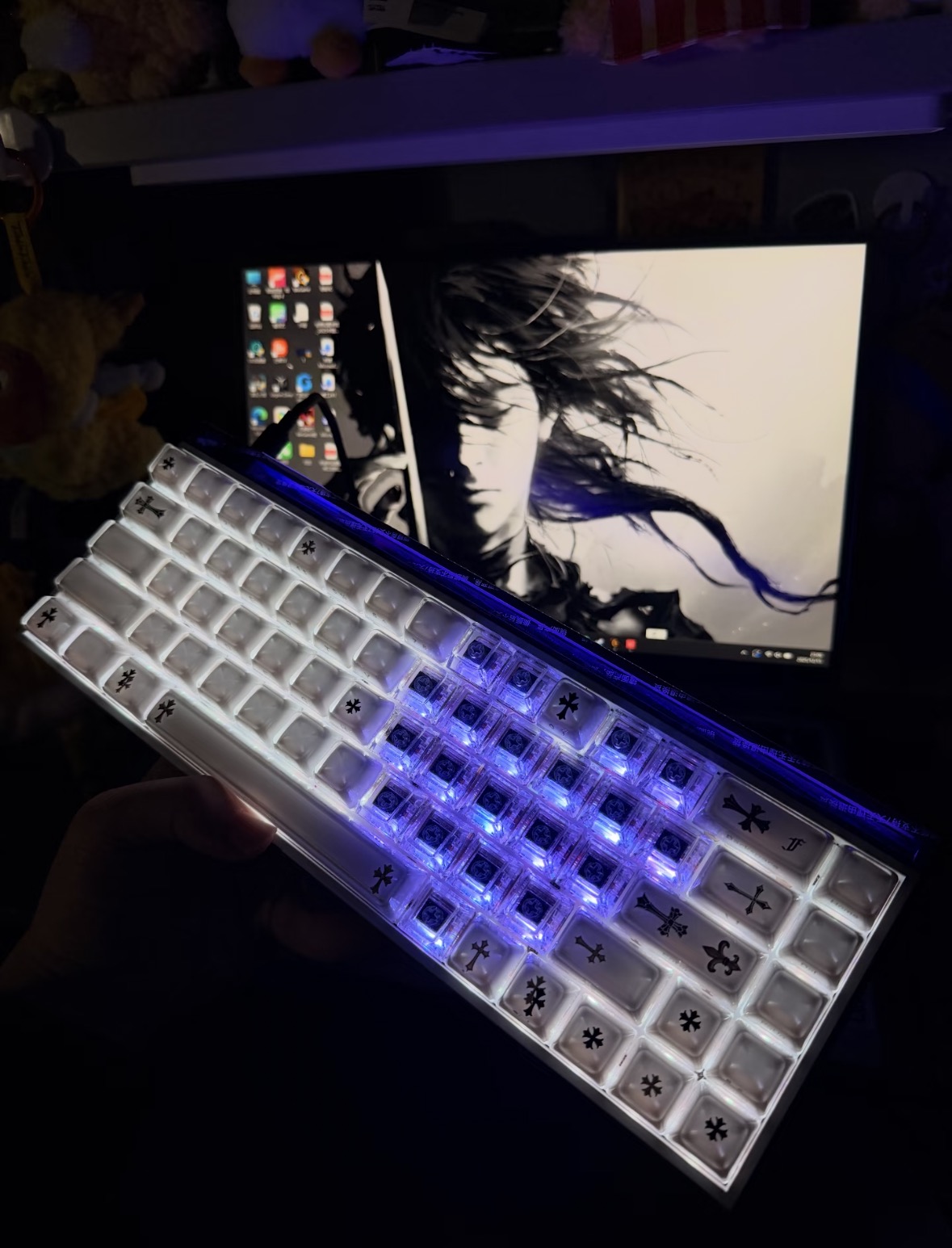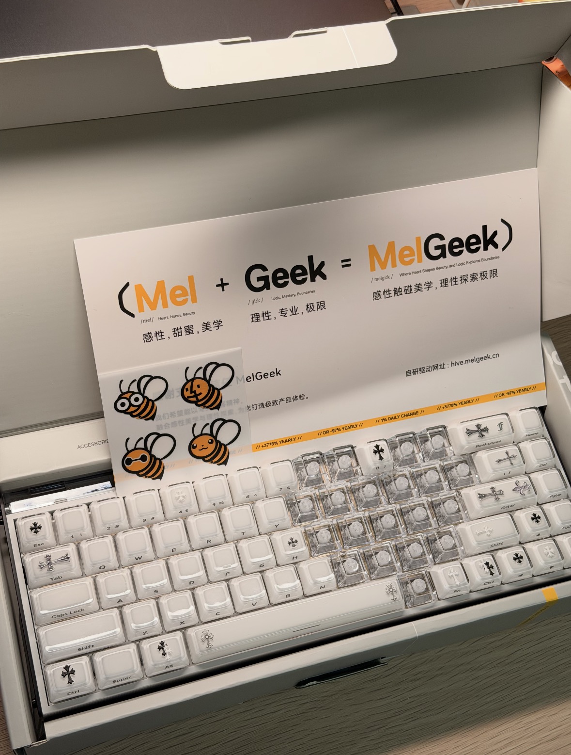 终于等到我的梦中情键!拆开包装就被小蜜蜂的可爱贴纸戳中,半透键帽+全透底座的设计,开灯后像把银河揣进键盘里。 打字手感脆爽不拖沓,无线连接也超稳,颜值和实用性直接拉满,氛围感神器实锤!💻💡 要不要我帮你写一个更偏向硬核测评的版本,方便吸引键盘发烧友?