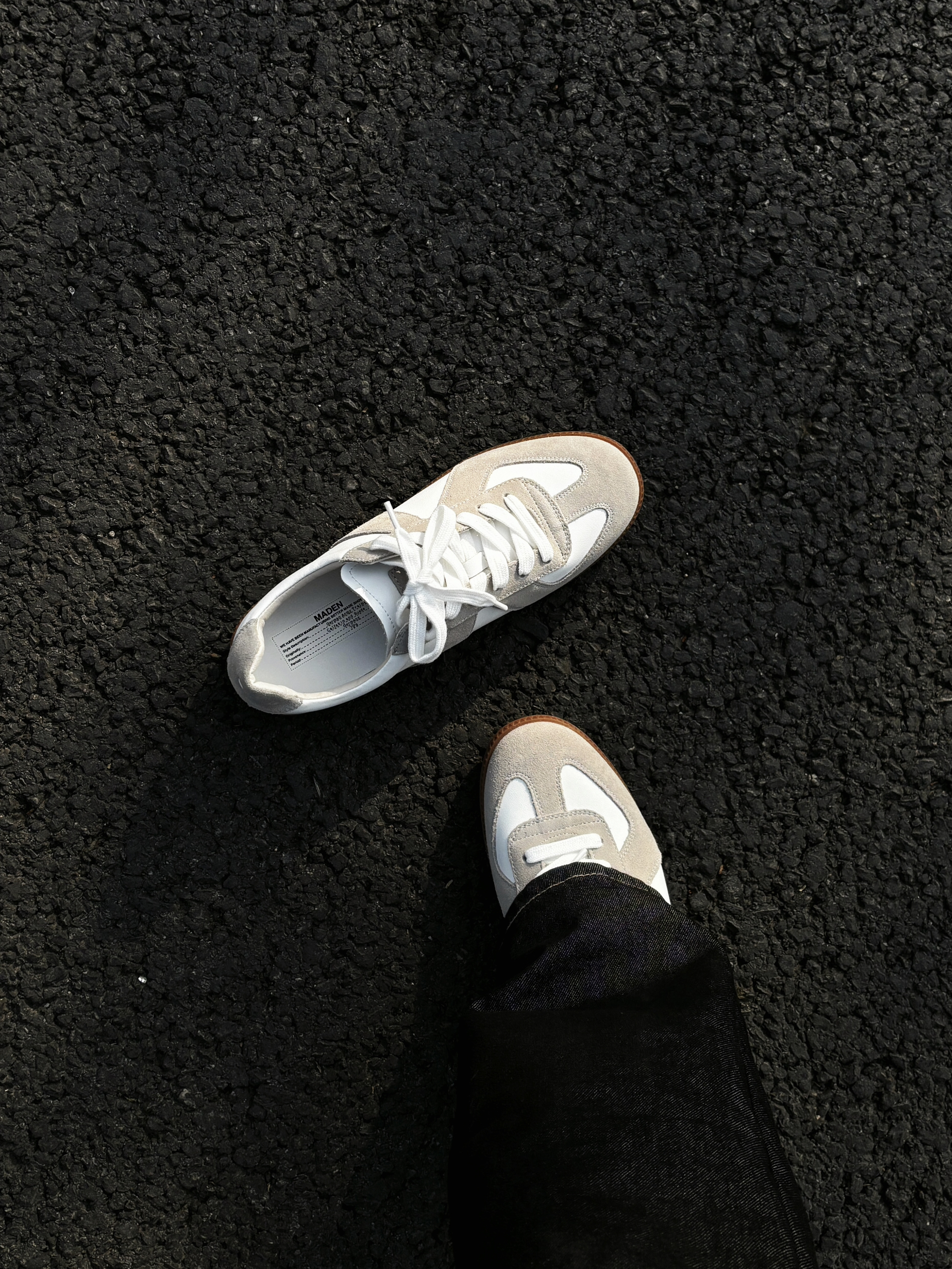 首先比较吸引眼球的是这双鞋的配色 鞋子整体是高级水泥灰加白色logo组合配色 给人一种很低调的高级感 上脚很有包裹感,鞋底软硬适中 没有很软弹感但久走不累脚 一般通勤,出街散步完全没有压力 这样一双冷配色能搭亮色穿搭吗?