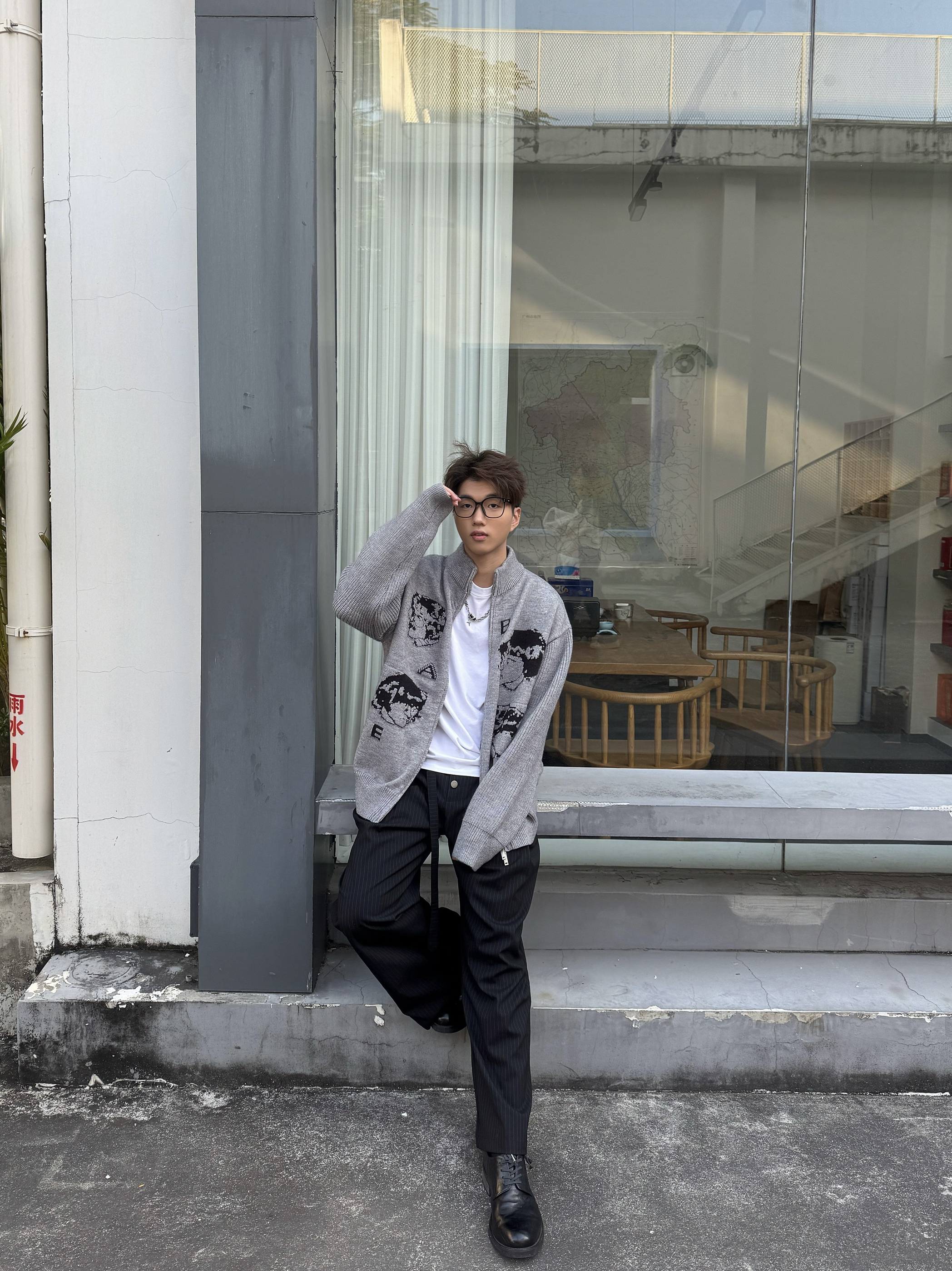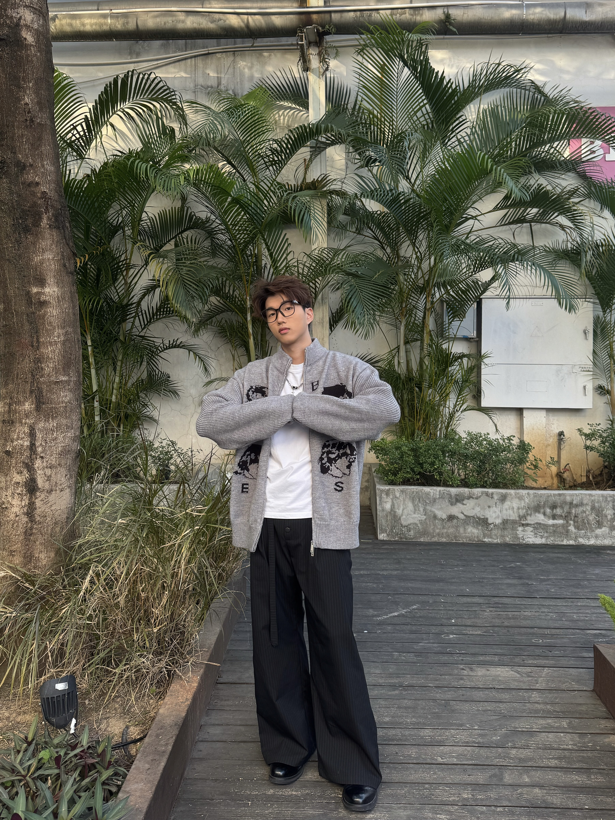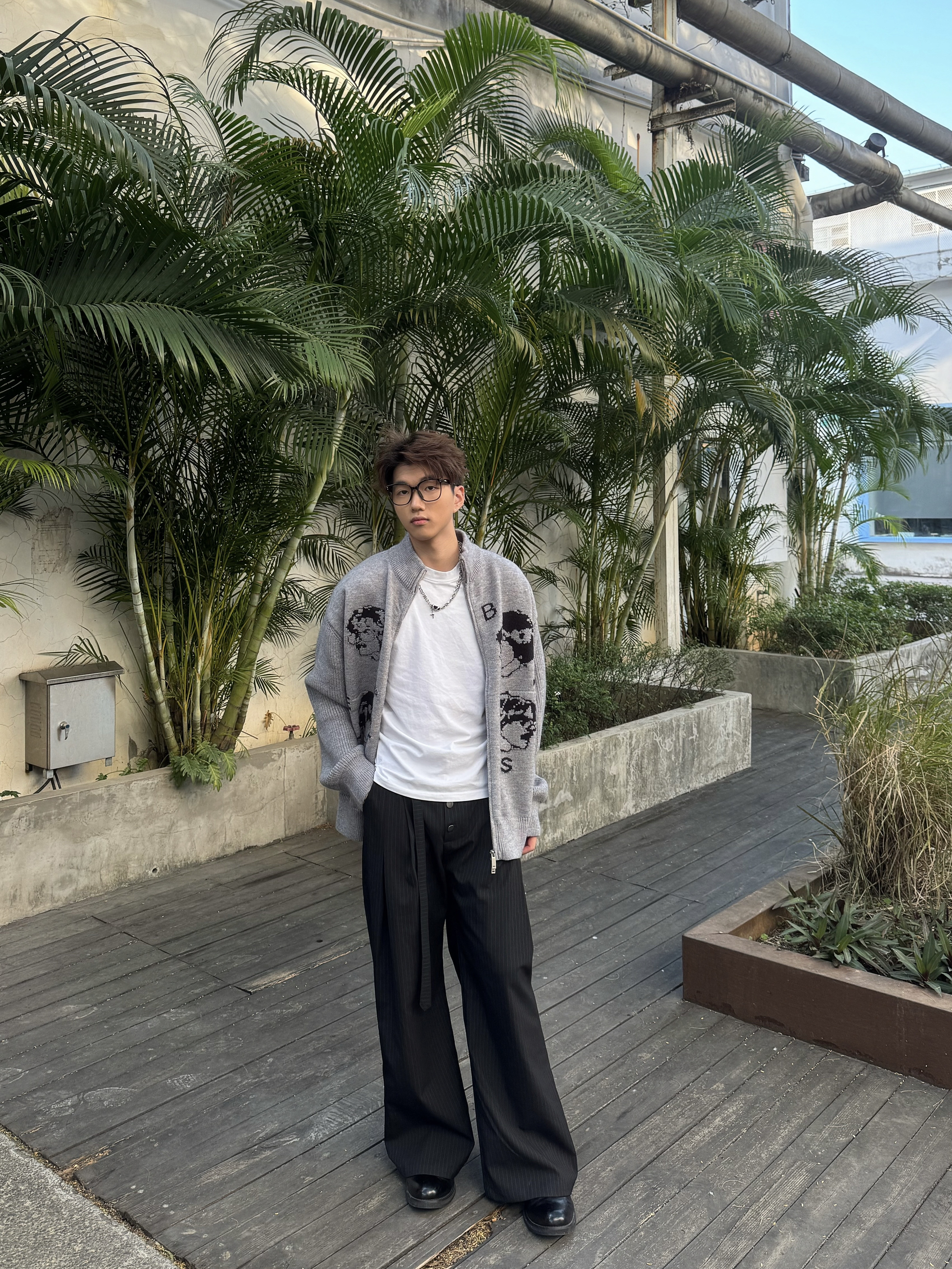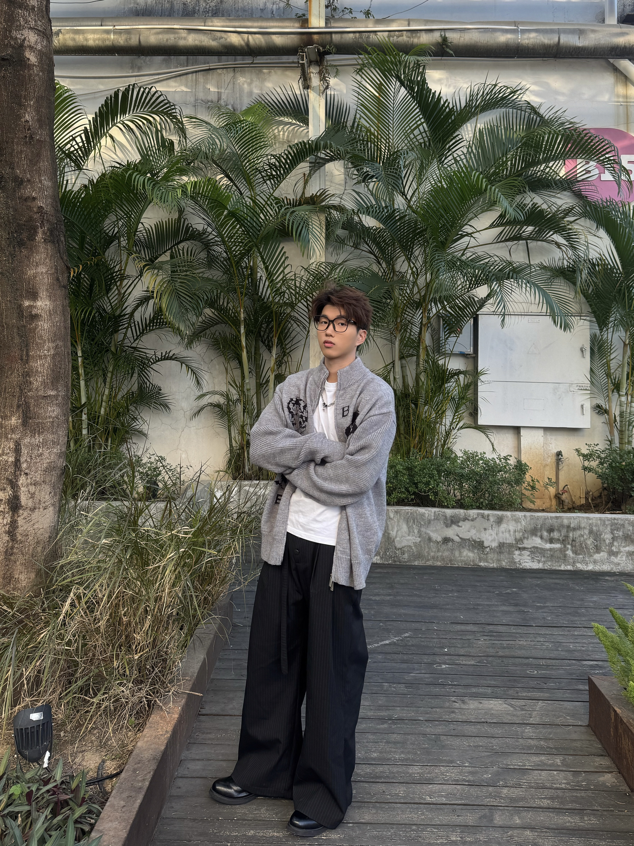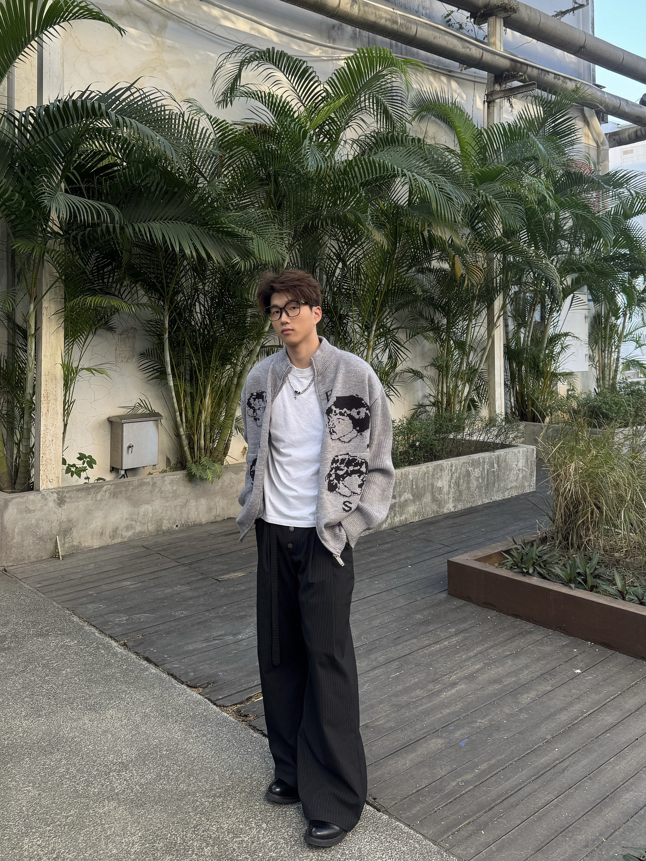 今天是低饱和度松弛感穿搭。浅灰开衫上的抽象图案自带复古腔调,内搭白T简约打底,垂坠感条纹阔腿裤拉长比例。不用费力凹造型,在老厂房改造的街头走一走,阳光和绿植都是氛围感搭子。