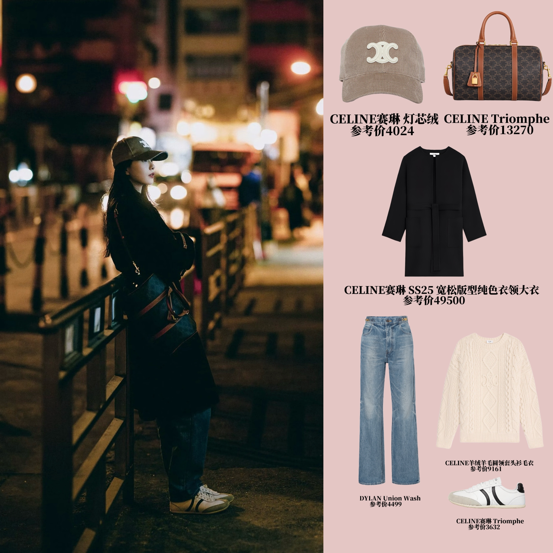 • 亮点在于配饰的呼应:CELINE灯芯绒棒球帽和Triomphe老花包,用同色系的棕色细节串联全身,让基础款穿搭瞬间有了记忆点。
