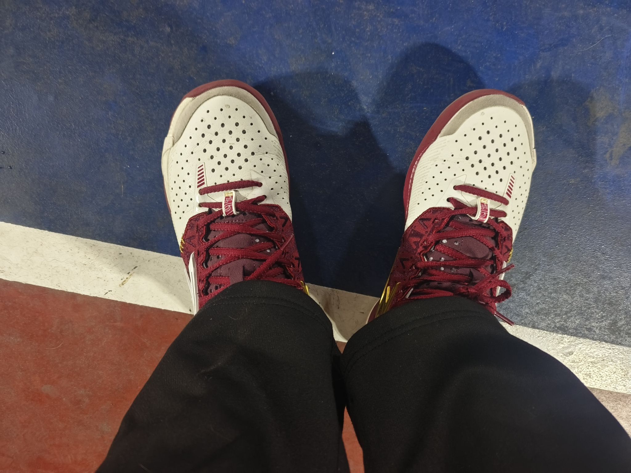晚上拍的可能光线不是很好,这个配色不仅仅实战打球能穿,日常通勤出街也是没问题的,比较好搭配,我选的这个黑色的裤子可能不是很搭,穿灰色的运动裤会更搭一些,上身套个卫衣或者连帽衫都是很可以的。