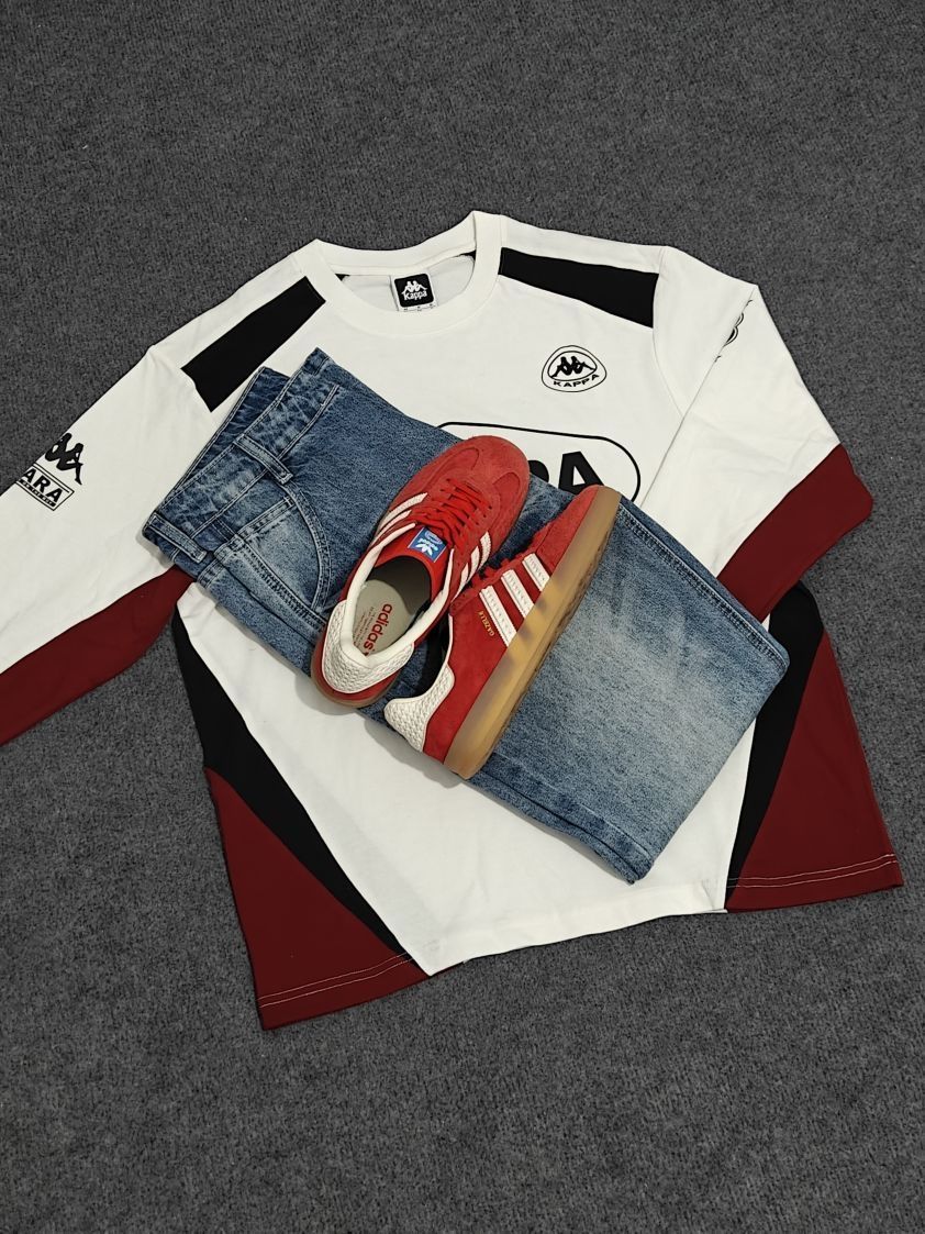 今日份穿搭✅ 👔上衣 Kappa卡帕 1916系列 复古时尚赛车服宽松t恤长袖纯棉卫衣 👖裤子 美式水洗宽松微喇直筒牛仔裤 👟鞋子 红色德训鞋