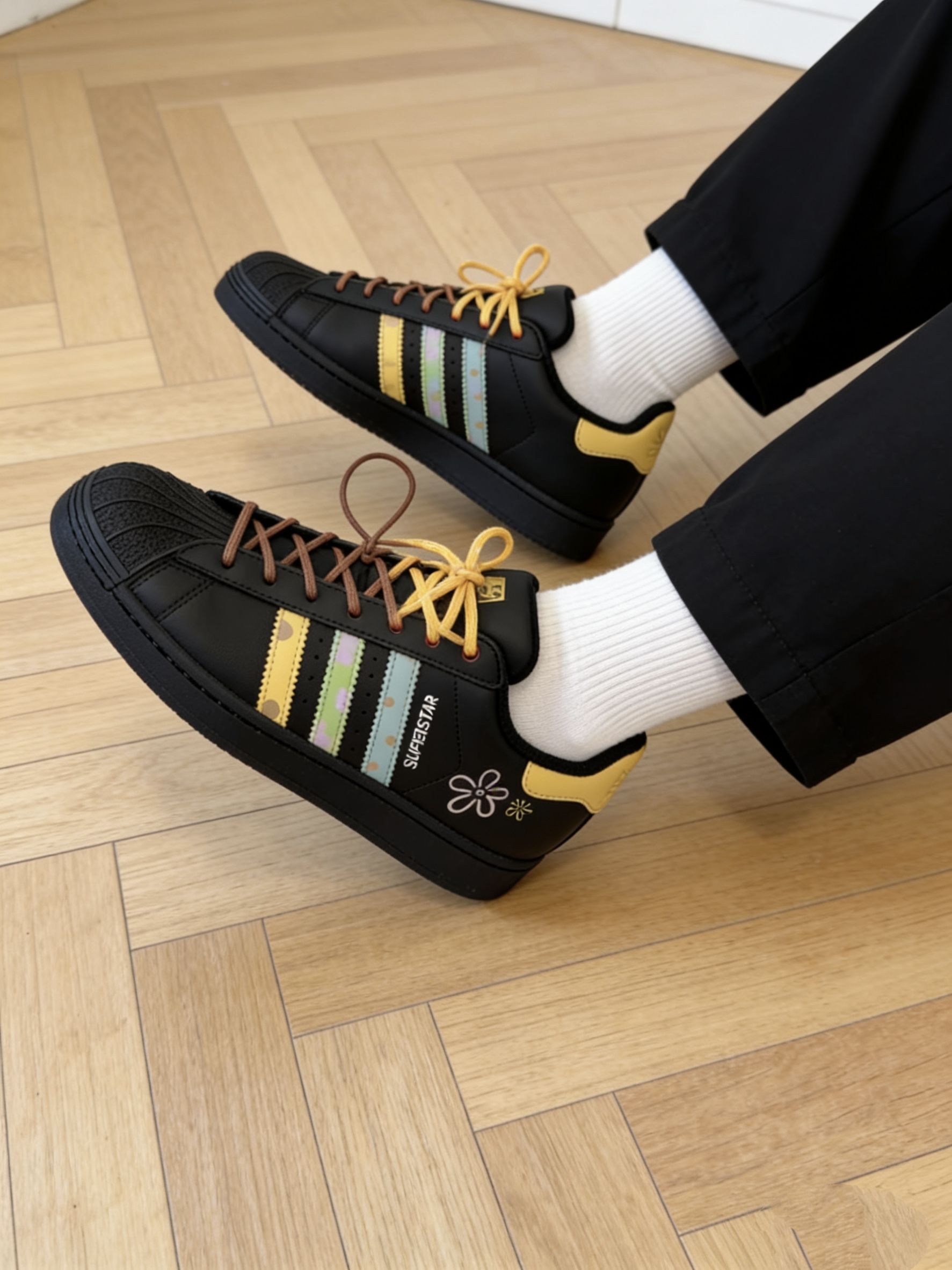 黑色为主搭配黄、绿、粉条纹的板鞋,看着就很顺眼 鞋上的小花图案不扎眼,却多了点可爱感。这双鞋带设计很贴心,可随意切换 上脚很软和,走路逛街都不累,平时出门随便搭配都很好看,属于日常穿不会轻易出错的款