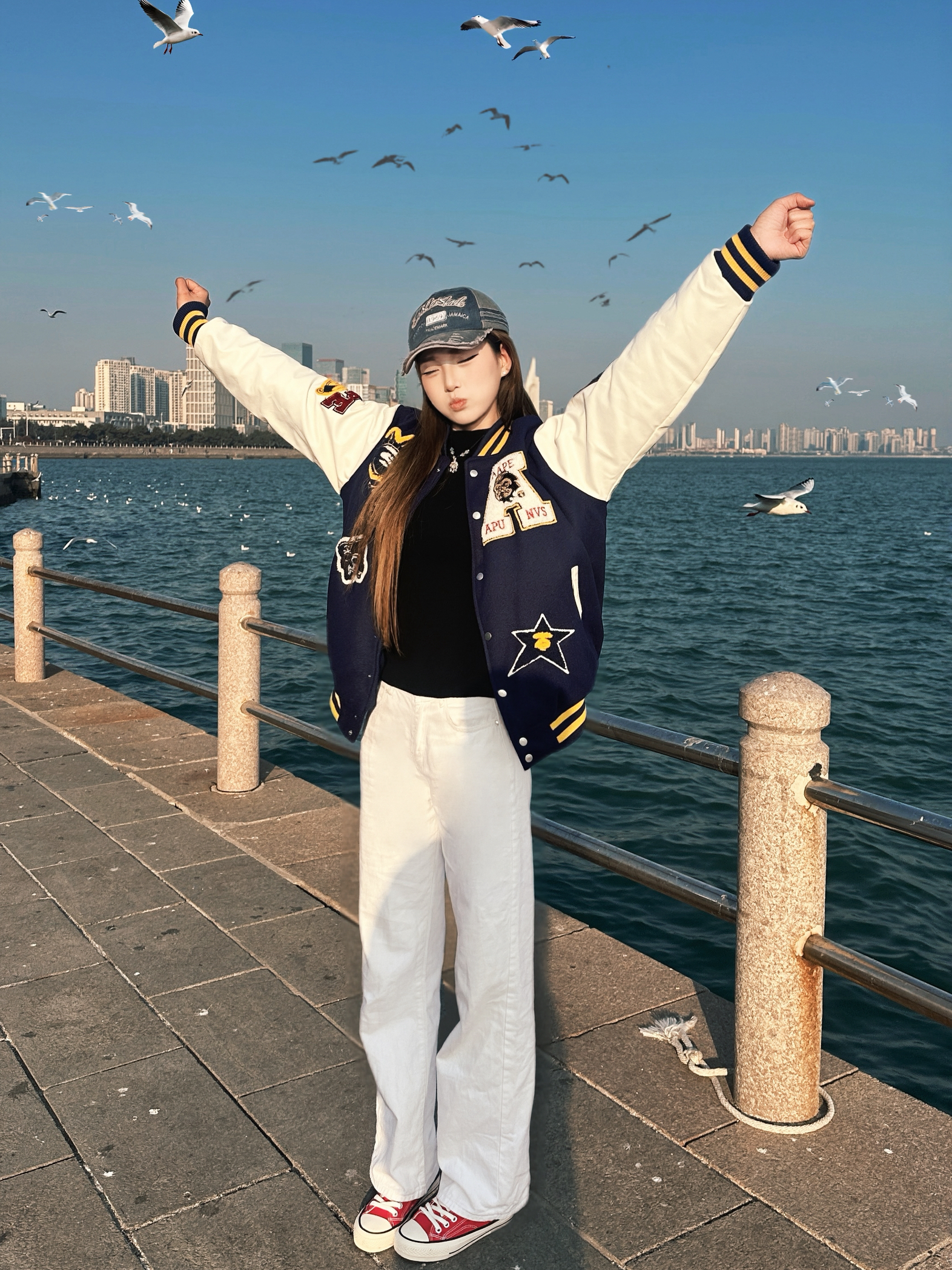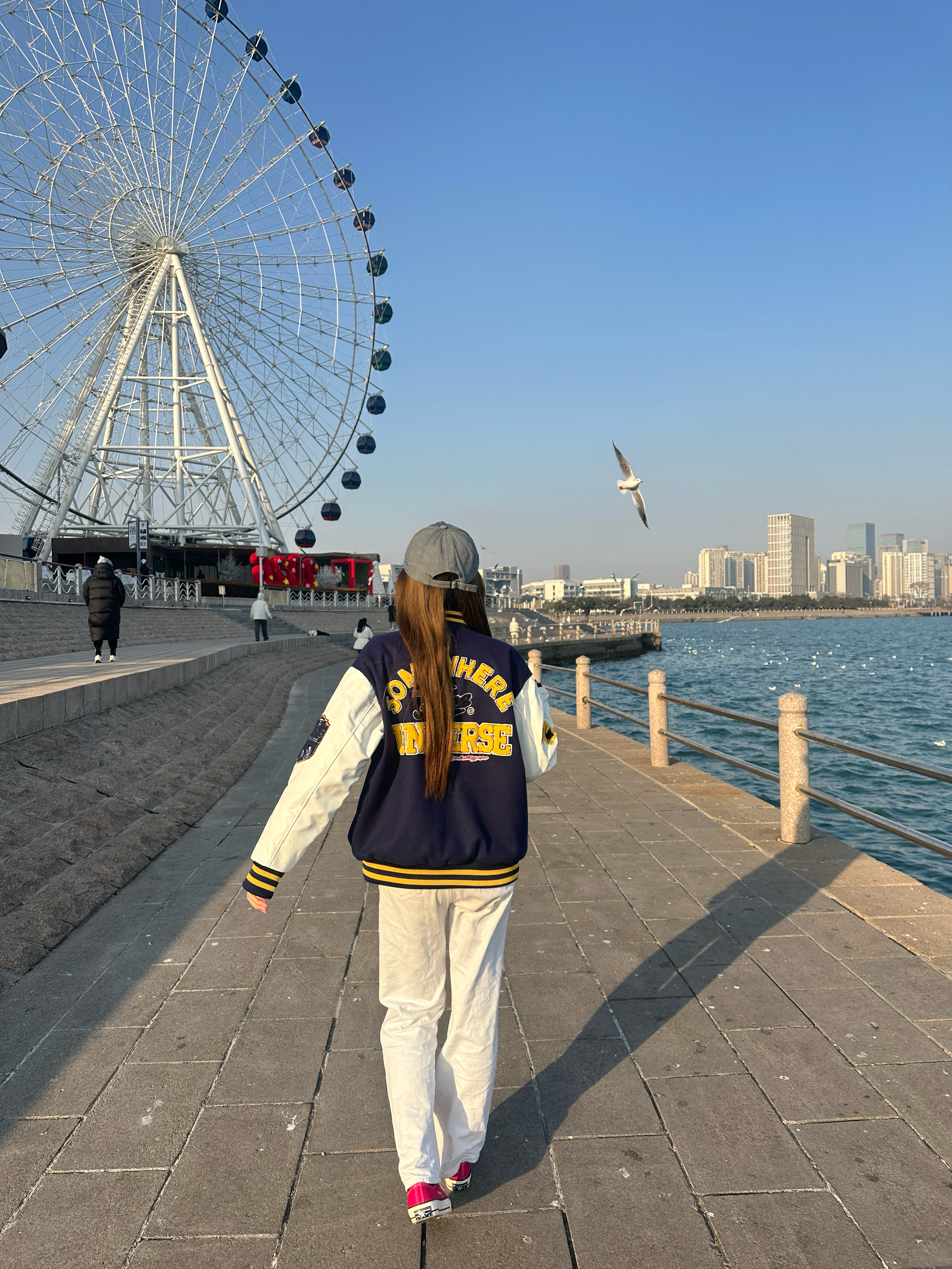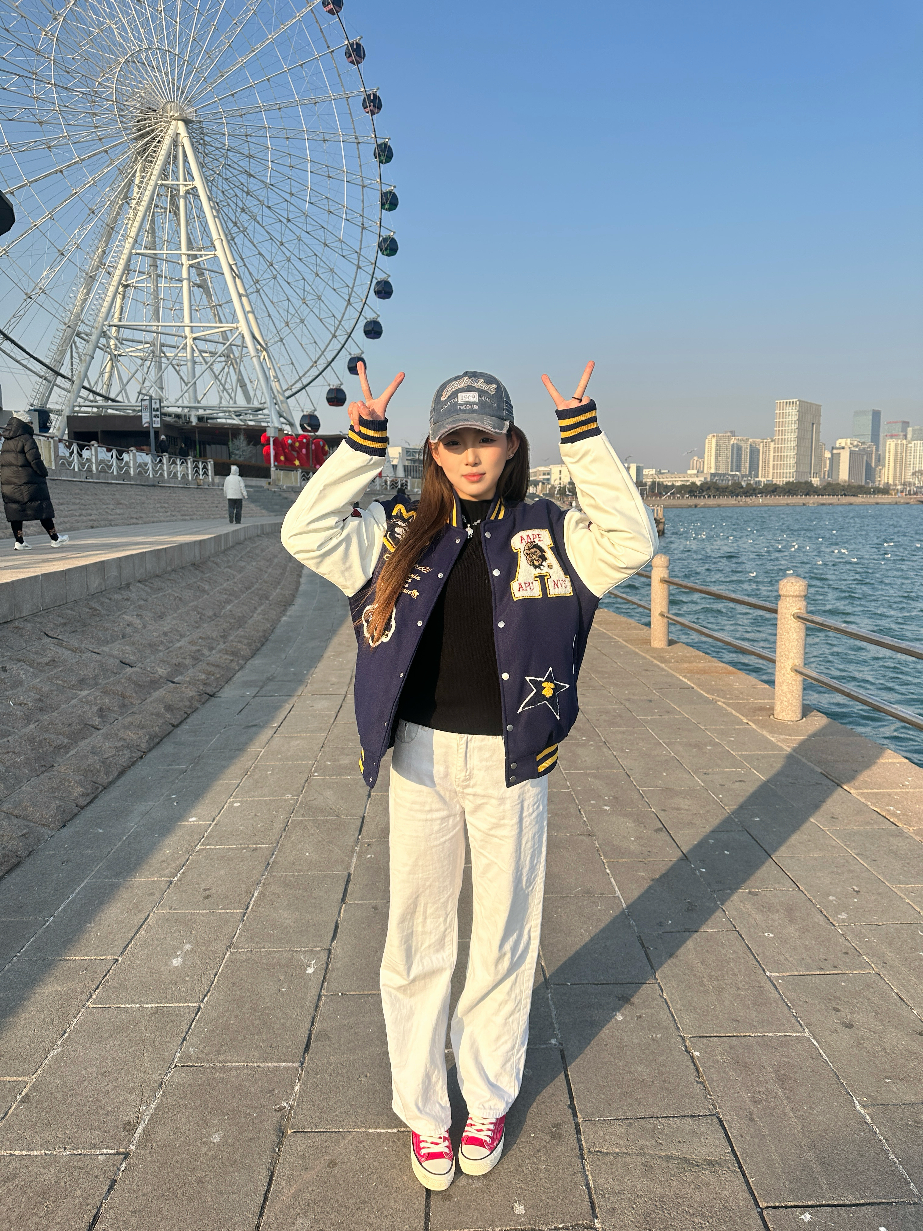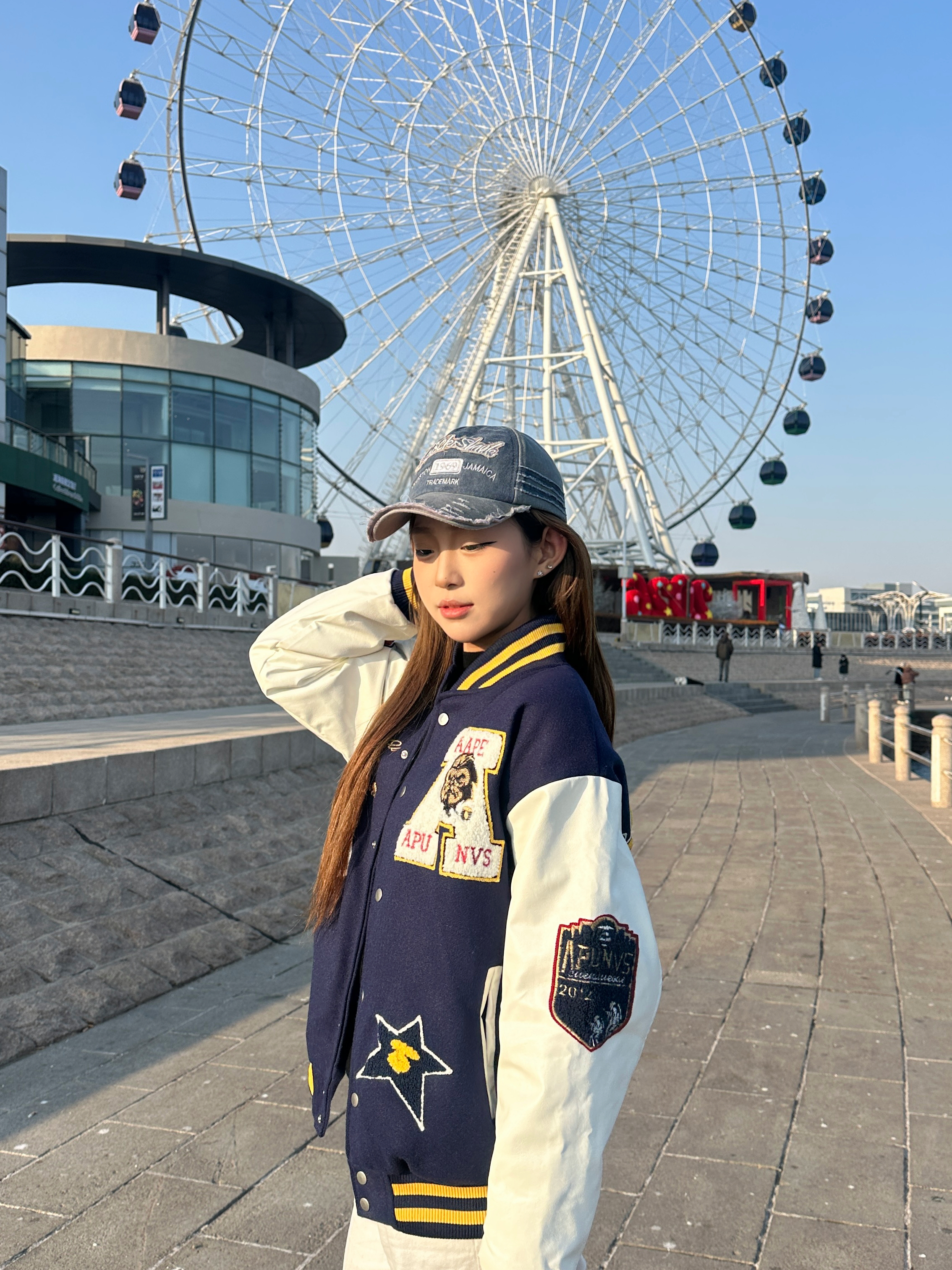 这件藏青拼米白的棒球服就是早春氛围感神器! 毛呢拼接皮质袖面🤩 手感软糯又挡风😇 复古徽章和后背字母刺绣细节拉满 配白裤+帆布鞋直接穿出美式校园感🧚♂️ 在海边摩天轮下拍照📸 阳光一照青春感都要溢出屏幕啦!