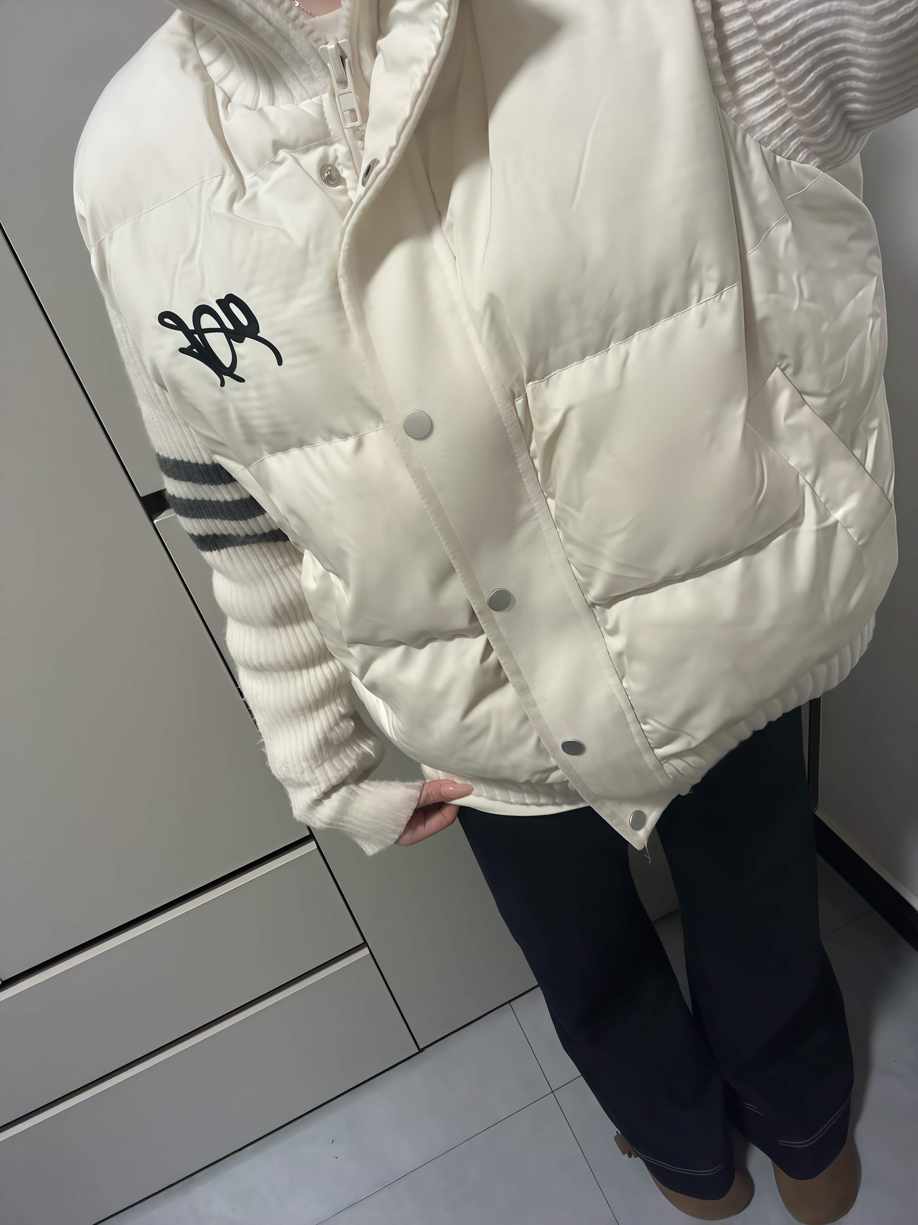 这件拼接棉服直接焊在我身上了🧥 米白针织袖+棉服主体的组合,把保暖和显瘦焊死 经典四道杠自带学院buff,搭配黑裤子随手一拍都是韩系画报。短款版型对小个子超友好,上短下长比例直接拉满 南方过冬一件足够,北方叠穿卫衣也完全不臃肿 今年本命棉服,已经准备焊在身上了