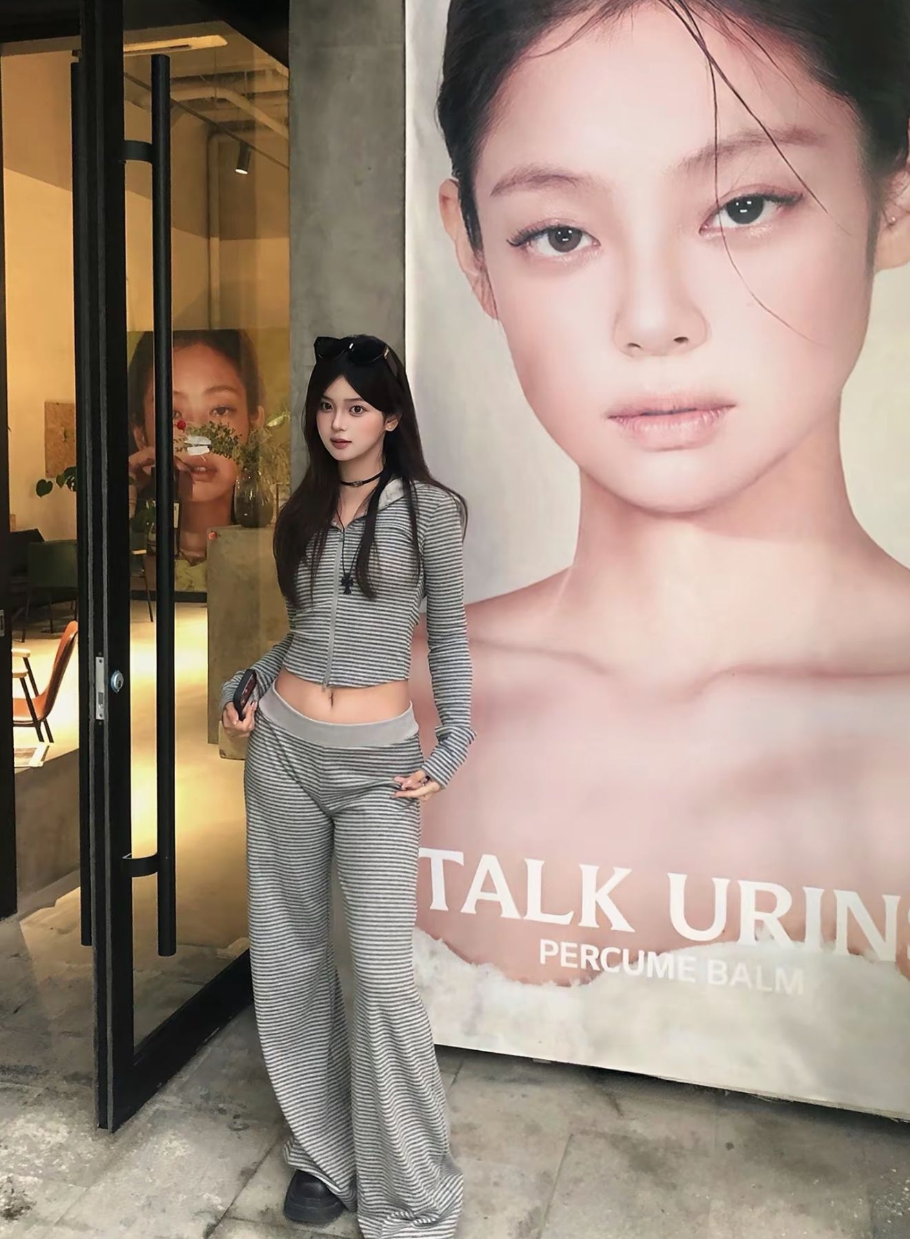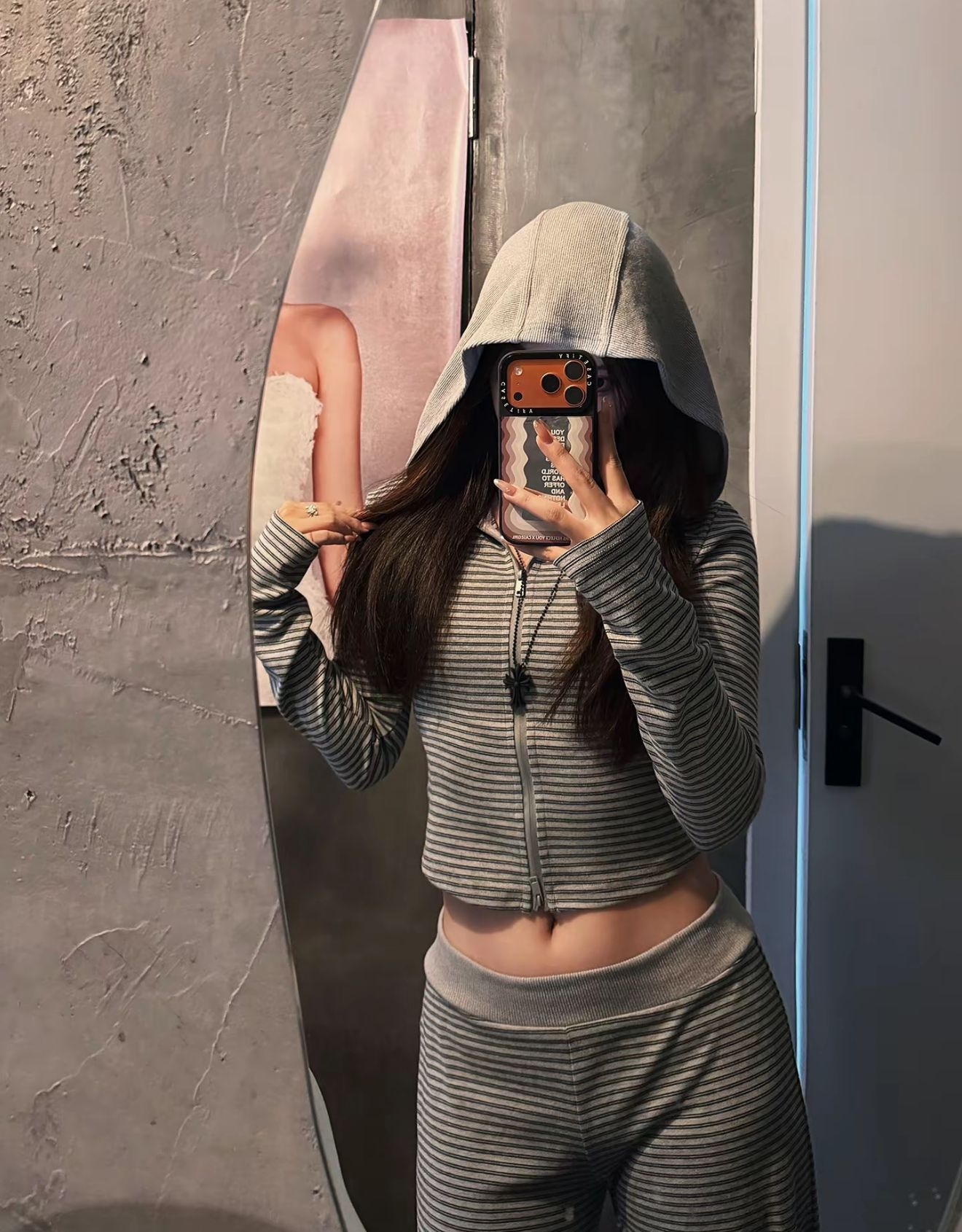 当初以为自己能坚持运动 专门准备了一身运动风的套装 发现日常穿也可以 这身套装是棉的,料子很舒服 很吸汗 而且这种运动装都比较透气 条纹的衣服给人一种活泼的感觉,不会像纯色 上衣是个帽衫,我自己比较喜欢戴帽子的衣服,除了方便会更好看