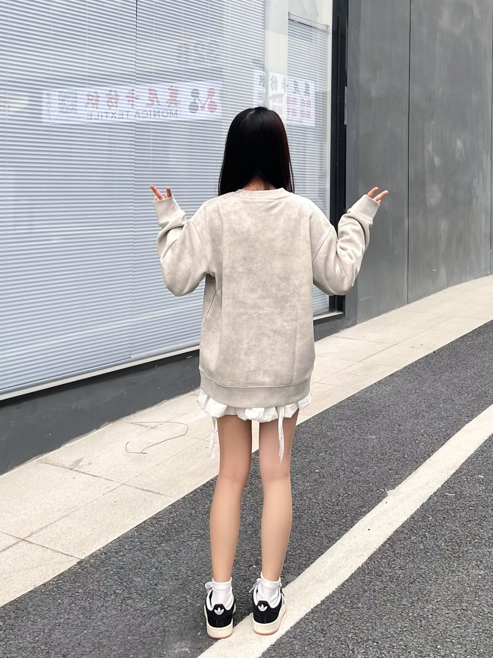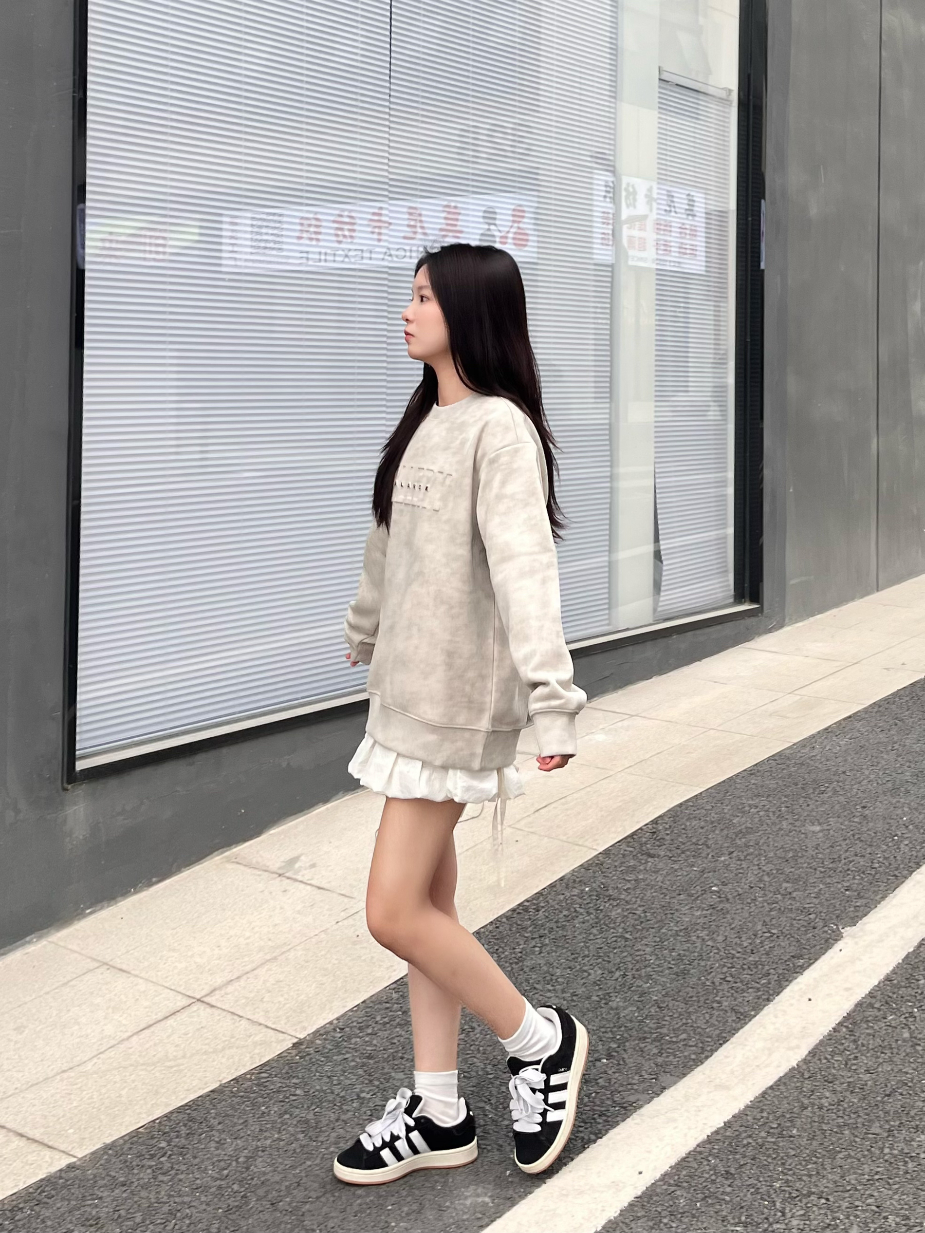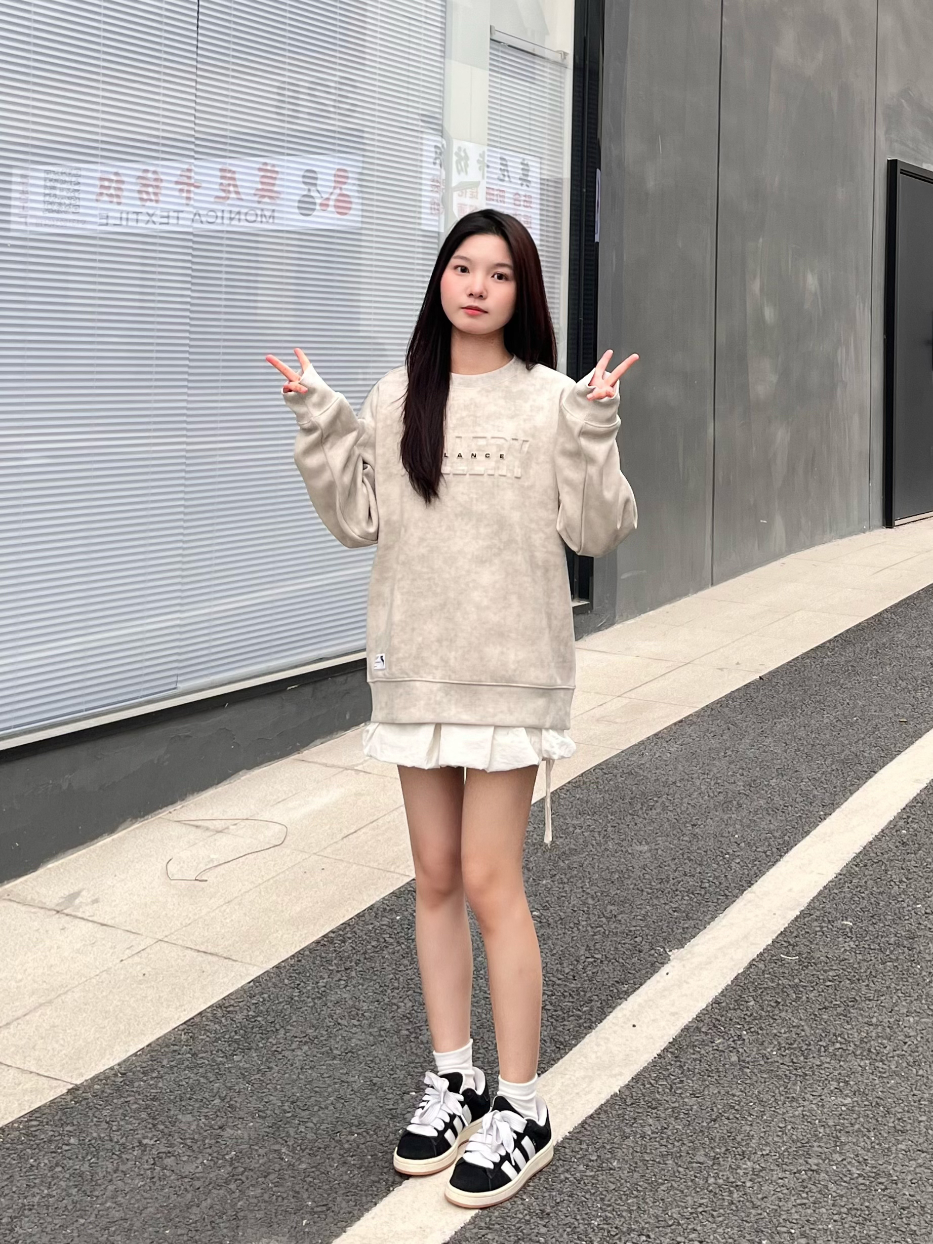 这件字母卫衣面料很柔软厚实 很舒适 搭配短裙拉长比例 显高又显瘦🥰 鞋子是百搭的黑白配色 上脚舒适透气 有轻微的增高效果