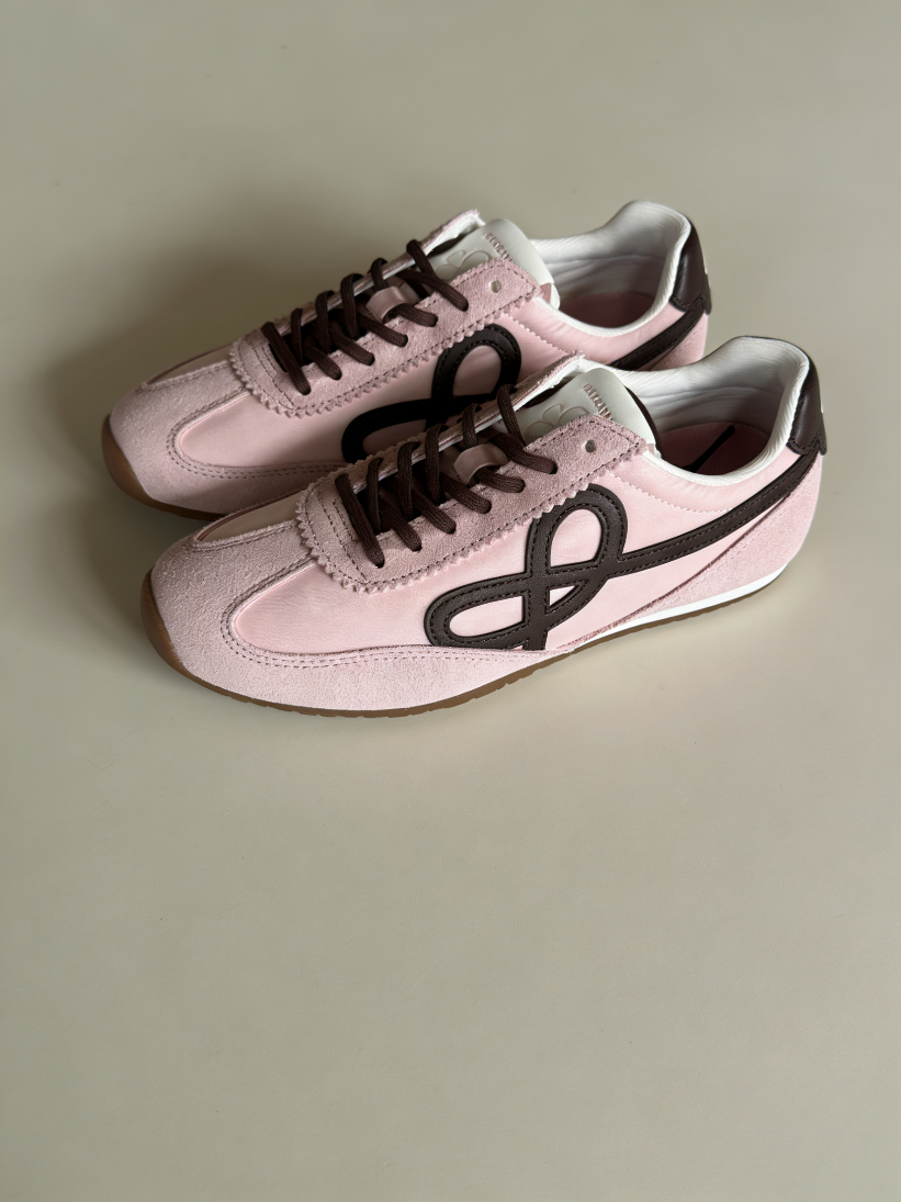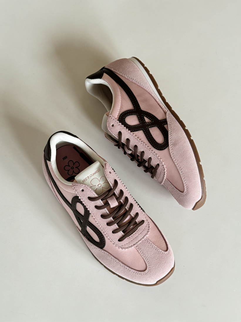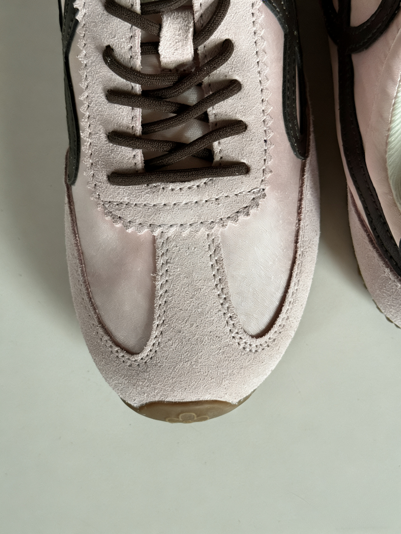 🌸谁懂啊!这双粉黑德训鞋直接把甜酷风焊在脚上了!樱花粉麂皮+亮黑线条的撞色太戳我,蝴蝶结鞋带更是点睛之笔🎀 生胶鞋底软弹又防滑,暴走一天都不累。配牛仔裤是美式辣妹,配百褶裙是甜酷少女,黄皮穿也显白,春天的本命鞋就是它!