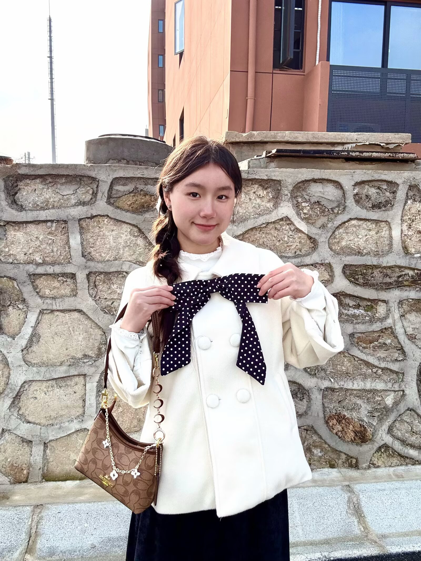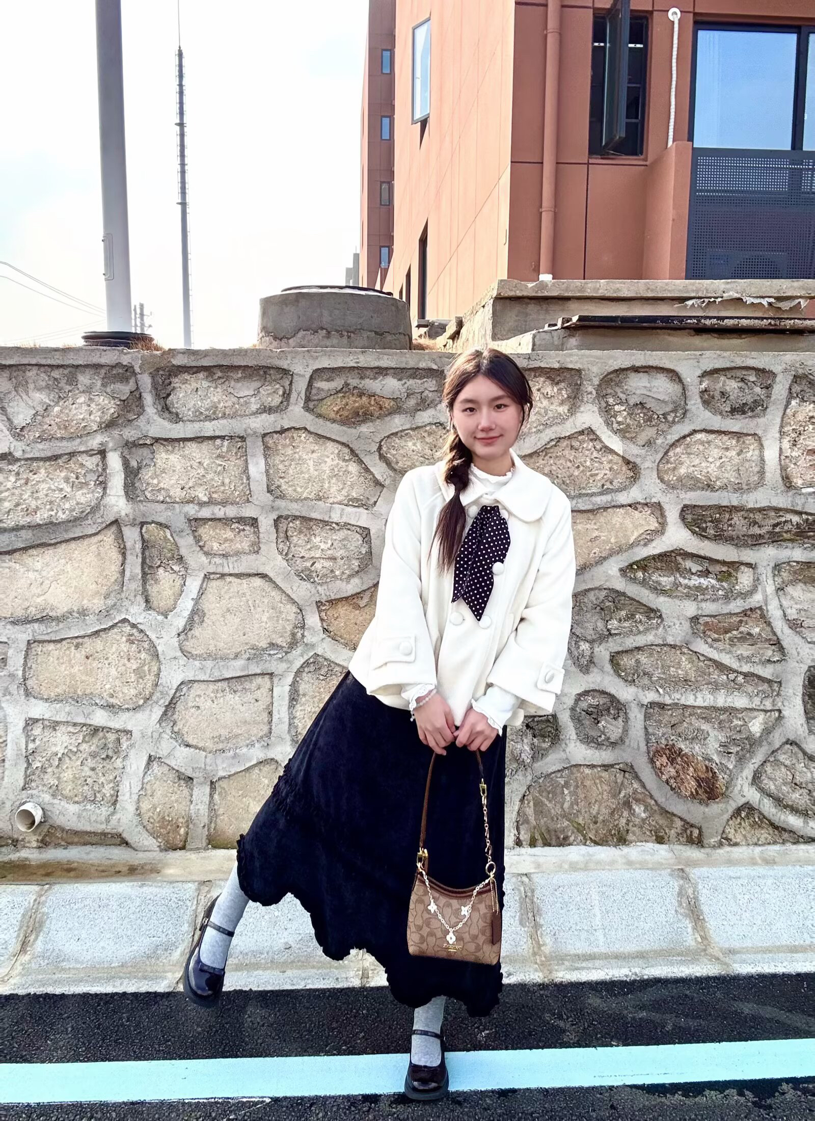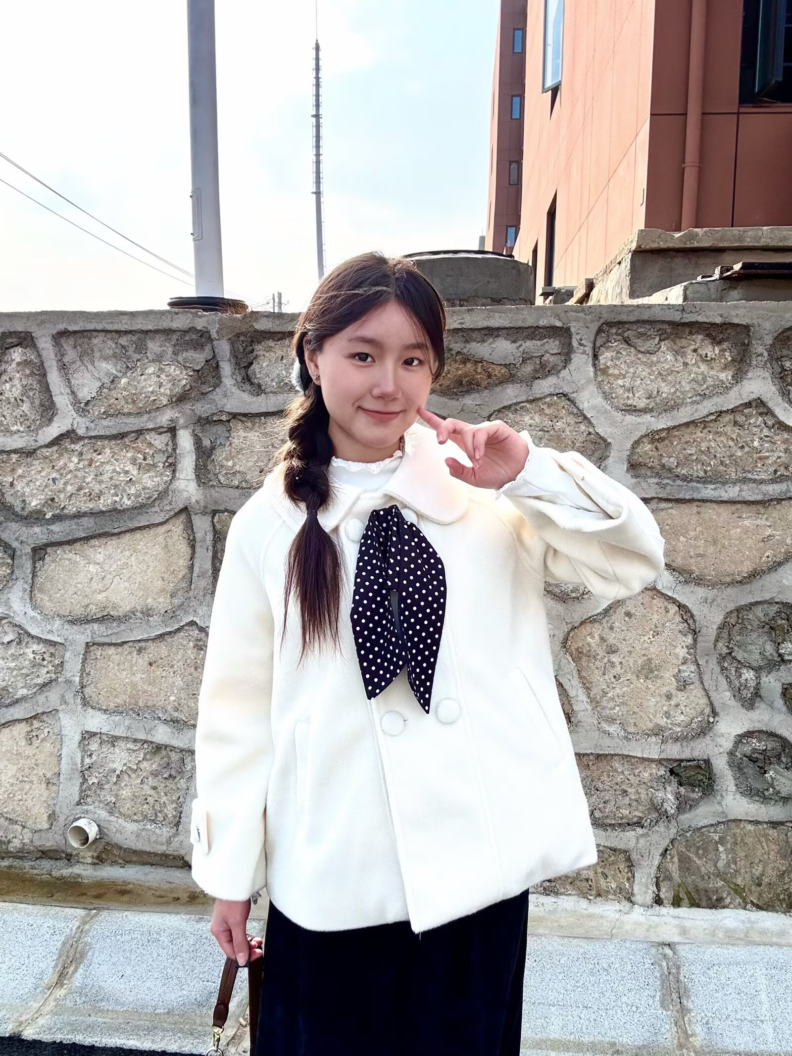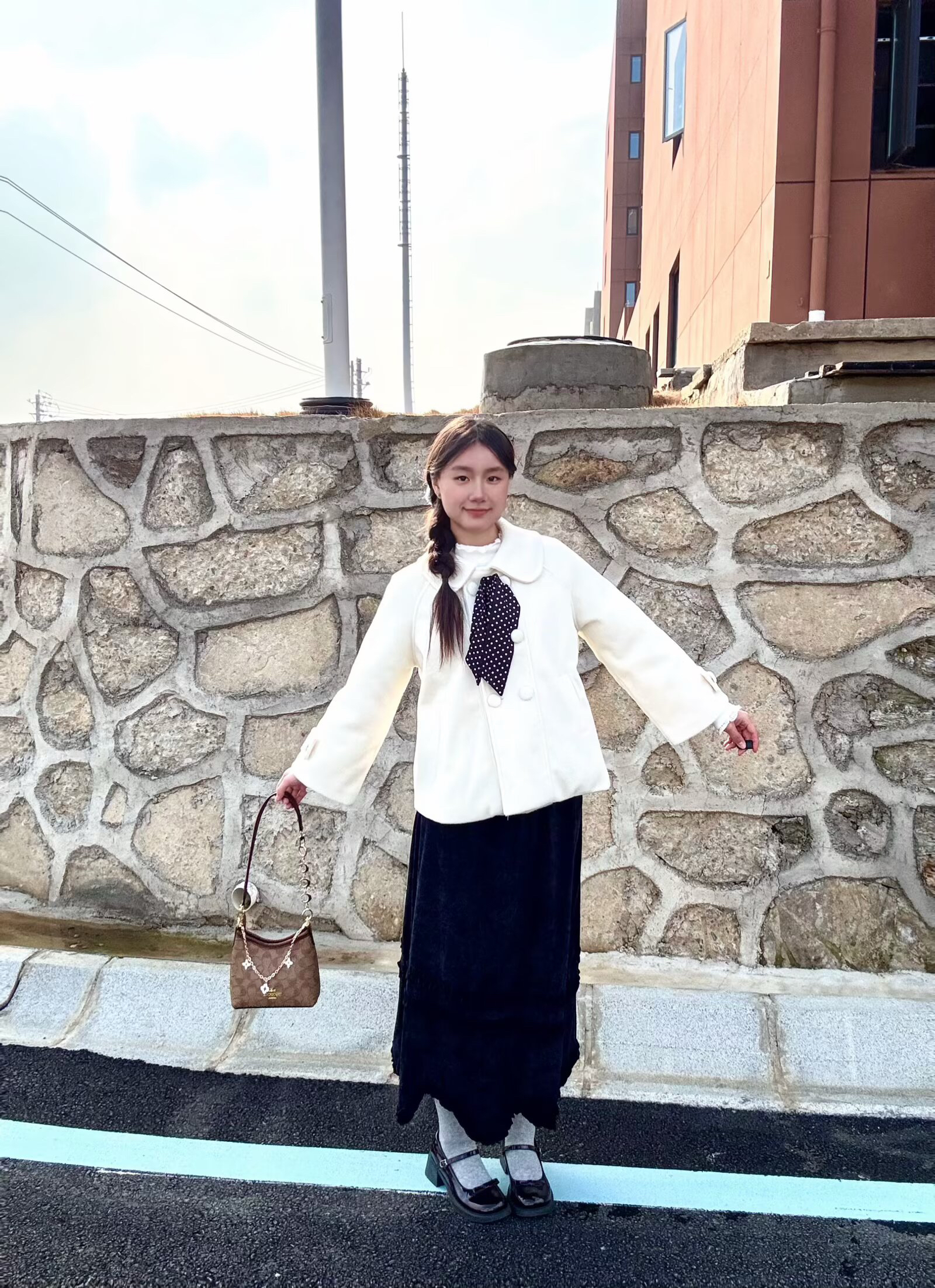 这件外套真的戳中我的少女心~米白色短款软乎乎的,娃娃领设计自带甜妹滤镜,搭配波点领结瞬间添了几分复古精致感🤩下装我搭了黑色大摆长裙,把我的腿粗都藏住啦😉裙摆垂坠感绝了,走起来飘飘的超有氛围感!整套搭配不挑身材,小个子穿显比例,微胖姐妹也能轻松驾驭,日常出街、约会穿都超合适。黑白经典配色还不用费脑搭配饰,拎个复古小包包,踩上乐福鞋,千金大小姐的感觉就来啦🥳