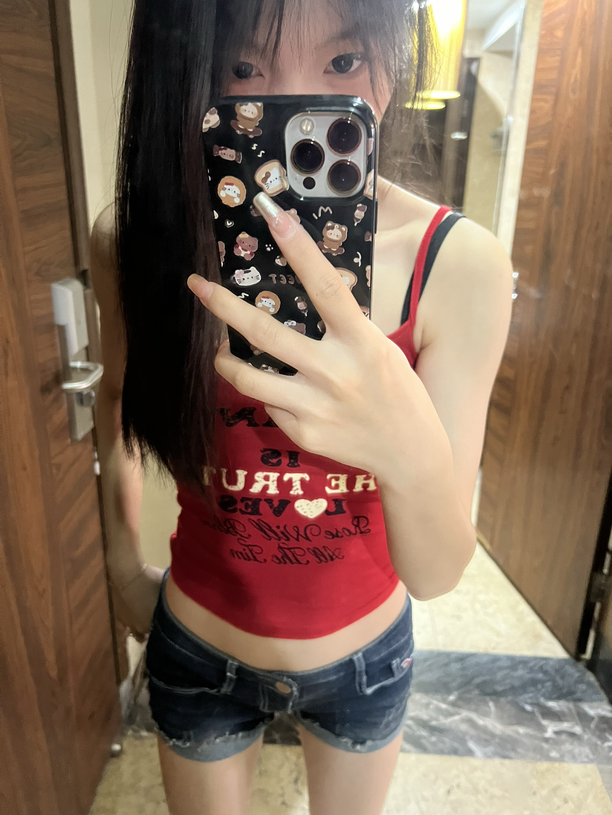 今日人设:甜辣双修的氛围感美女! 红色吊带是本命战袍,低腰短裤把比例焊在身上!