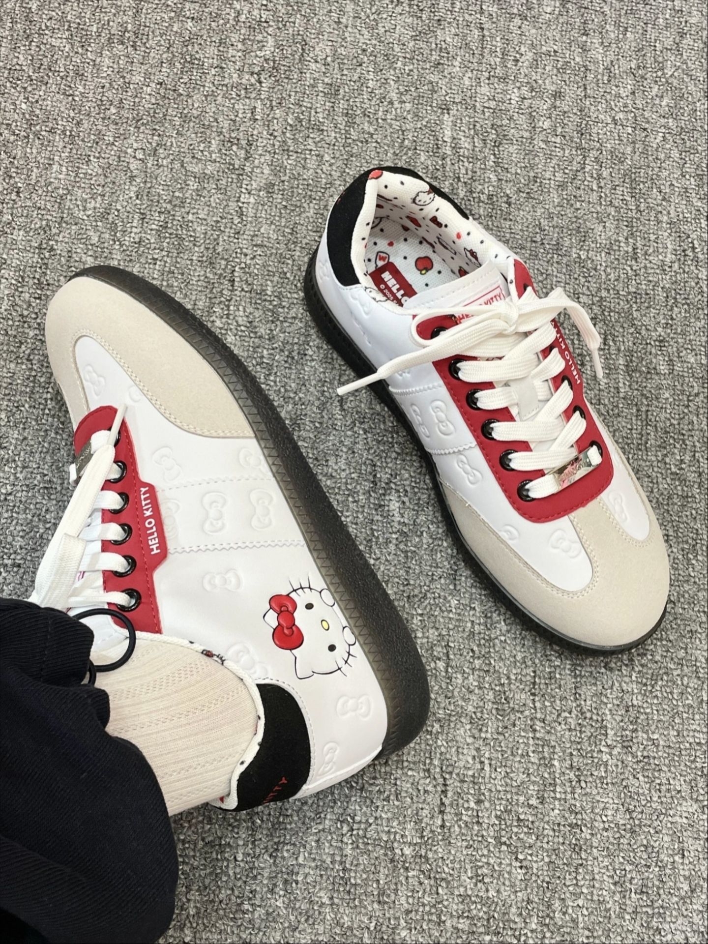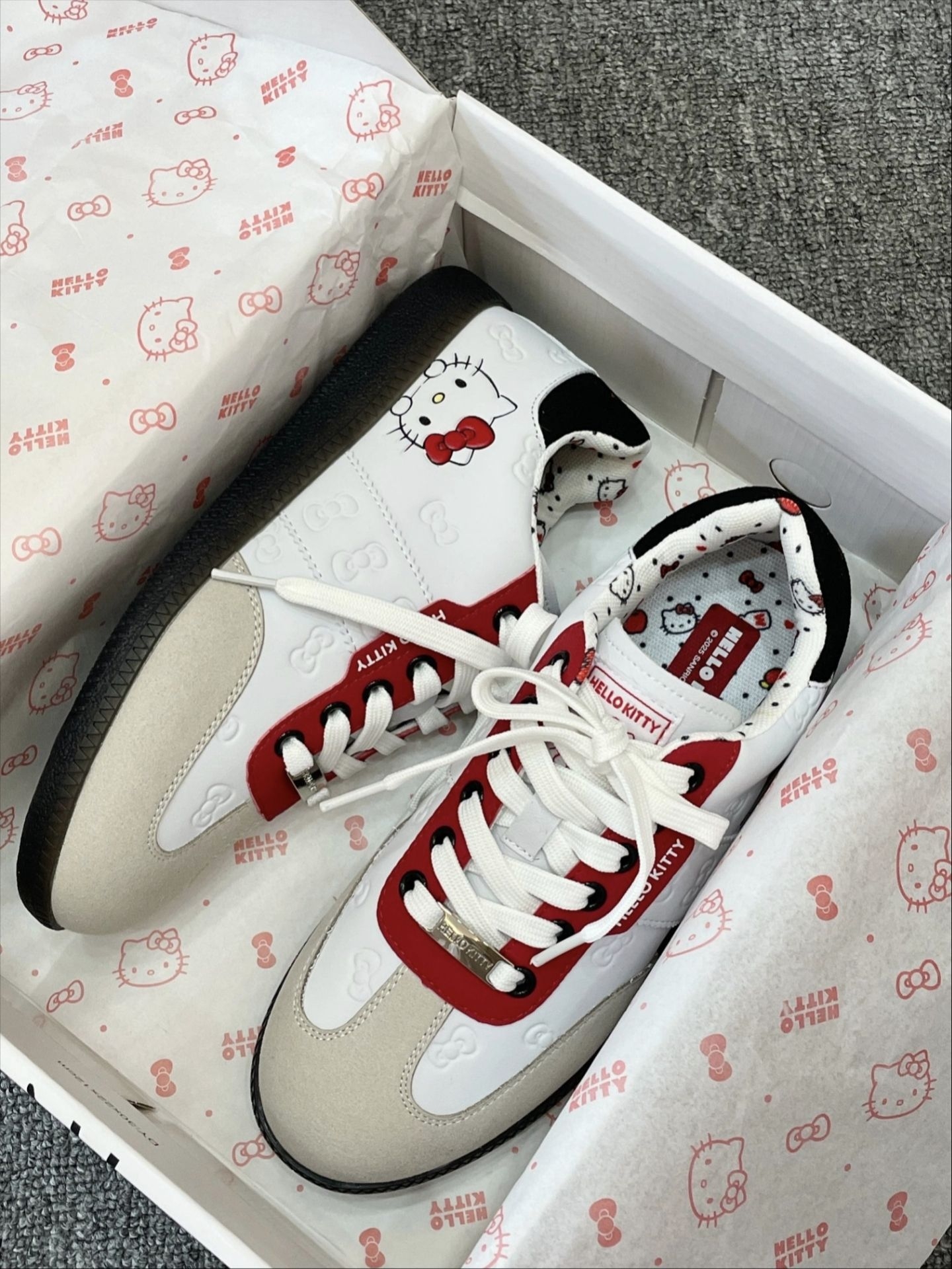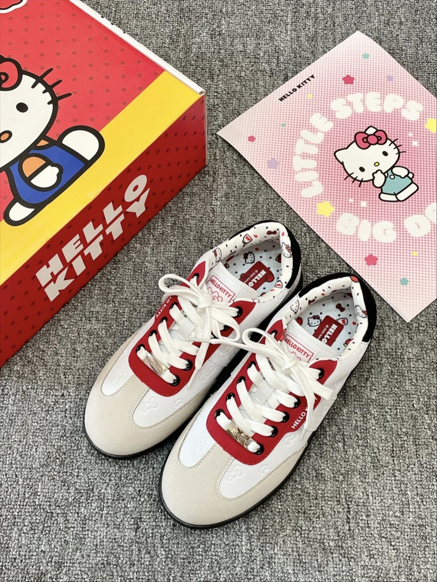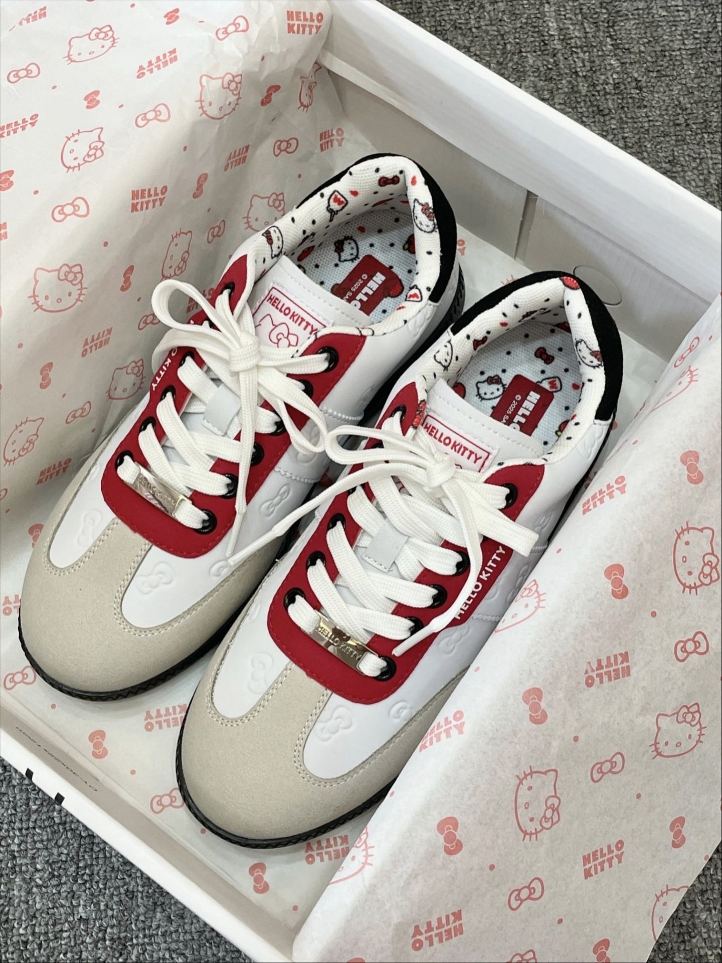 粗门约会一整个萌住~介个KT猫鞋子真是颜值爆表,经典红白配色超亮眼,随便搭配都出片! 鞋型做得特别正,穿上立刻显得脚型秀气小巧,完全不挑脚型。内里全是悄悄藏着的猫咪印花,每步都踩在可爱点上~上脚软软糯糯的,逛街暴走也不累脚,日常出门好穿又轻便。 还配有专属礼盒包装,新年送闺蜜、送女朋友都超合适,一份装满少女心的礼物,谁收到不会甜甜一笑呀!