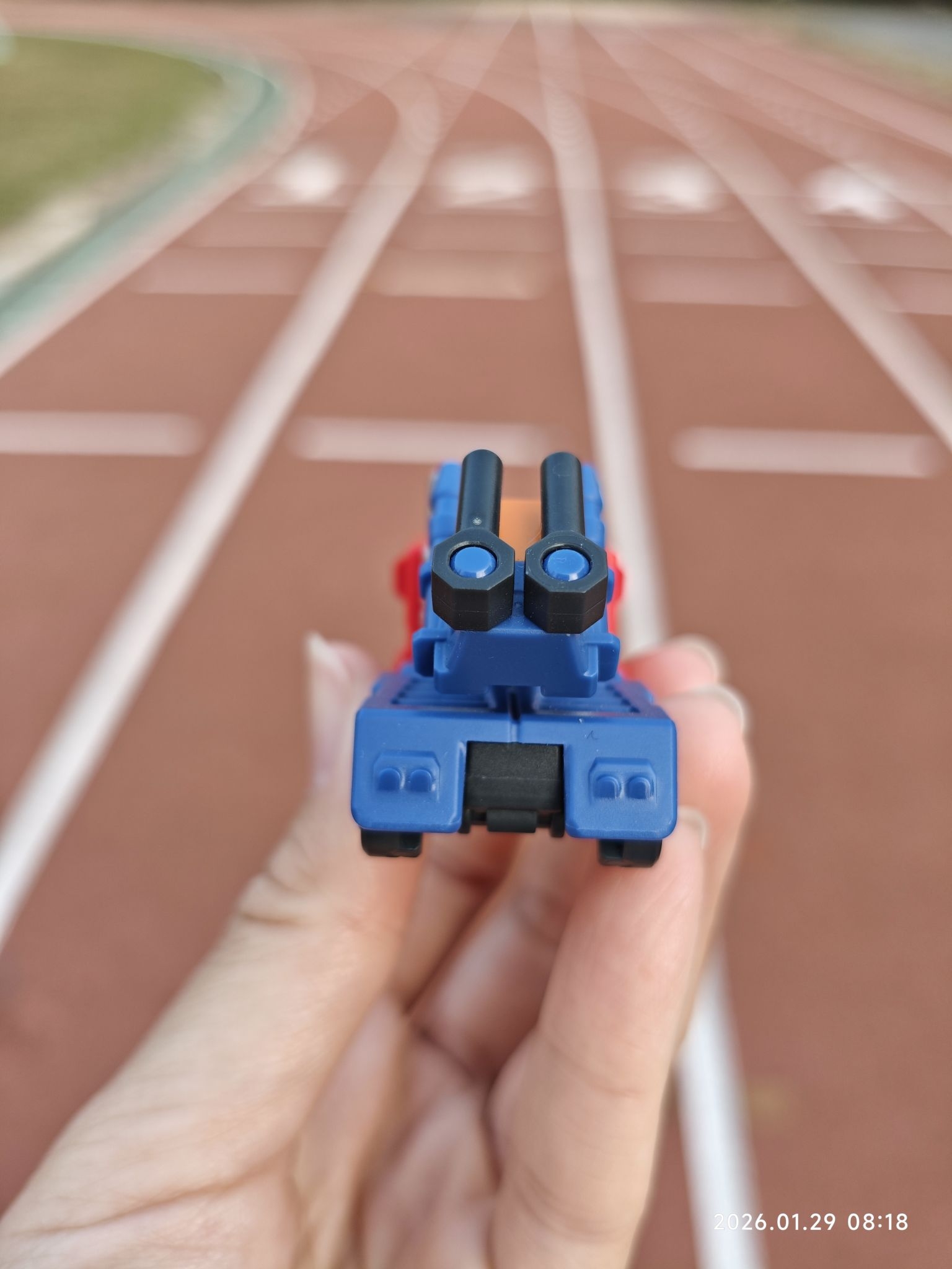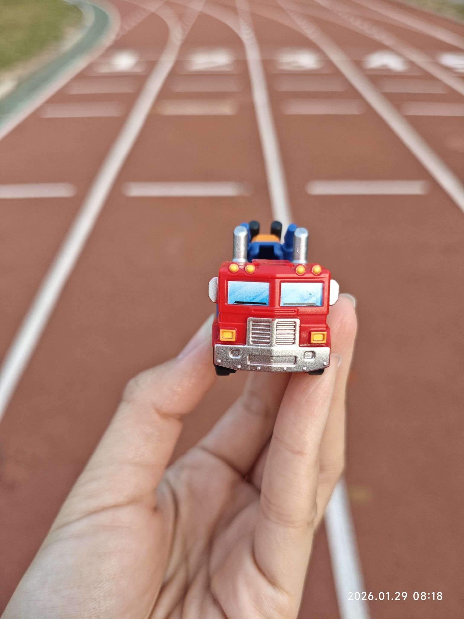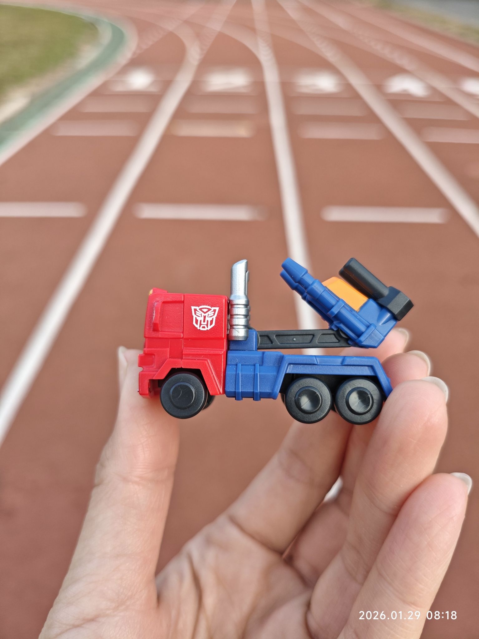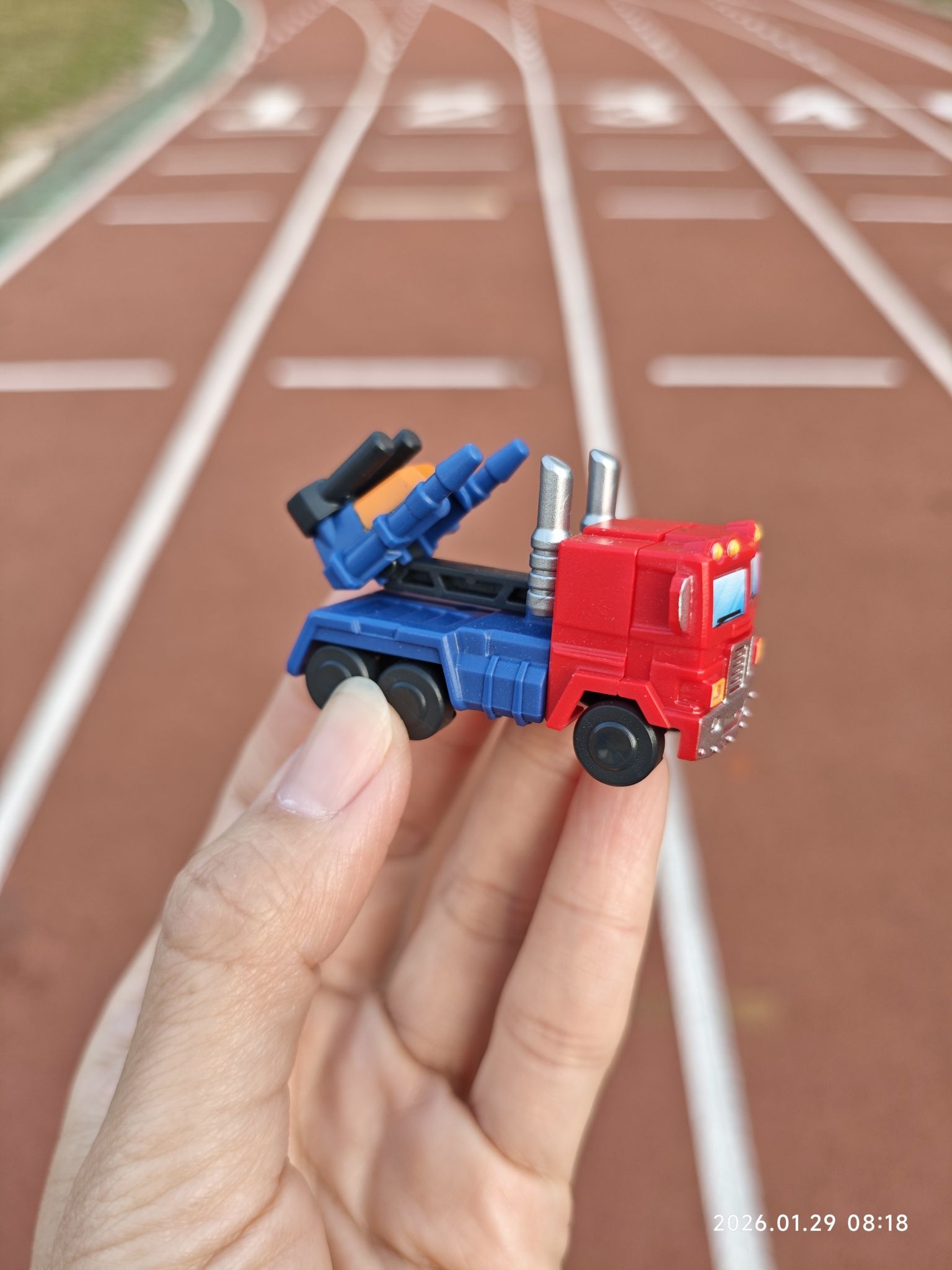 带我的迷你擎天柱来操场晒晒太阳~ 红蓝色的经典配色,放在掌心刚好的尺寸,是潮玩收藏里的治愈小物没错了。 今天也是被童年回忆击中的一天🚚