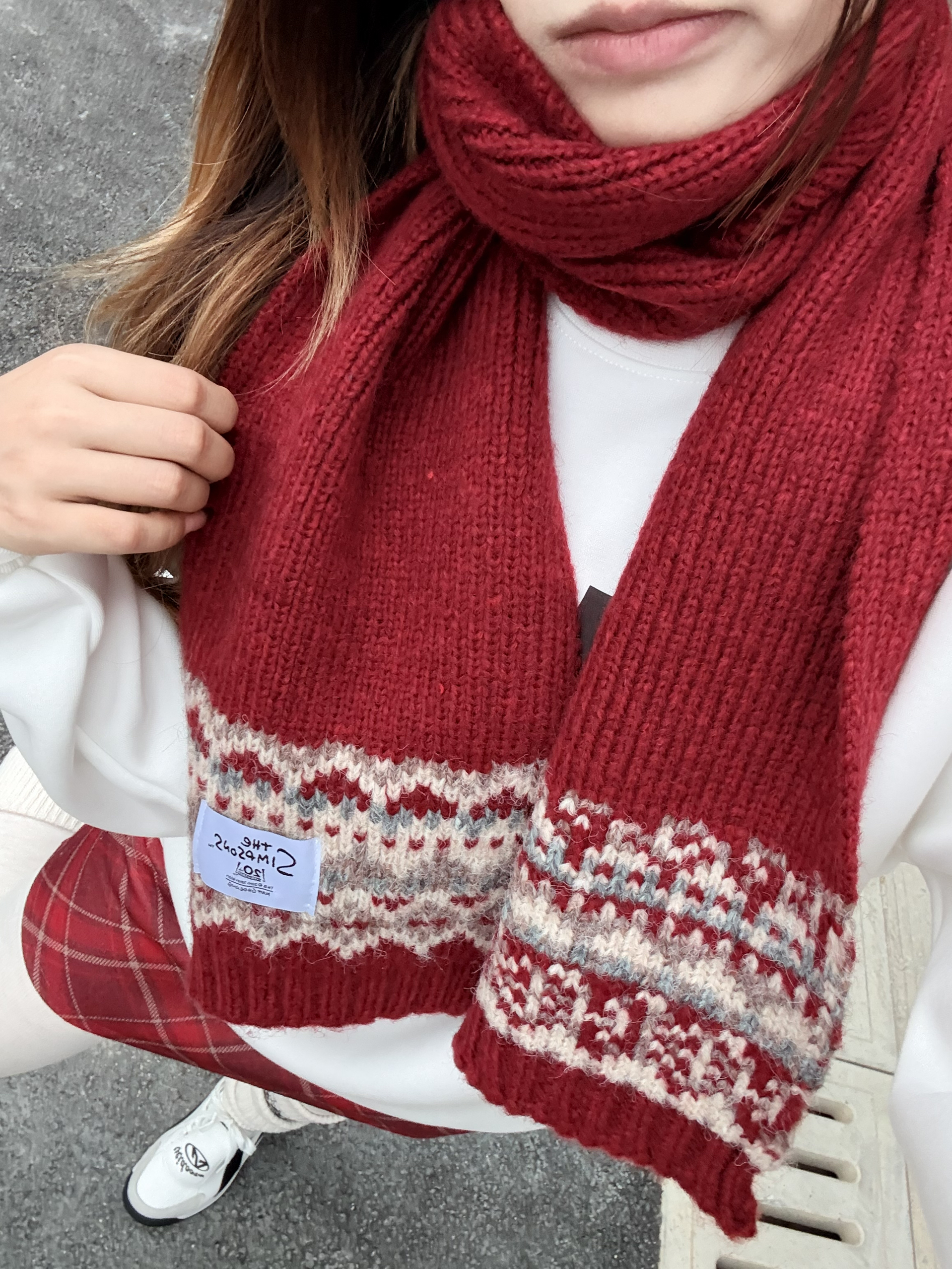 这条费尔岛红围巾也太有复古甜美感了🧣 软糯糯的羊毛混纺材质,围上脖子就像被小熊抱了一下,超暖和。🐩 经典的费尔岛提花纹路+酒红色调,自带复古滤镜✨ 💡 我的万能搭法: • 随意绕两圈+冷帽 → 美式校园松弛感 • 搭在大衣外 → 韩系慵懒氛围感
