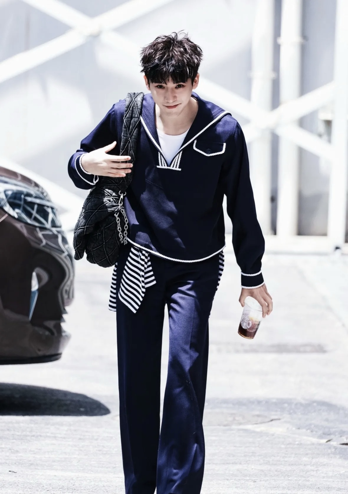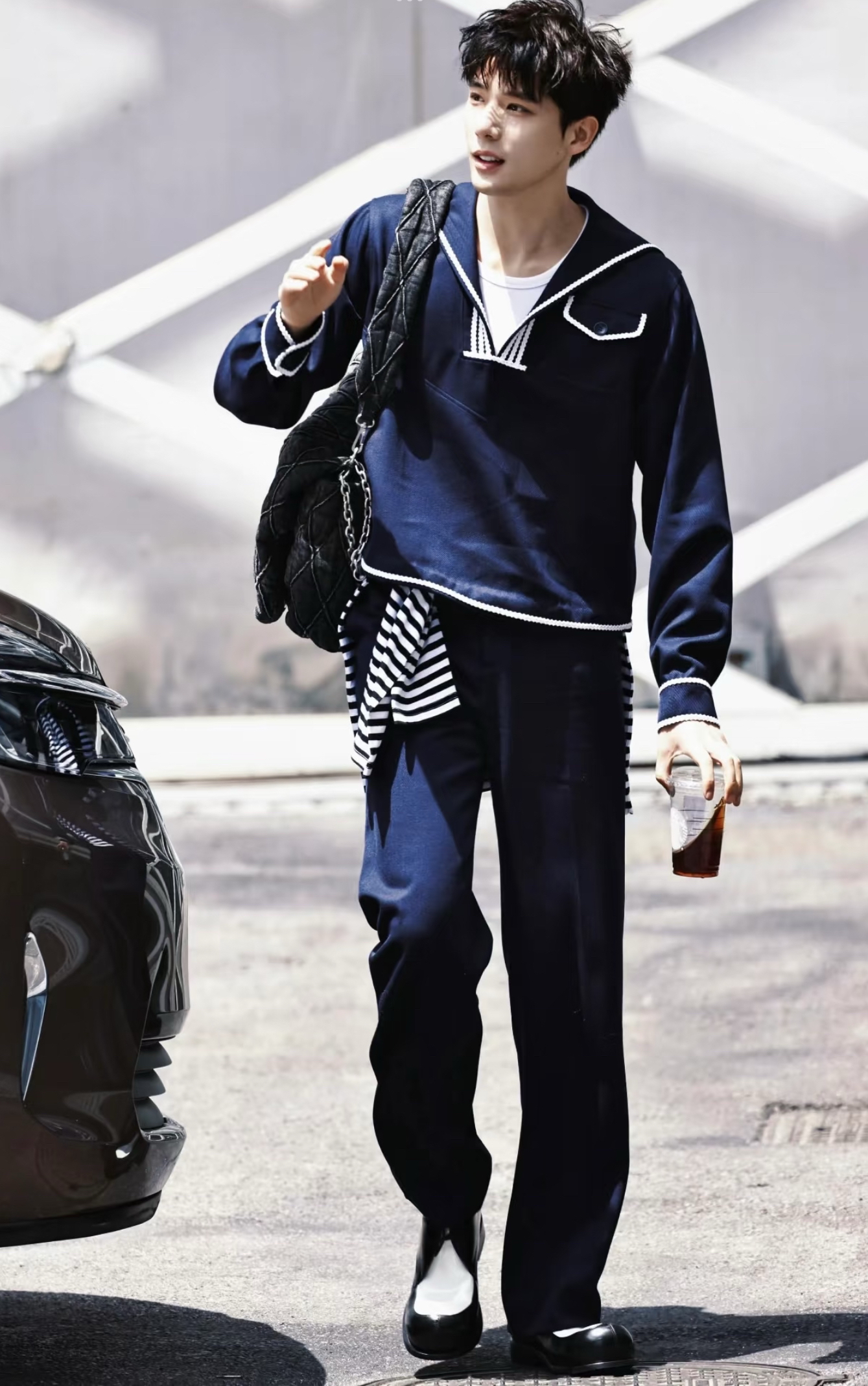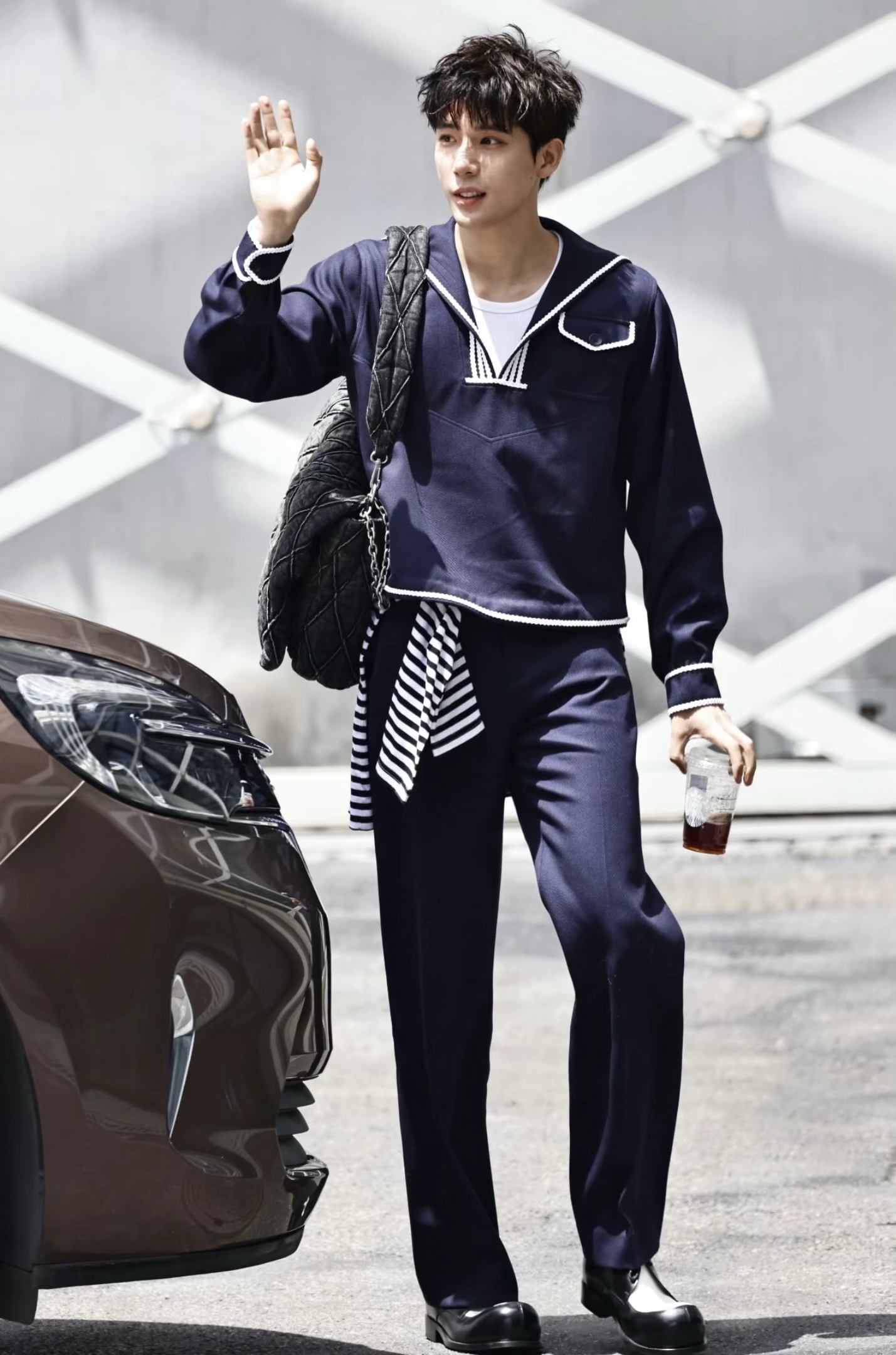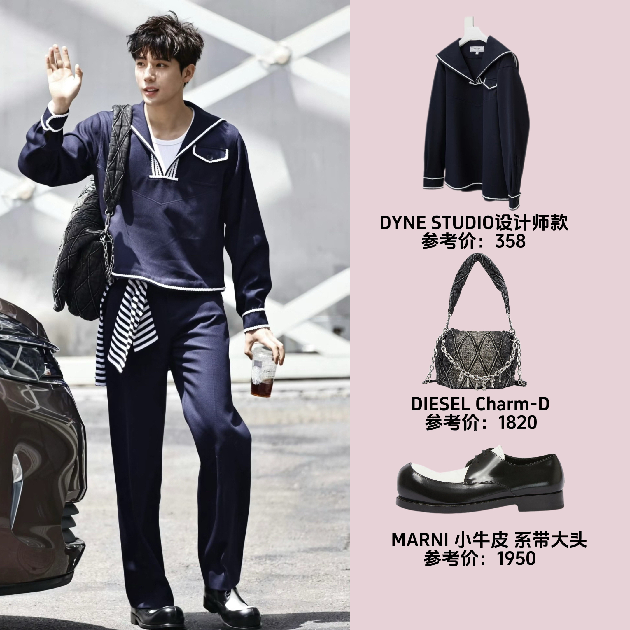 谁懂啊!王安宇这身学院风穿搭,直接把少年感焊在了身上! 🧥 单品拆解 • 上衣:DYNE STUDIO 藏青海军领针织衫 白边撞色太有复古学院那味儿了,短款版型还能悄悄拉长比例。 • 裤子:同系列藏青阔腿裤 垂坠感拉满,走路带风还藏肉,梨形身材直接抄作业。 • 包包:DIESEL Charm-D 腋下包 做旧牛仔+金属链条,给乖乖的学院风注入街头酷感。 • 鞋子:MARNI 小牛皮大头...
