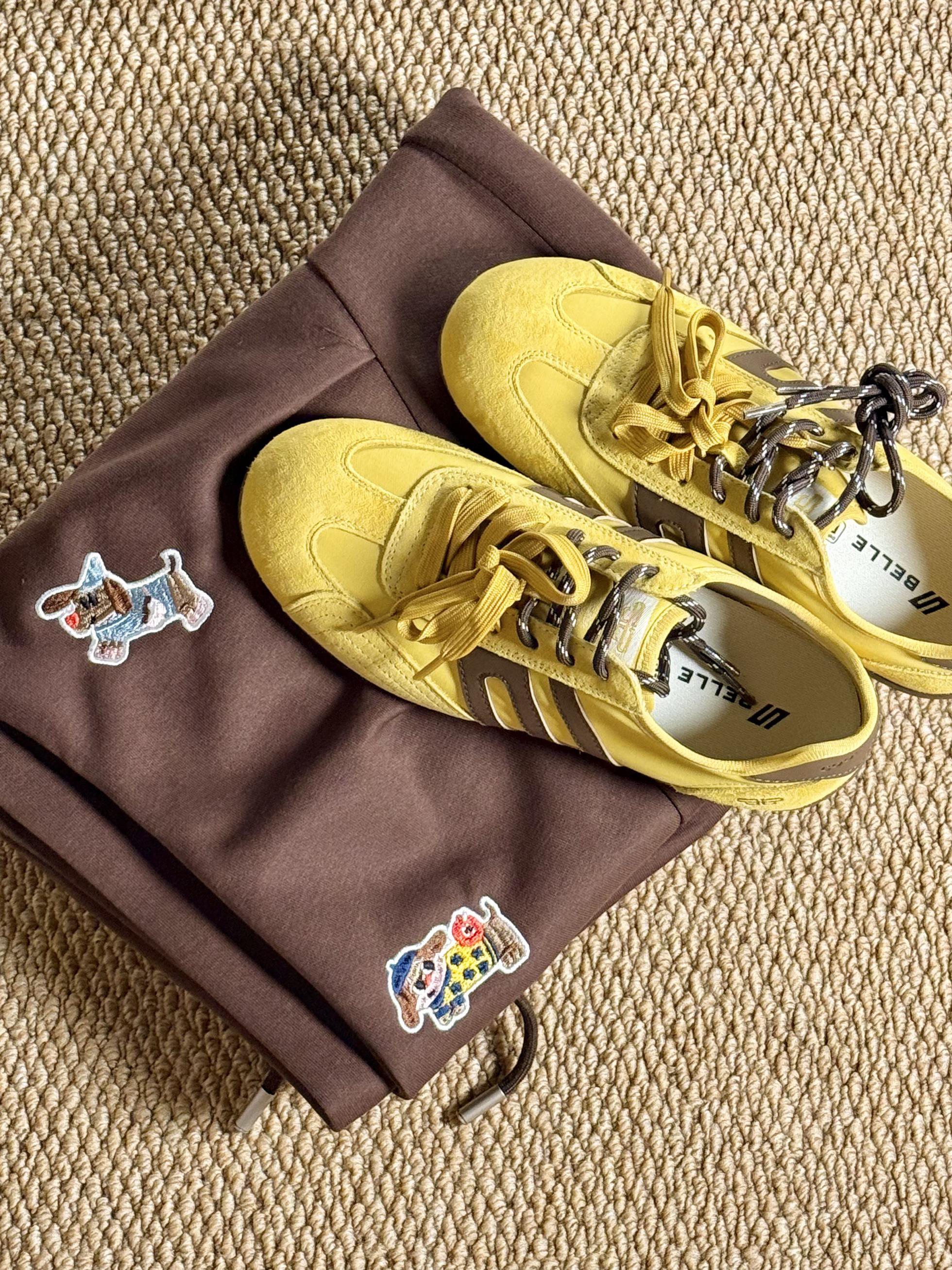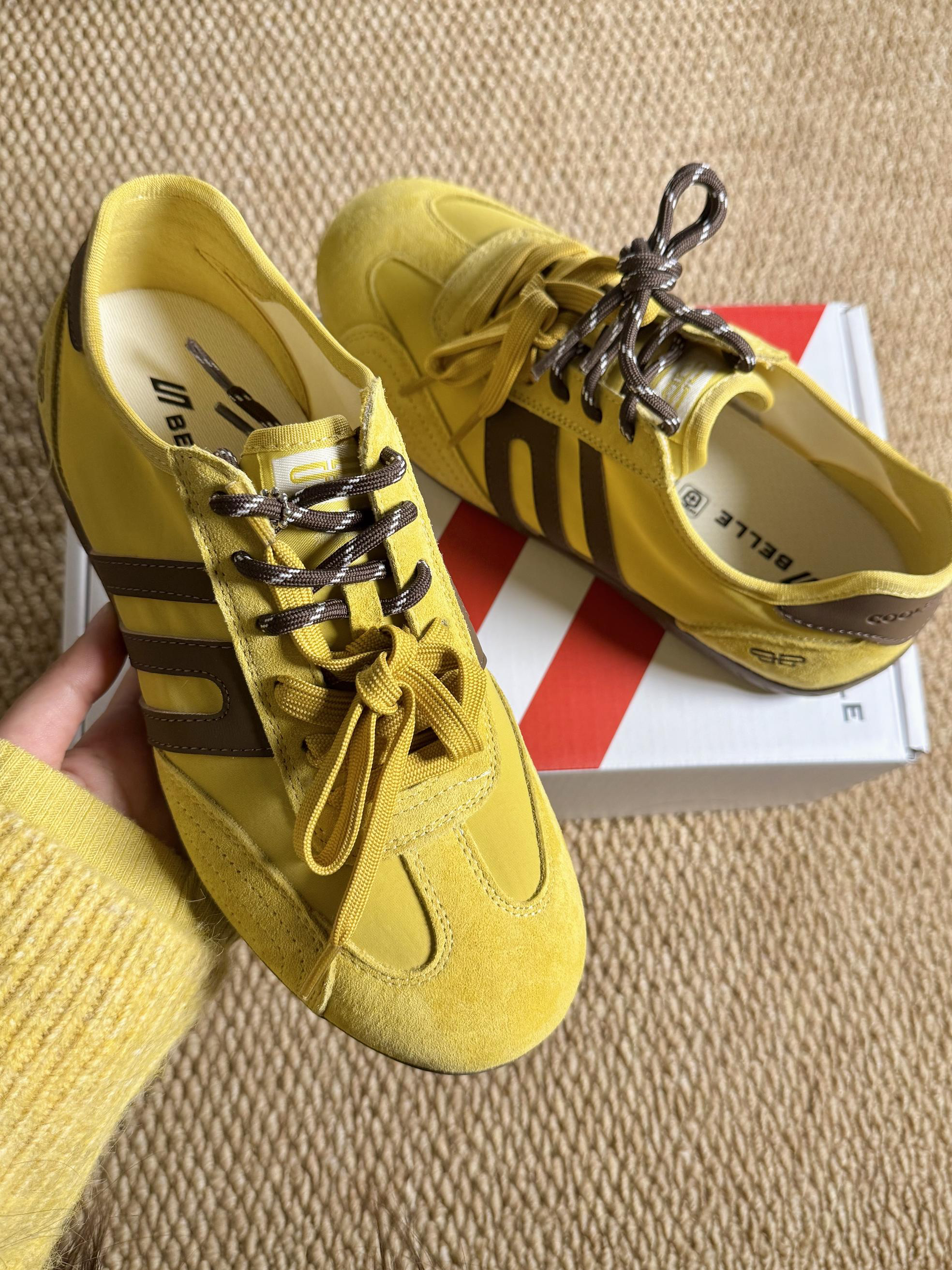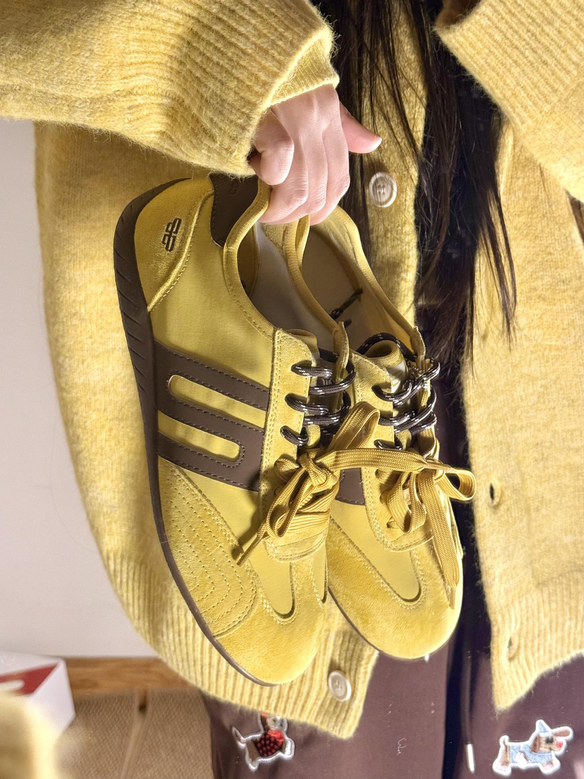 “家人们!我又买鞋了!🛍️ 但这双百丽黄油色德训鞋,真的是买值了! ✅ 优点 • 颜色太戳了!是那种温柔又显白的黄油黄,配牛仔裤、运动裤、小裙子都超和谐! • 麂皮+网布的材质,软乎乎的,上脚就像踩在棉花上,暴走一天都不累。 • 双鞋带设计!黄色+咖色的组合,系法随便换,甜酷风格一键切换。 • 鞋底是那种软弹的橡胶底,抓地力够,走在湿滑路面也不慌。 ❌ 缺点 • 麂皮材质有点娇贵,下雨天不敢穿,脏...