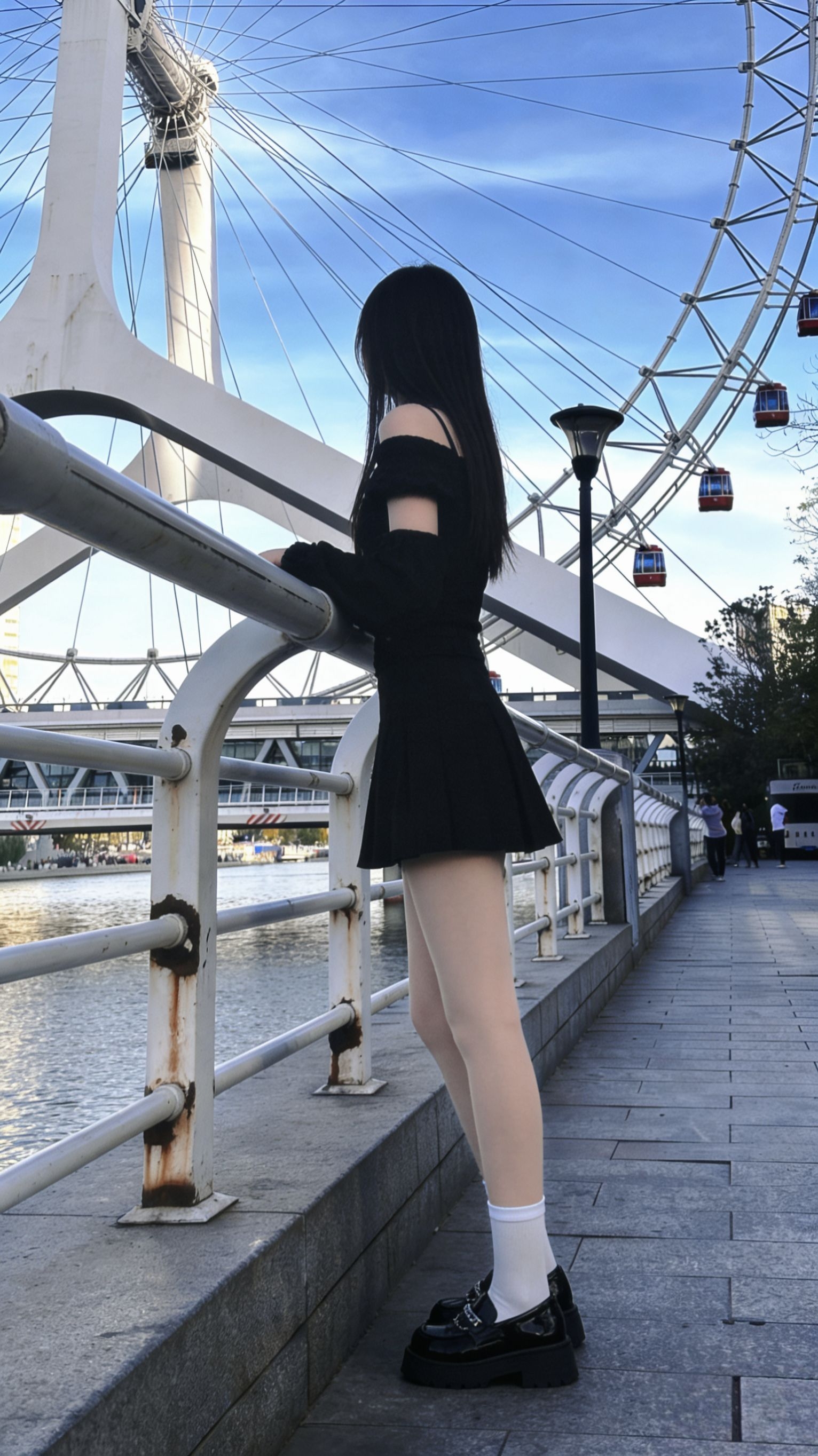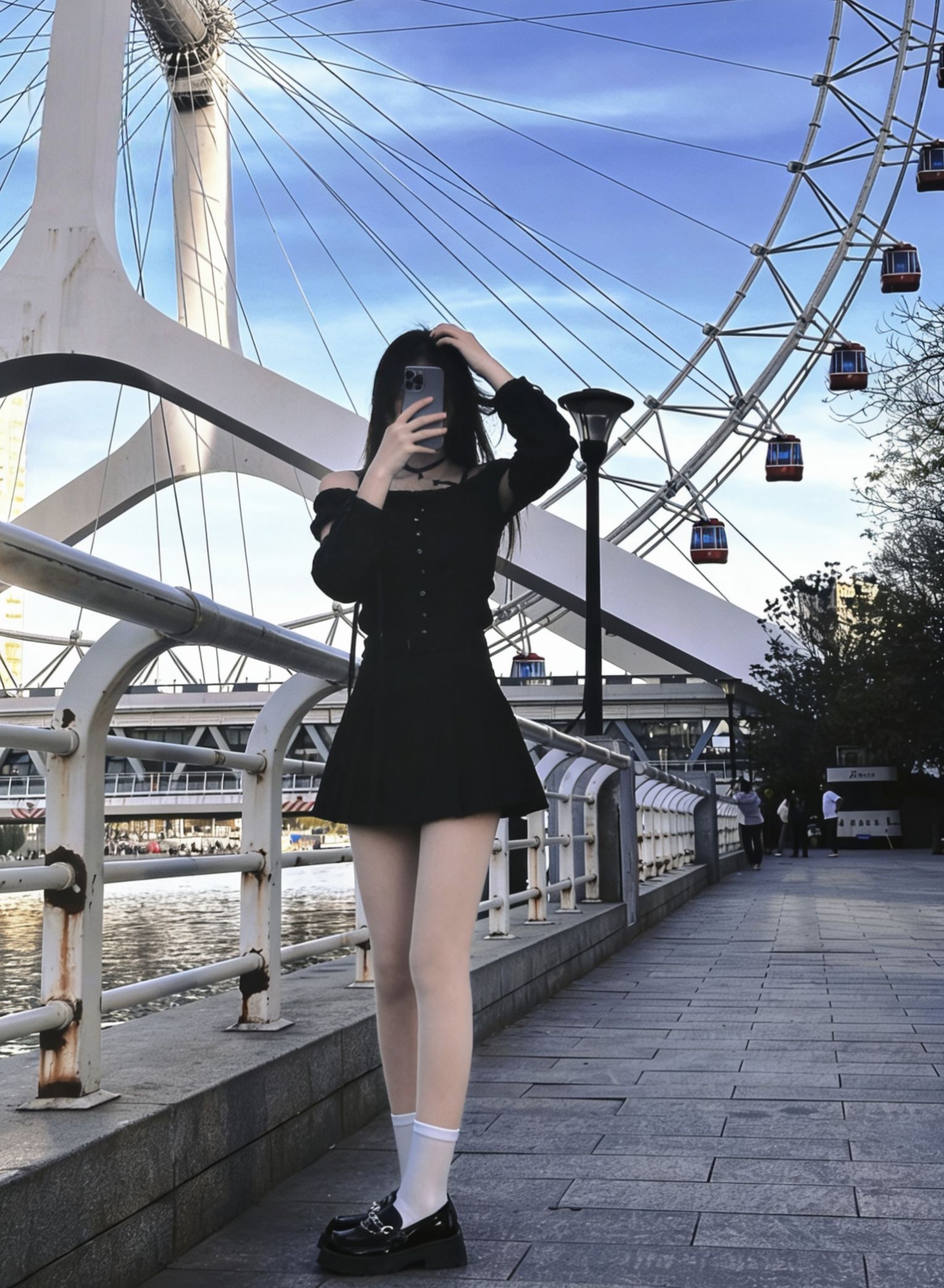 叠穿白袜真的是点睛之笔! 既遮住了腿部瑕疵,又增加了穿搭层次感 搭配露肩设计的小黑裙,甜酷感直接拉满 江边拍照小技巧:侧身倚靠栏杆,手机挡脸更出片!