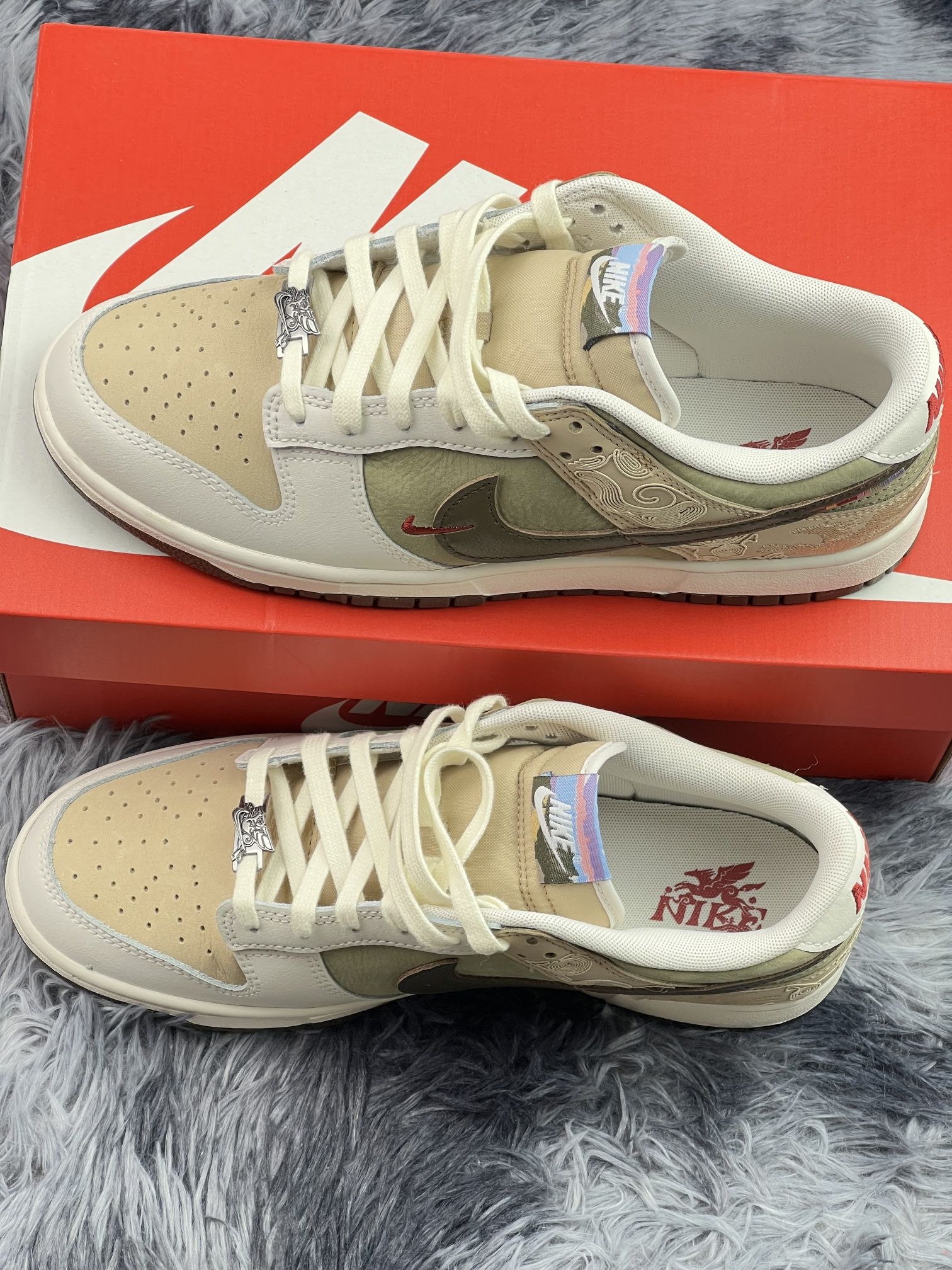 这双米棕配色的Dunk Low蛇年限定,拿到手第一感觉就是质感拉满,细腻的翻毛皮+皮革拼接,还有侧面精致的祥云纹刺绣,国风细节直接戳中审美✨ 米棕拼色真的太温柔百搭了,配牛仔裤、工装裤、运动卫裤都毫无压力,日常出门随便套上就能走,选择困难症直接福音💯 在脚感方面,Dunk的经典板鞋脚感,前掌有轻微回弹,但后掌还是偏硬,长时间暴走的话脚底板会有点累,毕竟板鞋定位就是这样啦。 鞋头偏窄的问...