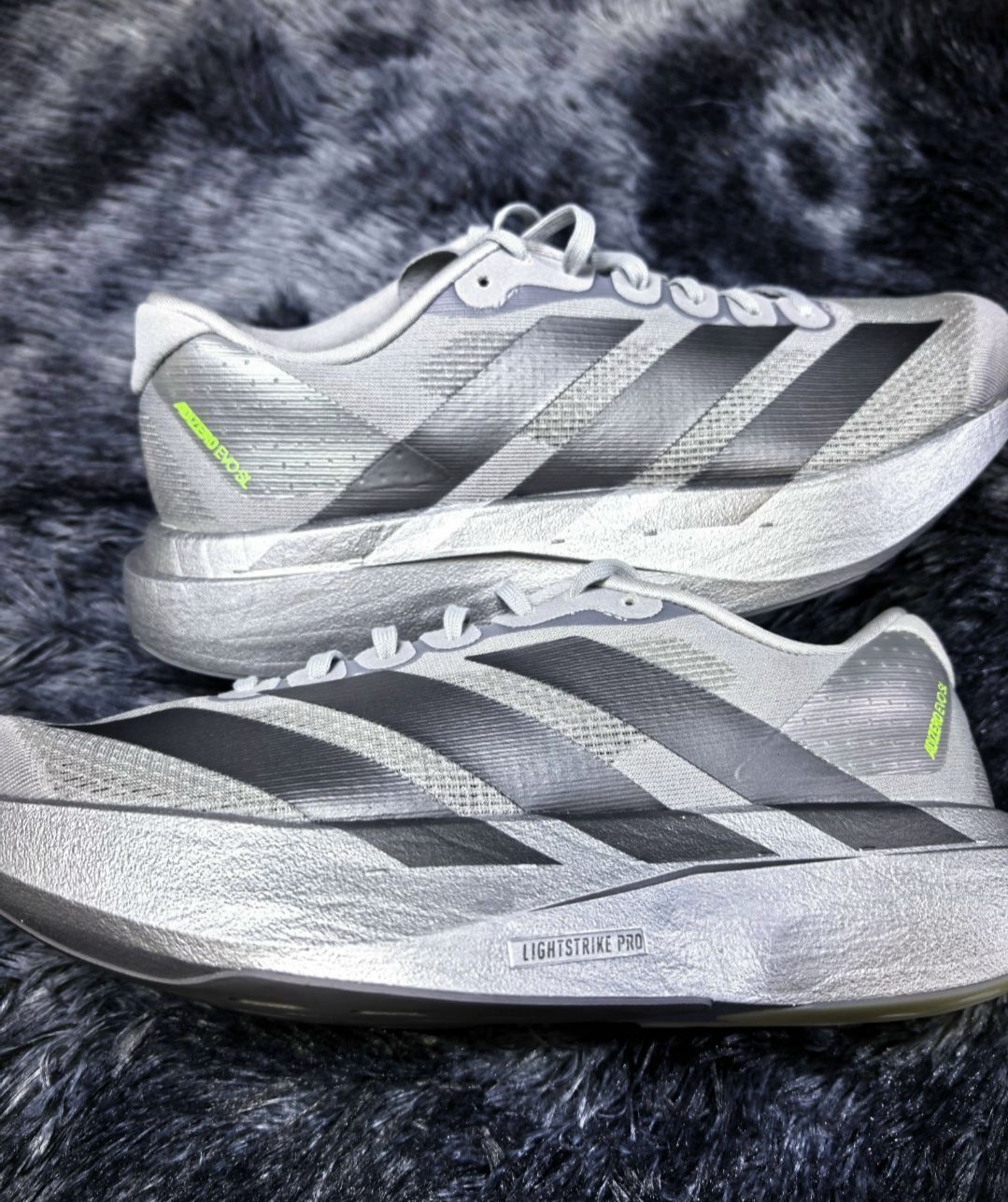 Adidas Adizero EVO SL:轻到离谱的竞速“飞毯” ✨ 颜值:未来感银翼战甲 这双鞋的银灰渐变配色充满科技感,哑光银基底搭配亮黑三条纹,再用荧光绿点缀细节,视觉上低调却极具辨识度。 鞋型纤薄低趴,线条流畅利落,既保留了竞速鞋的凌厉感,又多了一份未来机甲的酷感,无论是赛道还是日常出街都能成为焦点。 🛠️ 核心科技:为极致轻量化而生 - Lightstrike Pro中...