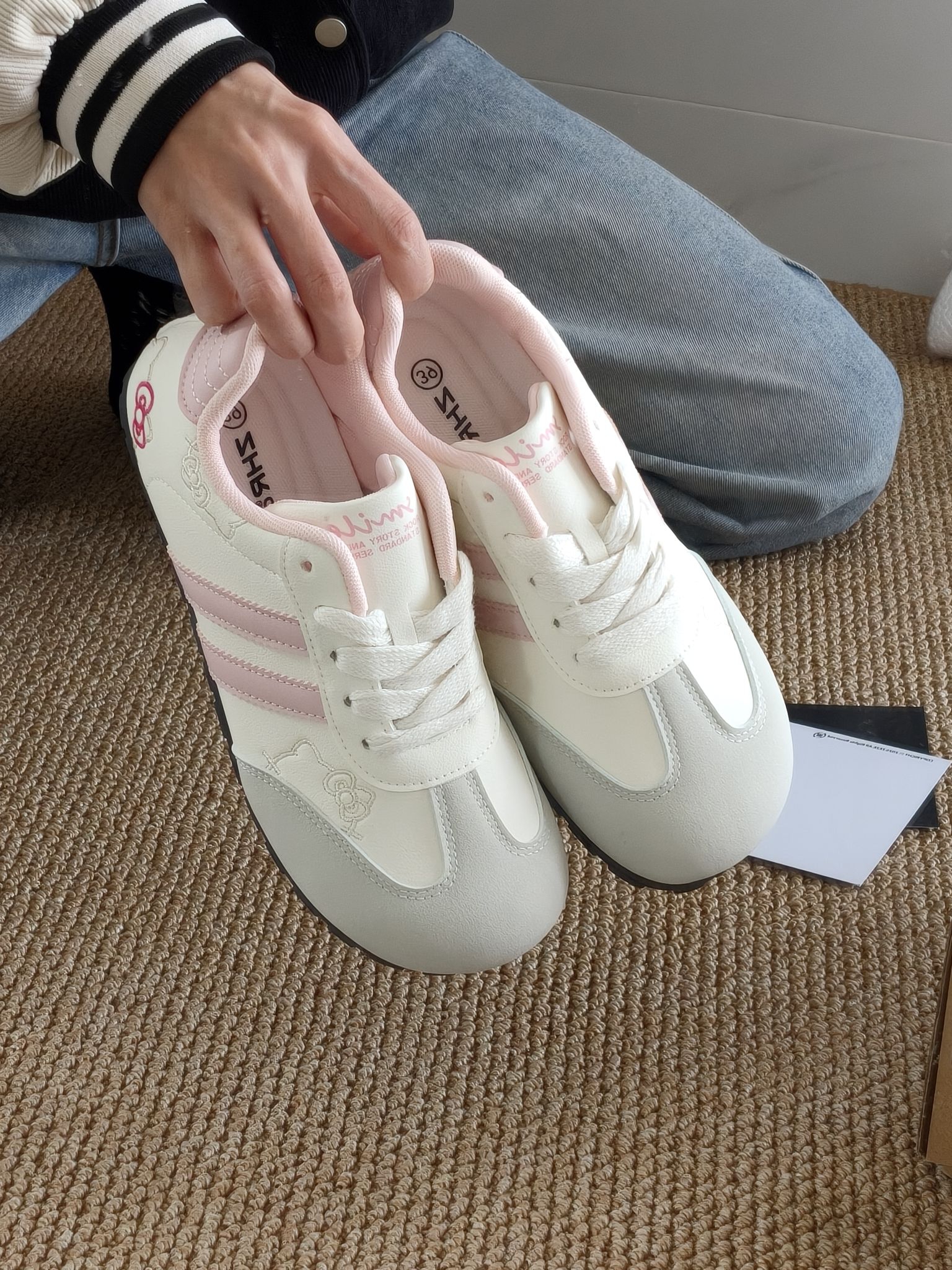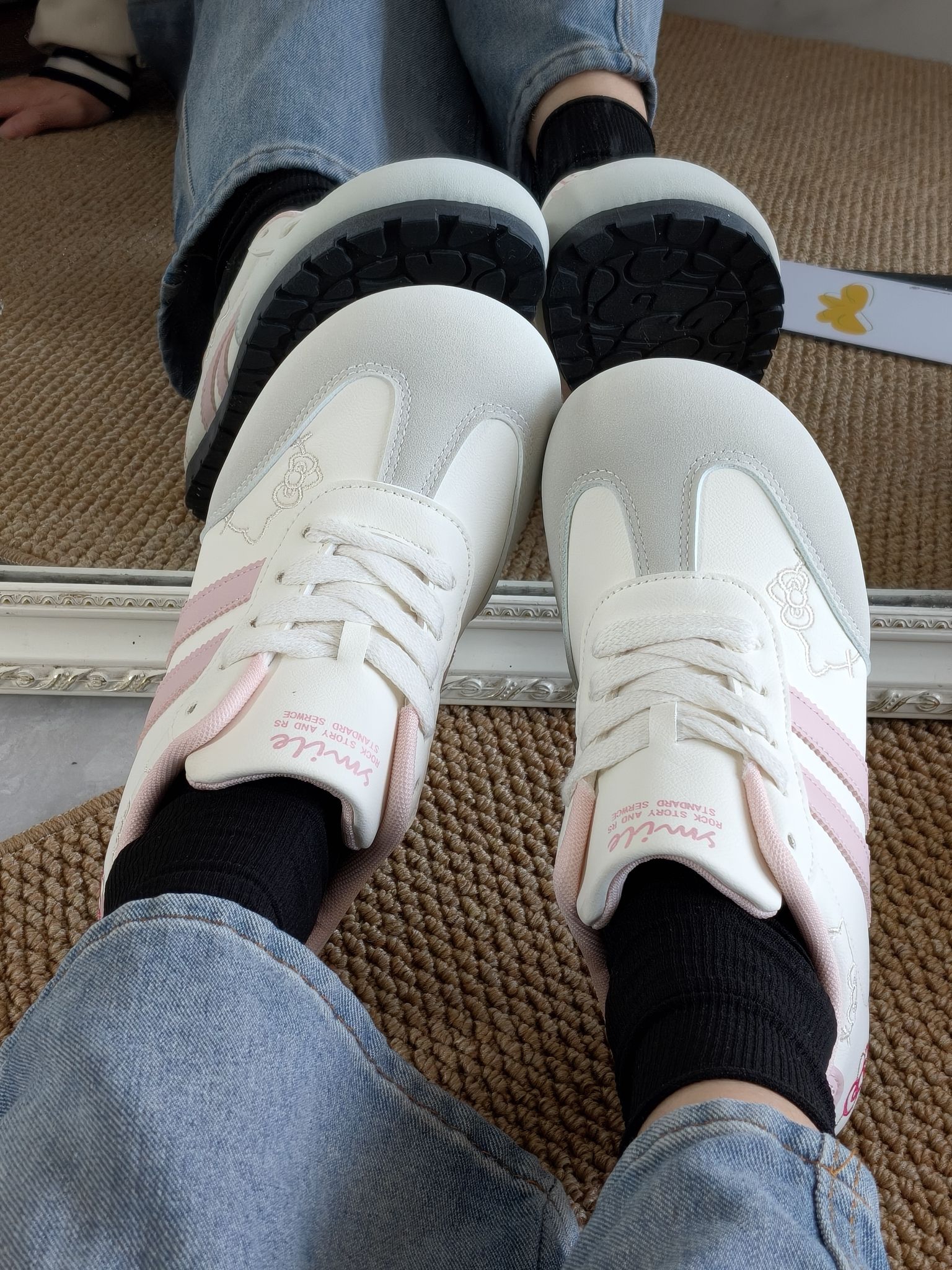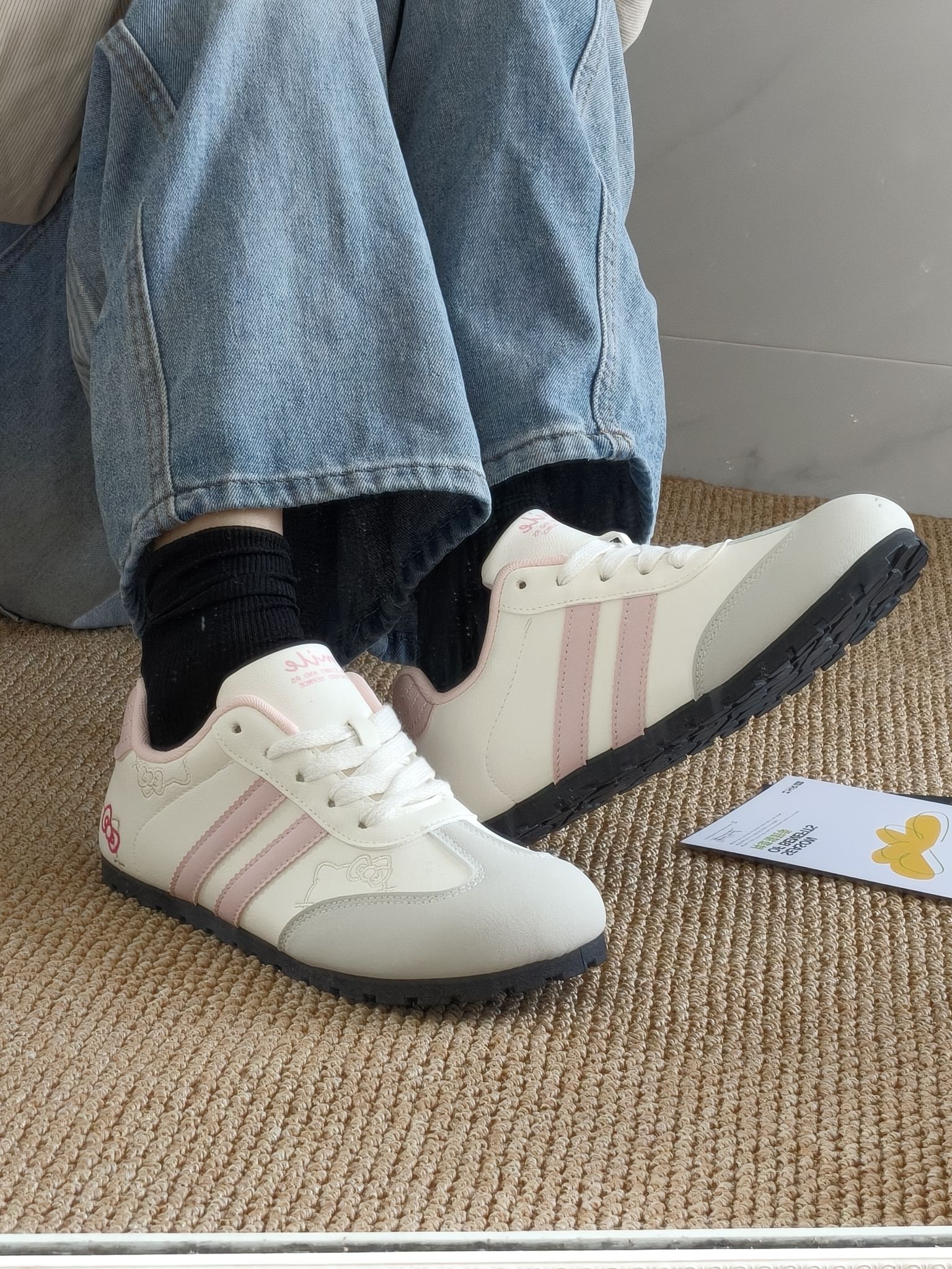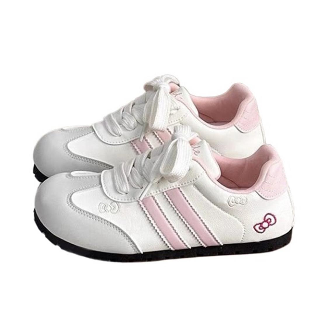 这双鞋糯叽叽的上脚简直太好看 白粉色的主要搭配 旁边添加了一点Hellokitty的元素 穿在脚上很舒服 最主要谁敢想! 这价格要什么自行车呀! 而且这个鞋子很百搭 不会出错 简直拿捏少女心💓