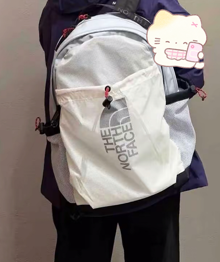 颜值在线:米白拼浅蓝+藏蓝的配色清新又百搭,既不会太沉闷,又自带户外感,日常通勤或短途出游都很出片。 实用设计:正面抽绳袋可以快速拿取帽子、雨伞等小物,两侧的网兜能稳稳放下水杯或饮料瓶,细节很贴心。 容量能打:主仓空间充足,装下笔记本电脑、换洗衣物和随身用品毫无压力,满足一天的出行需求。 材质耐用:北面的户外面料耐磨抗造,兼顾了轻便性和实用性,背起来不压肩,适合长时间背负。