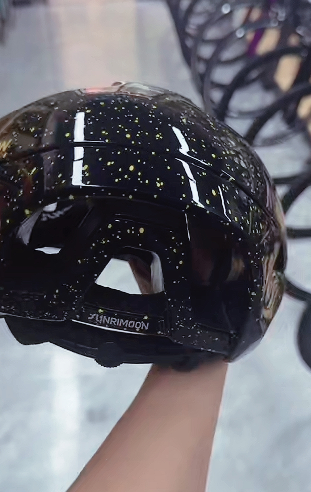 颜值拉满:黑金泼墨设计又酷又闪,在阳光下超有质感,骑车出门就是路上最靓的崽。 安全透气:一体成型的盔身防护性强,头顶的通风孔设计不闷汗,长时间骑行也舒服。 适配性高:调节扣能灵活适配不同头围,戴眼镜也不压镜腿,对女生特别友好。 细节贴心:内衬柔软亲肤还能拆洗,日常通勤、周末骑行都能稳稳拿捏。