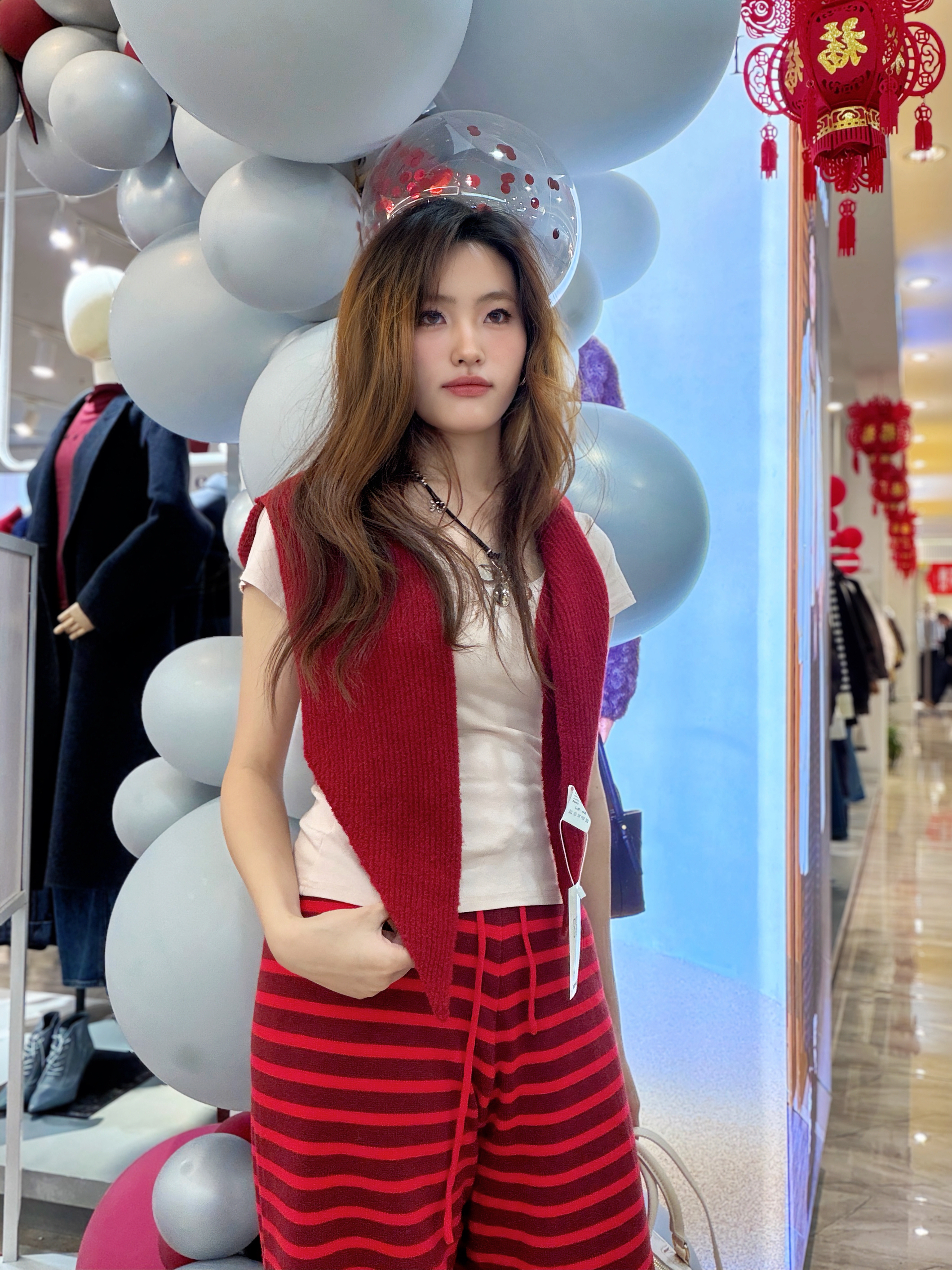 新年战袍已就位!这套红白配色真的太有节日氛围了~ 软乎乎的针织材质舒服到不想脱,马甲+帽子+围巾是一体的,一衣多穿超实用。 内搭的白色小T恤是弹力棉的,贴身但不紧绷,显身材又舒服。 红黑条纹裤垂感超棒,胯宽腿粗都能藏住,松紧腰对各种身材都友好。 整套穿下来就是松弛又喜庆,走亲访友、逛庙会都合适,拍照也超出片! 新的一年就要穿得红红火火,好运一整年~