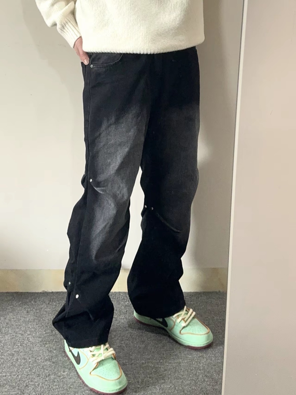 这条日系复古牛仔裤,褶皱与铆钉交织出街头随性风,水洗工艺让每一寸布都诉说着时光的故事,穿上它,仿佛漫步在东京的黄昏街头。