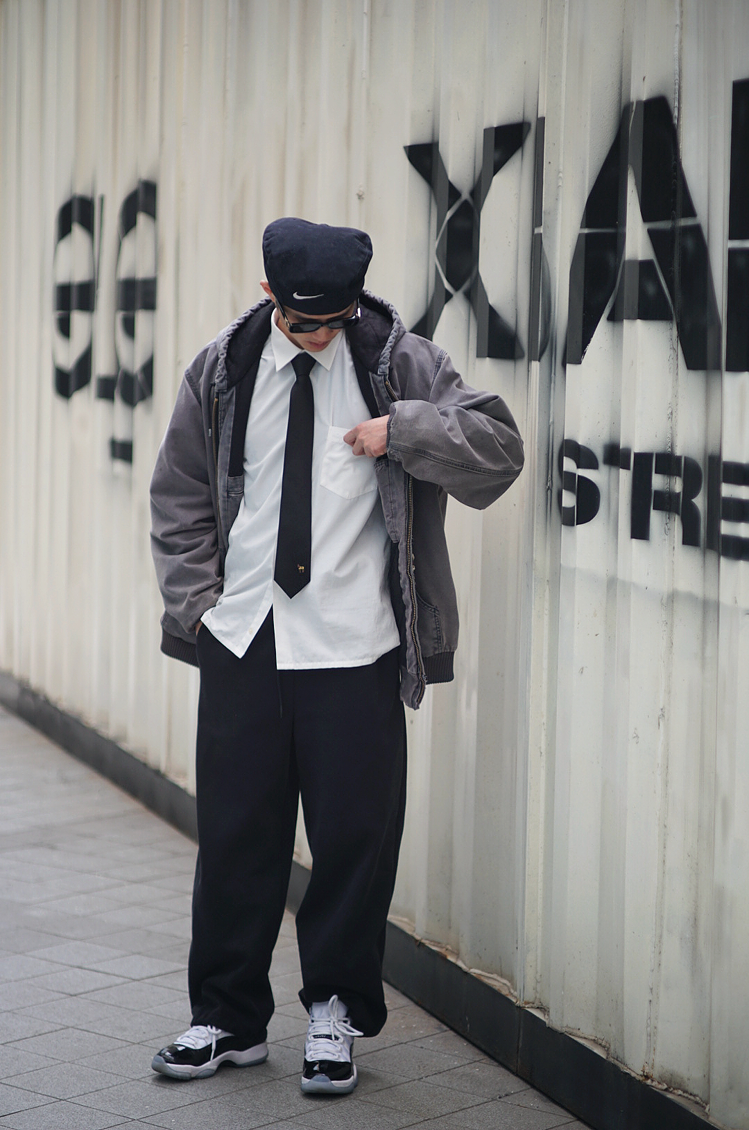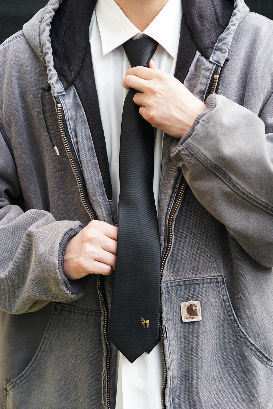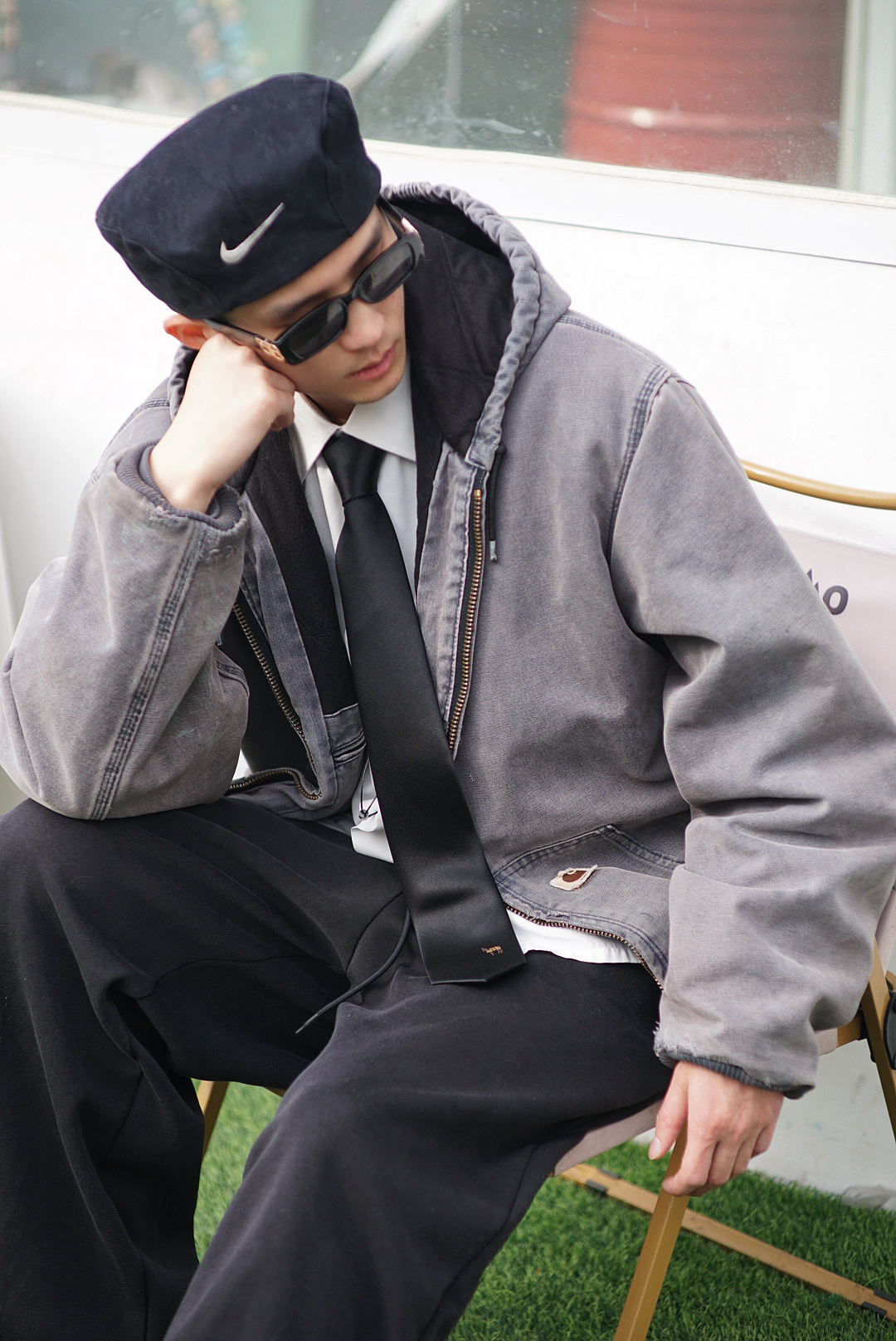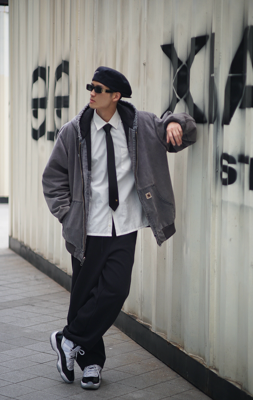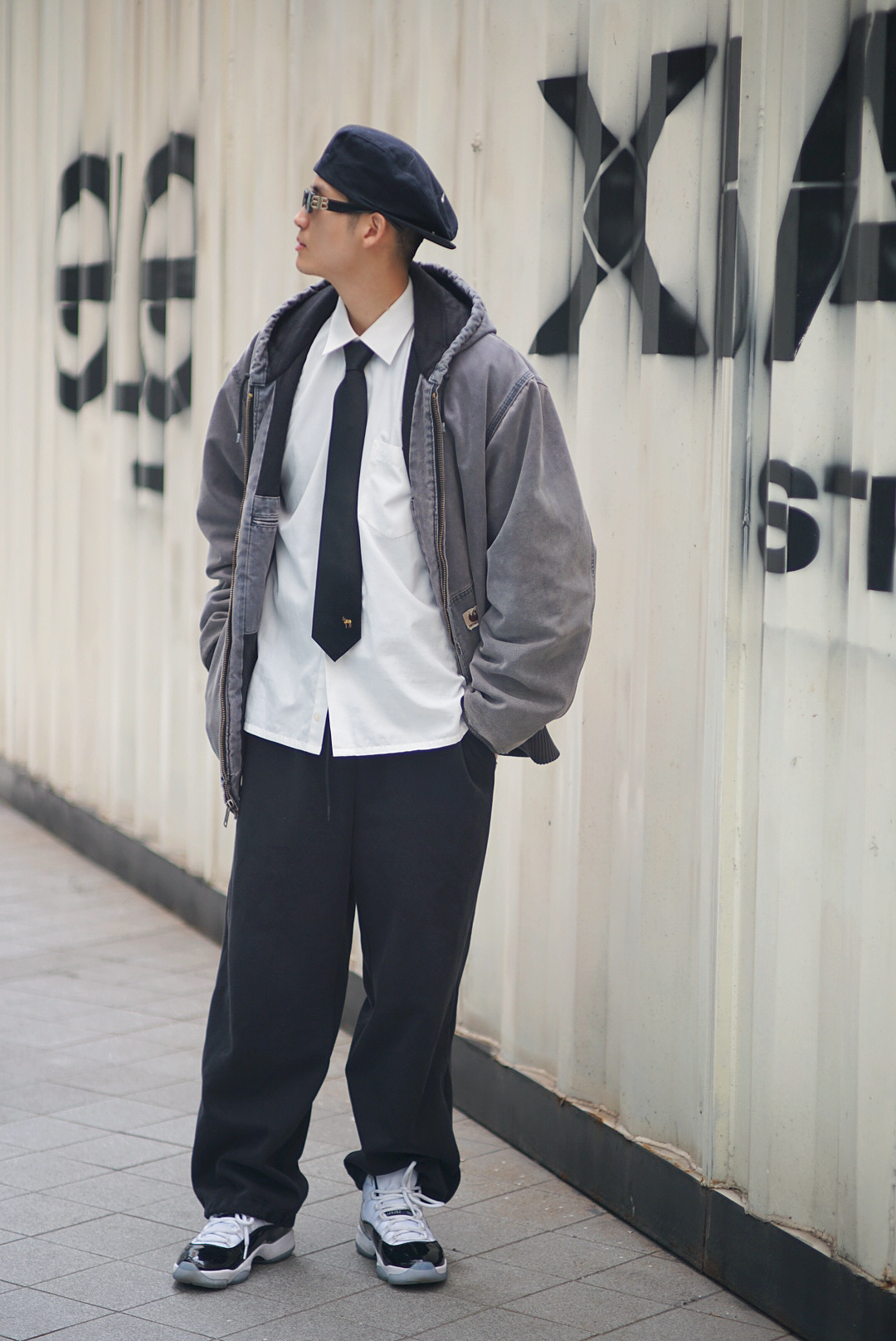 打破穿搭边界!卡哈特连帽夹克不再是纯工装标配,叠穿衬衫 + 领带,领带的加入增加一丝精致感,玩转雅痞街头风。贝雷帽加持,弱化工装粗犷感,拉高整体造型精致度,复古氛围感拉满,通勤出街一键切换。