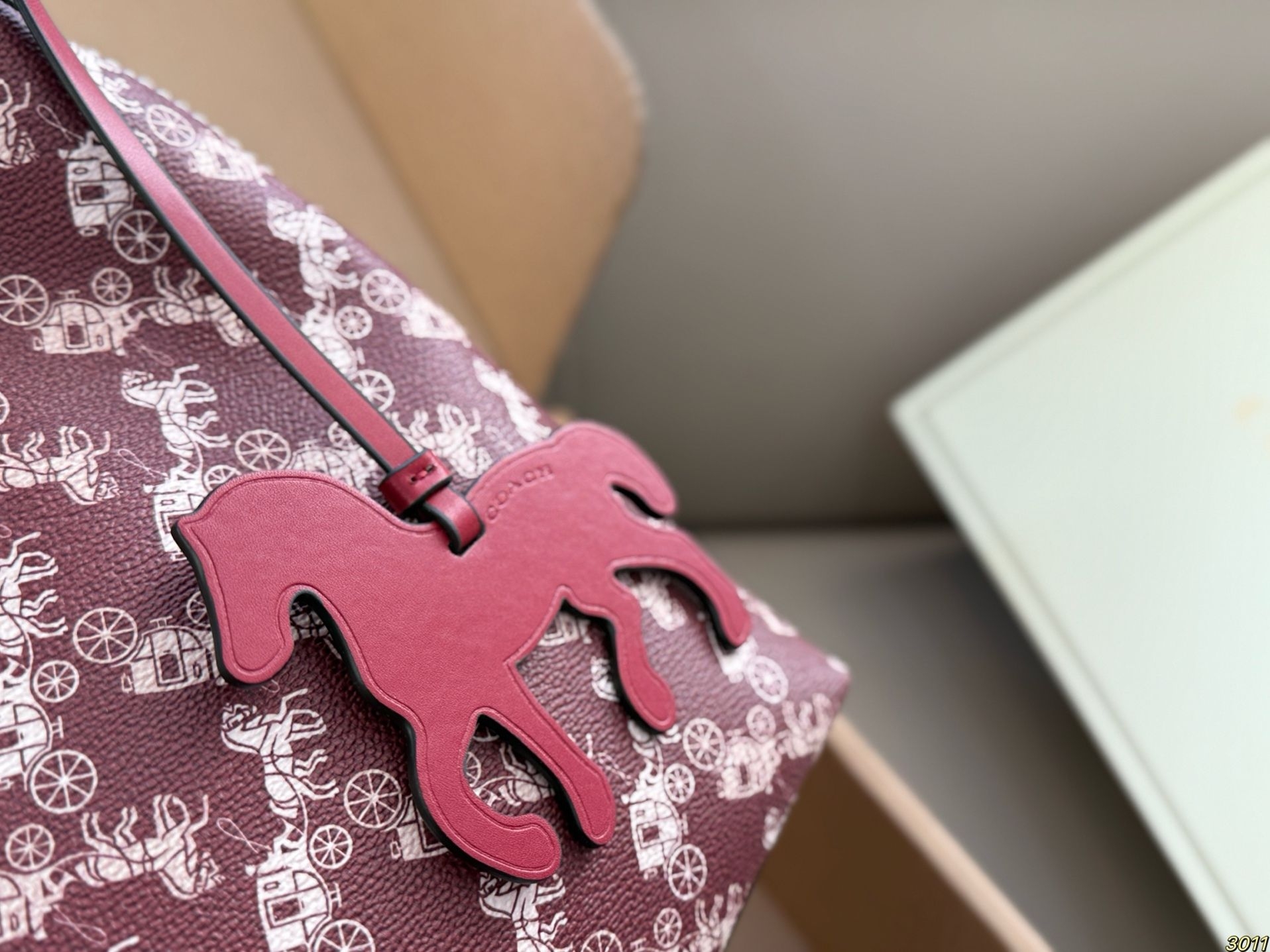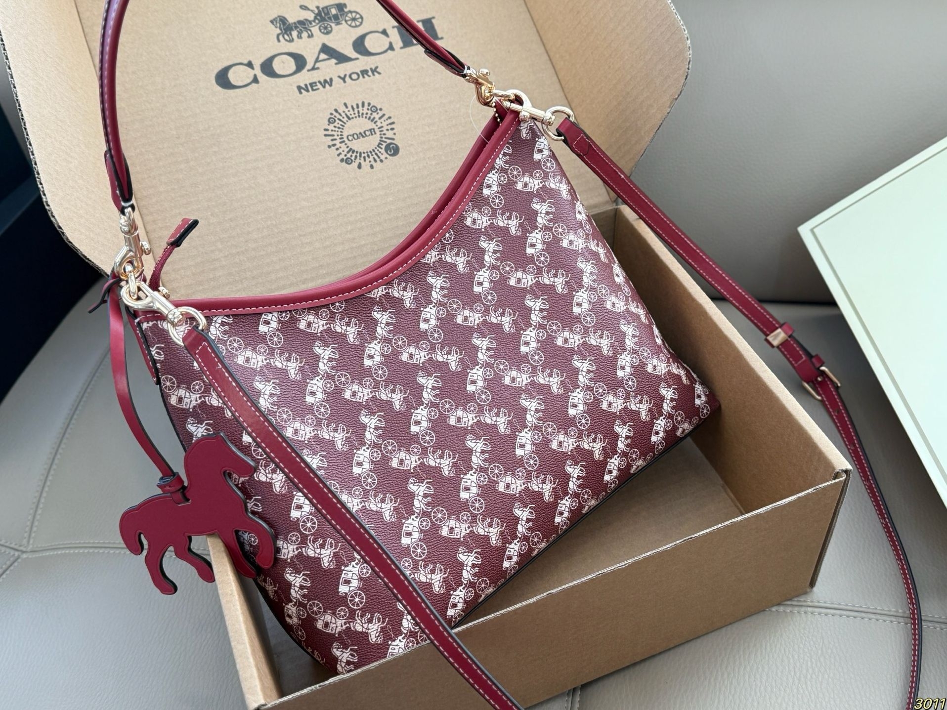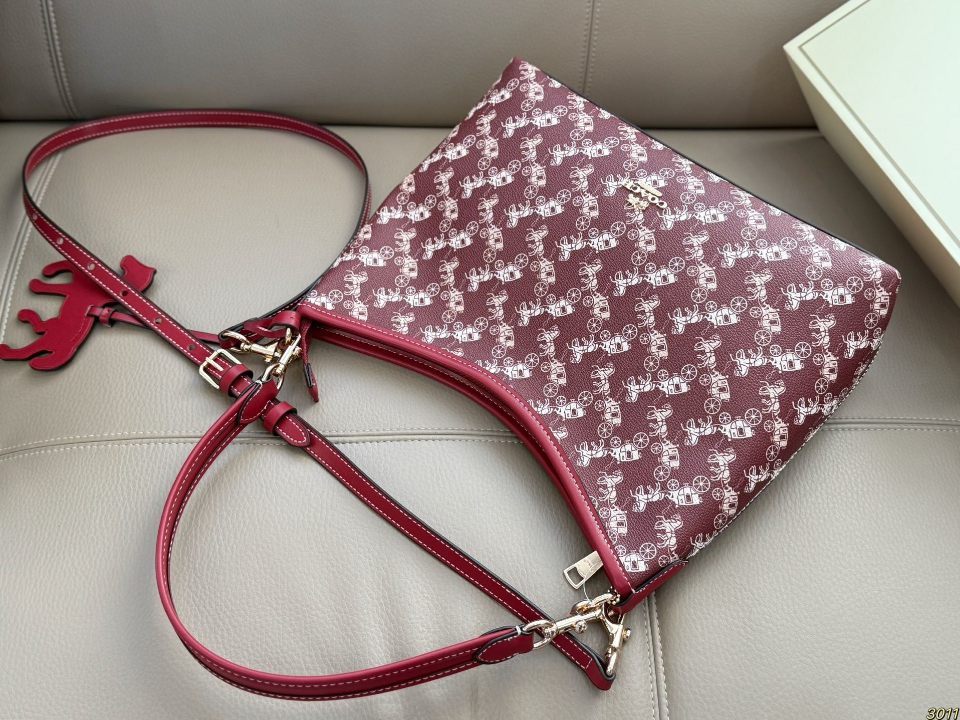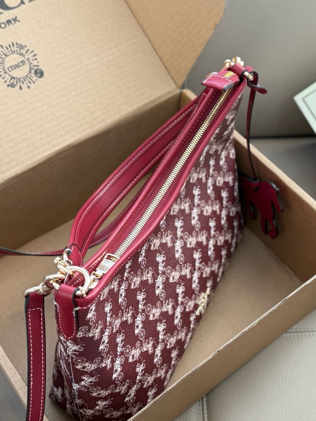 我把它拿出来,放在午后的沙发上。光线从窗户斜进来,照在包身白色的马车图案上,那些图案像是浮在酒红底上的淡淡浮雕。我第一个摸到的是那只小马挂饰,红色的,线条圆润,低着头仿佛在奔跑。手指拂过包面,是那种有细密纹理的皮革,不软塌,有筋骨。金属扣件是淡金色的,轻轻一按,“嗒”一声,是扎实的吻合。