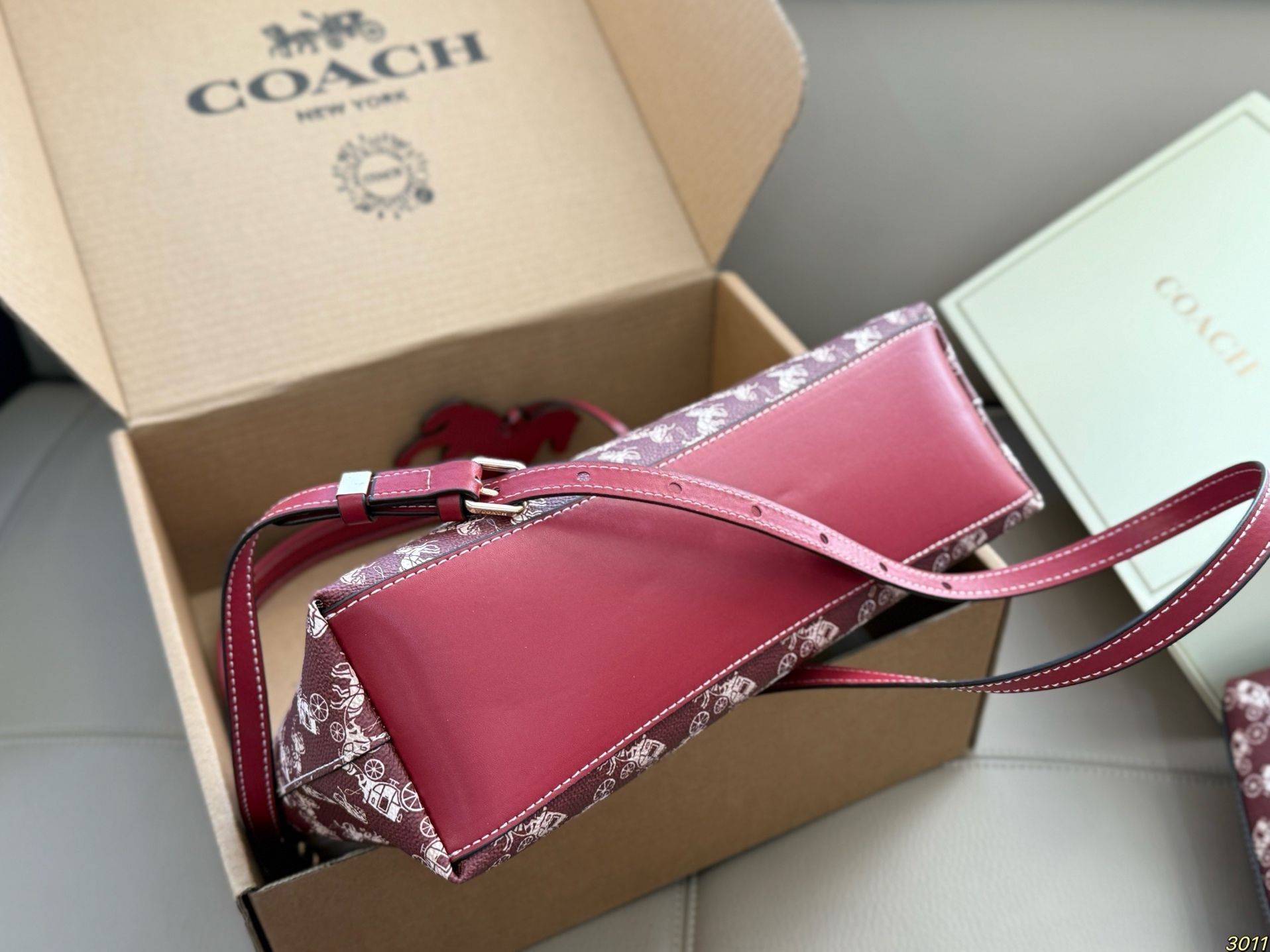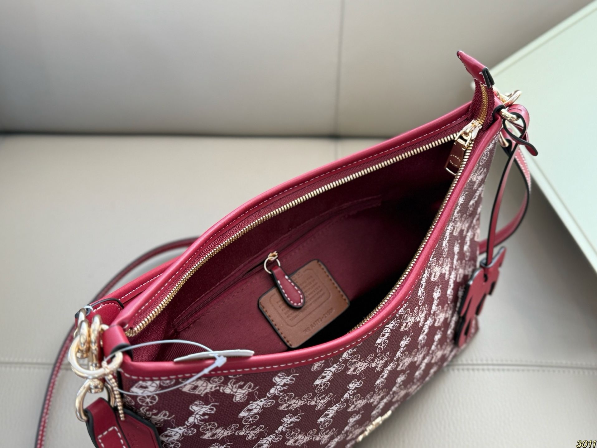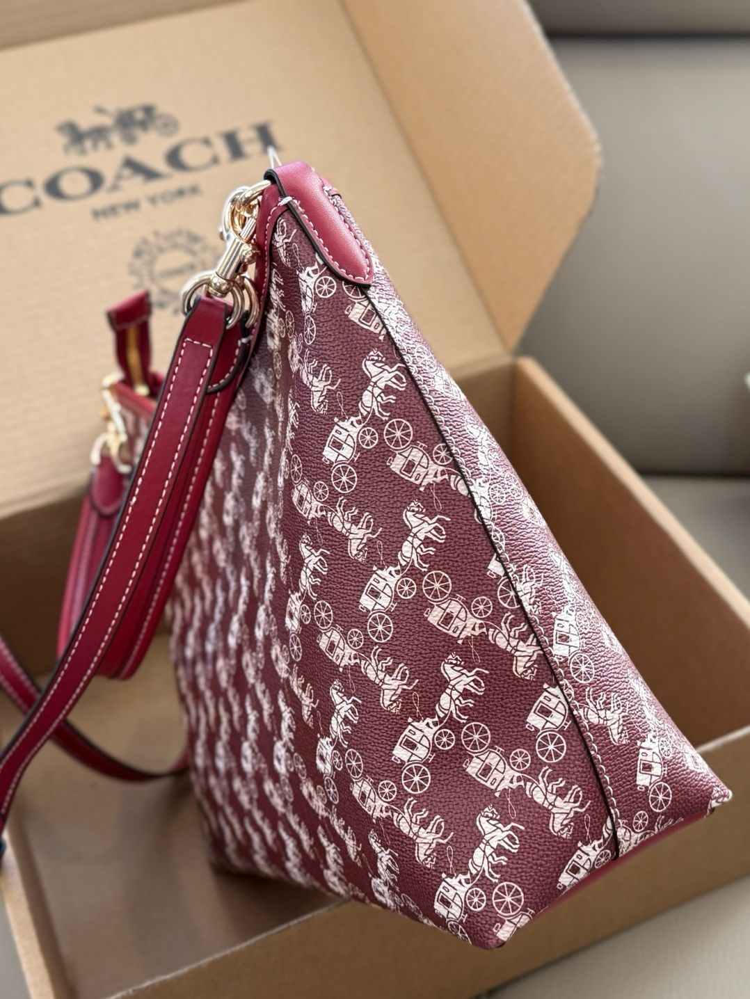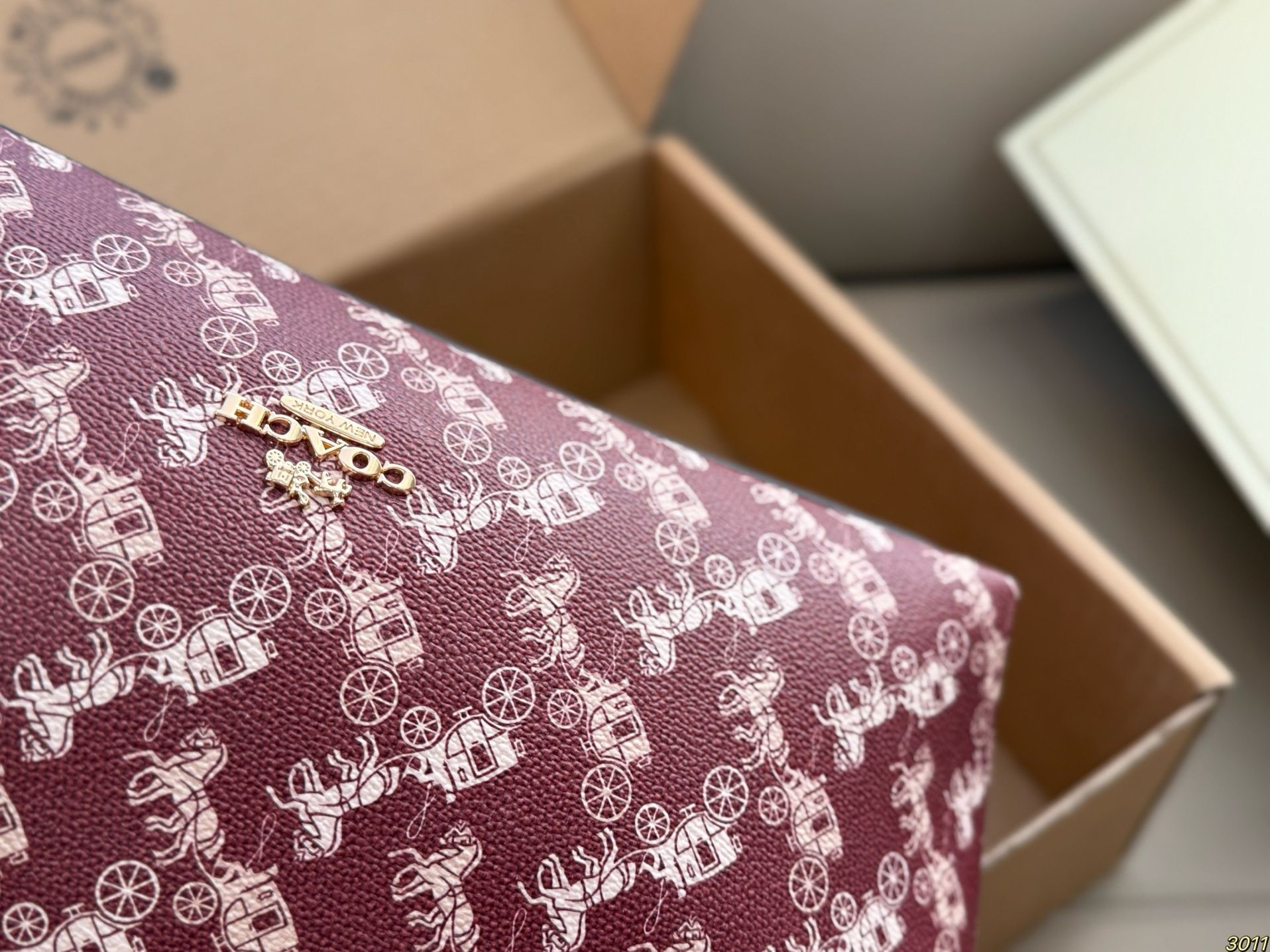 我把它拿出来,放在午后的沙发上。光线从窗户斜进来,照在包身白色的马车图案上,那些图案像是浮在酒红底上的淡淡浮雕。我第一个摸到的是那只小马挂饰,红色的,线条圆润,低着头仿佛在奔跑。手指拂过包面,是那种有细密纹理的皮革,不软塌,有筋骨。金属扣件是淡金色的,轻轻一按,“嗒”一声,是扎实的吻合。