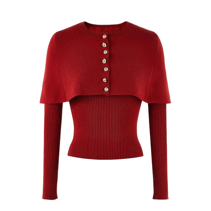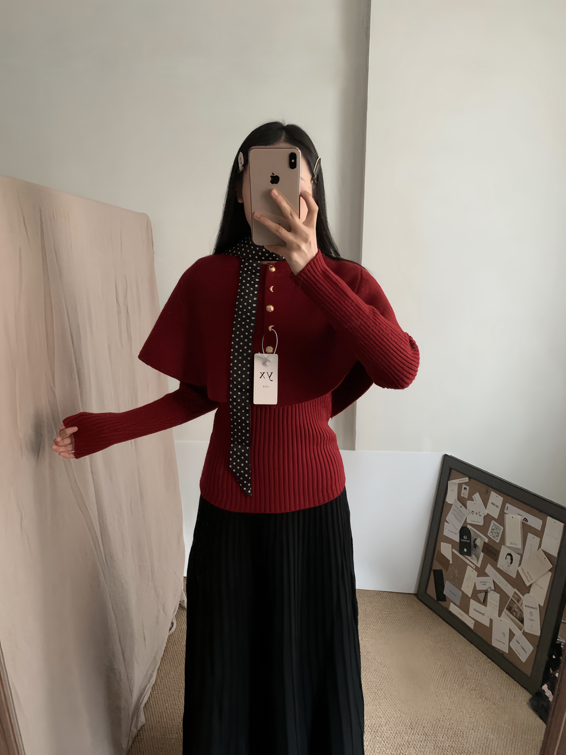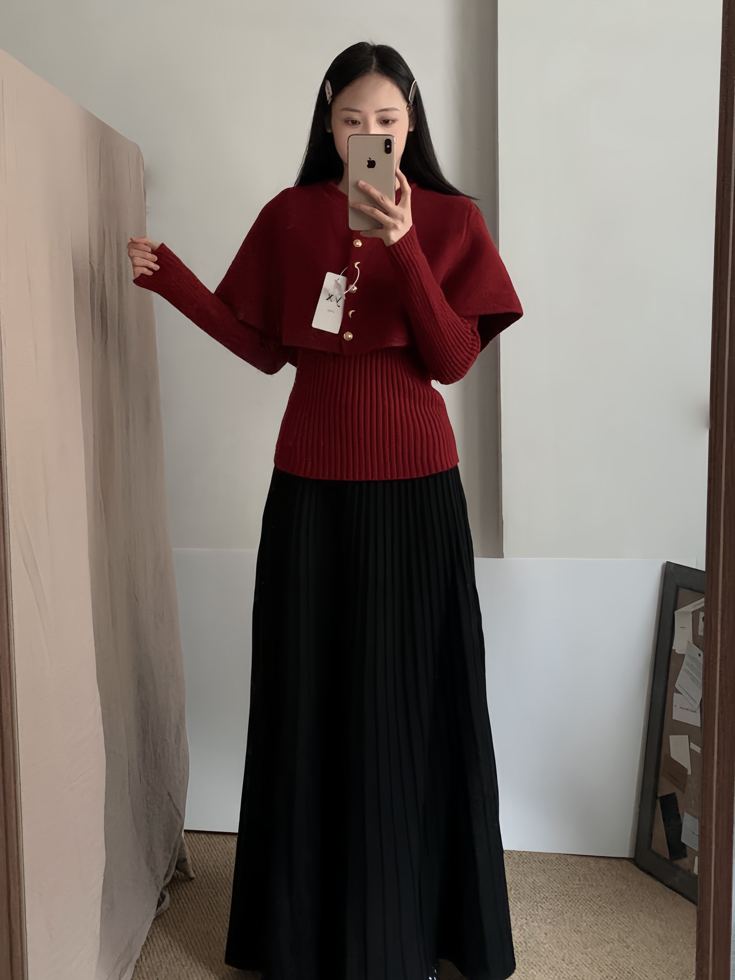 ME:160/84新年氛围拉满的一套! 酒红色斗篷式针织衫自带复古优雅感, 收腰设计更显身材, 搭配黑色百褶长裙, 端庄又不失灵动, 很适合节日聚会氛围