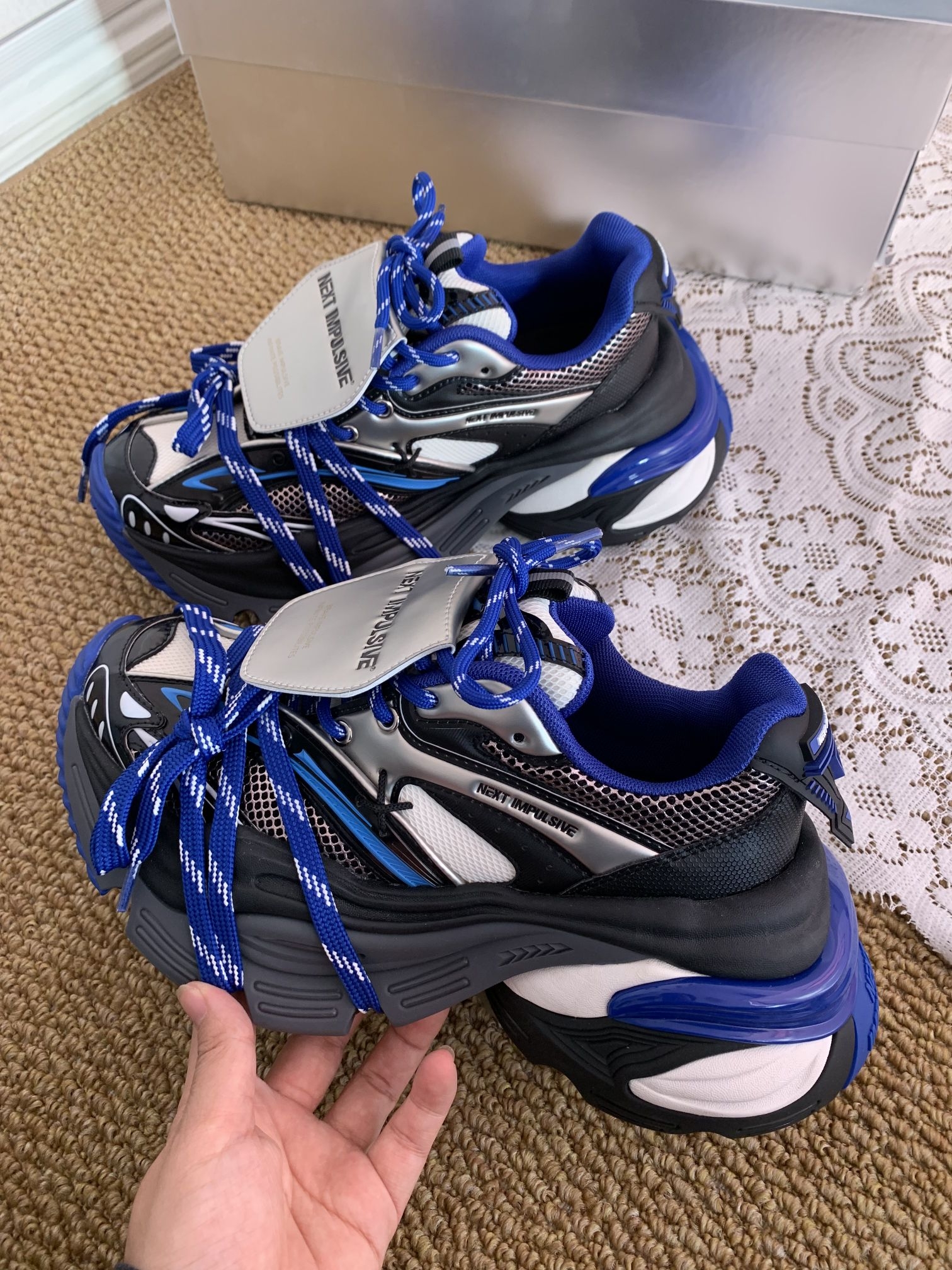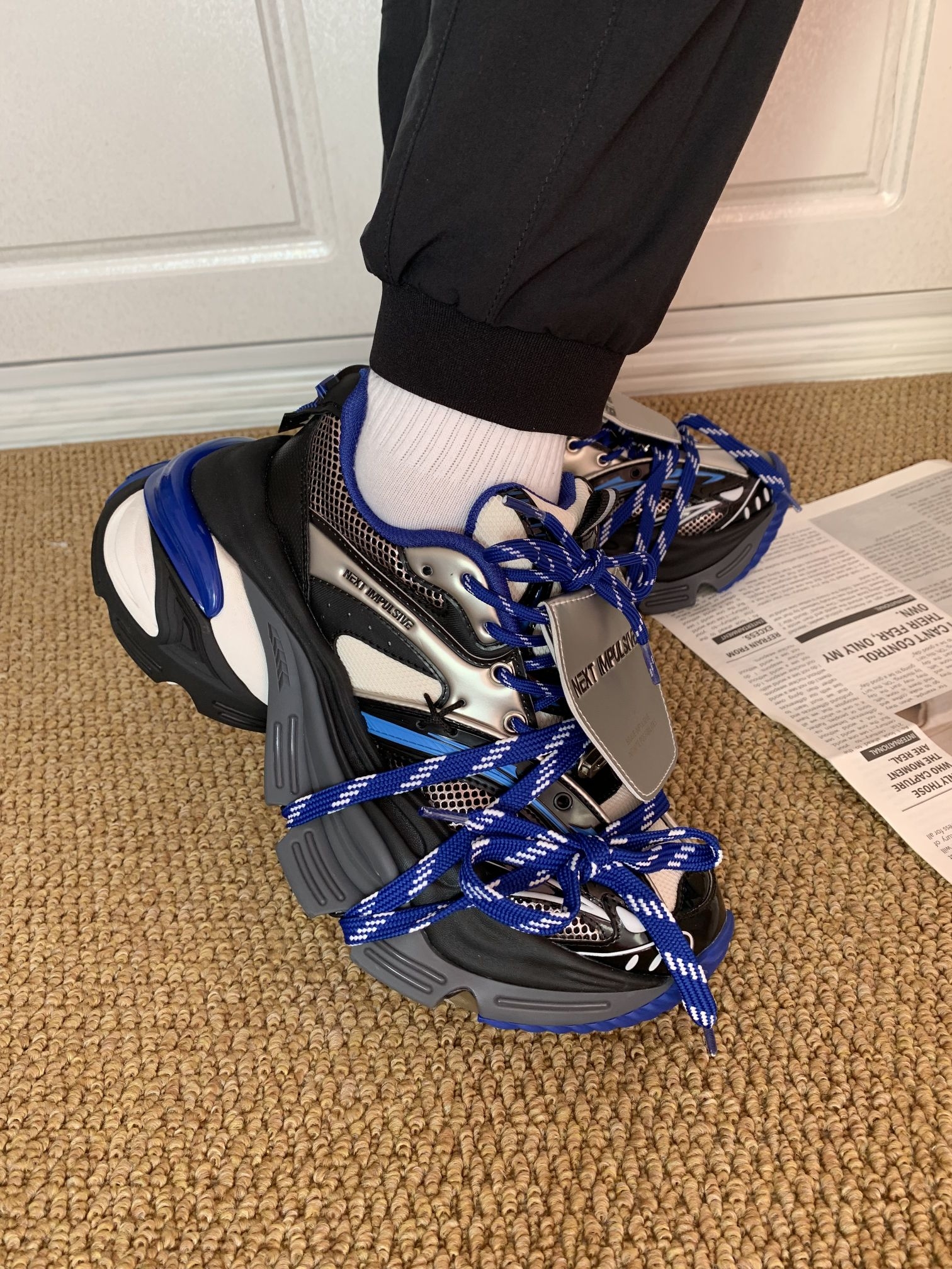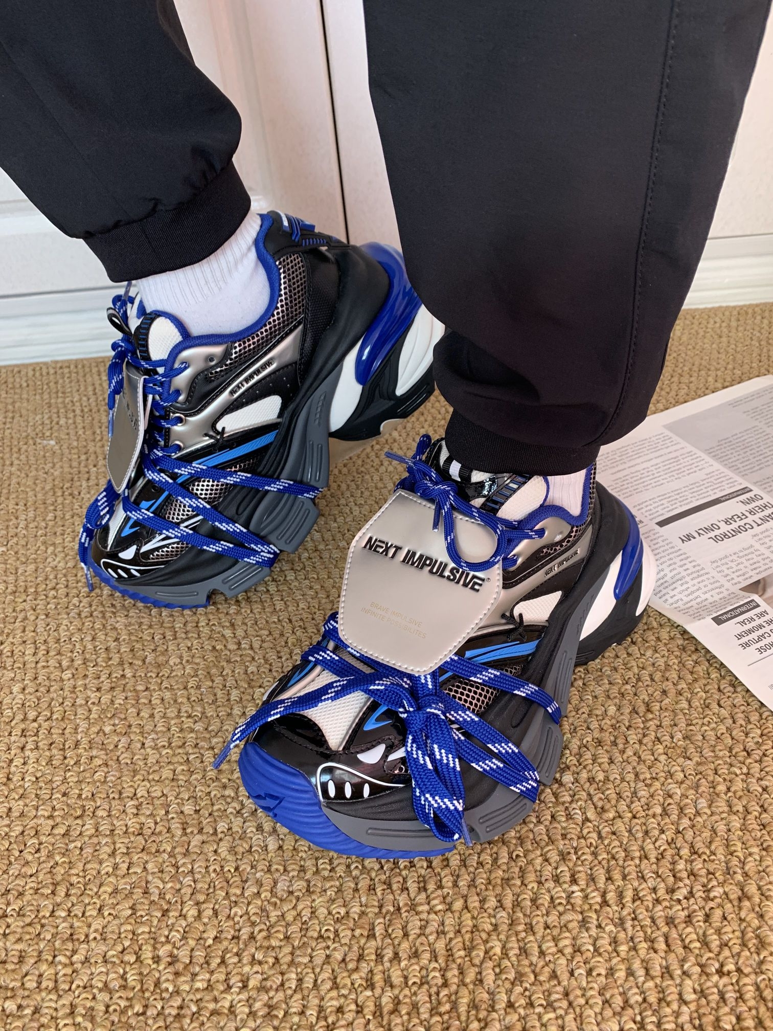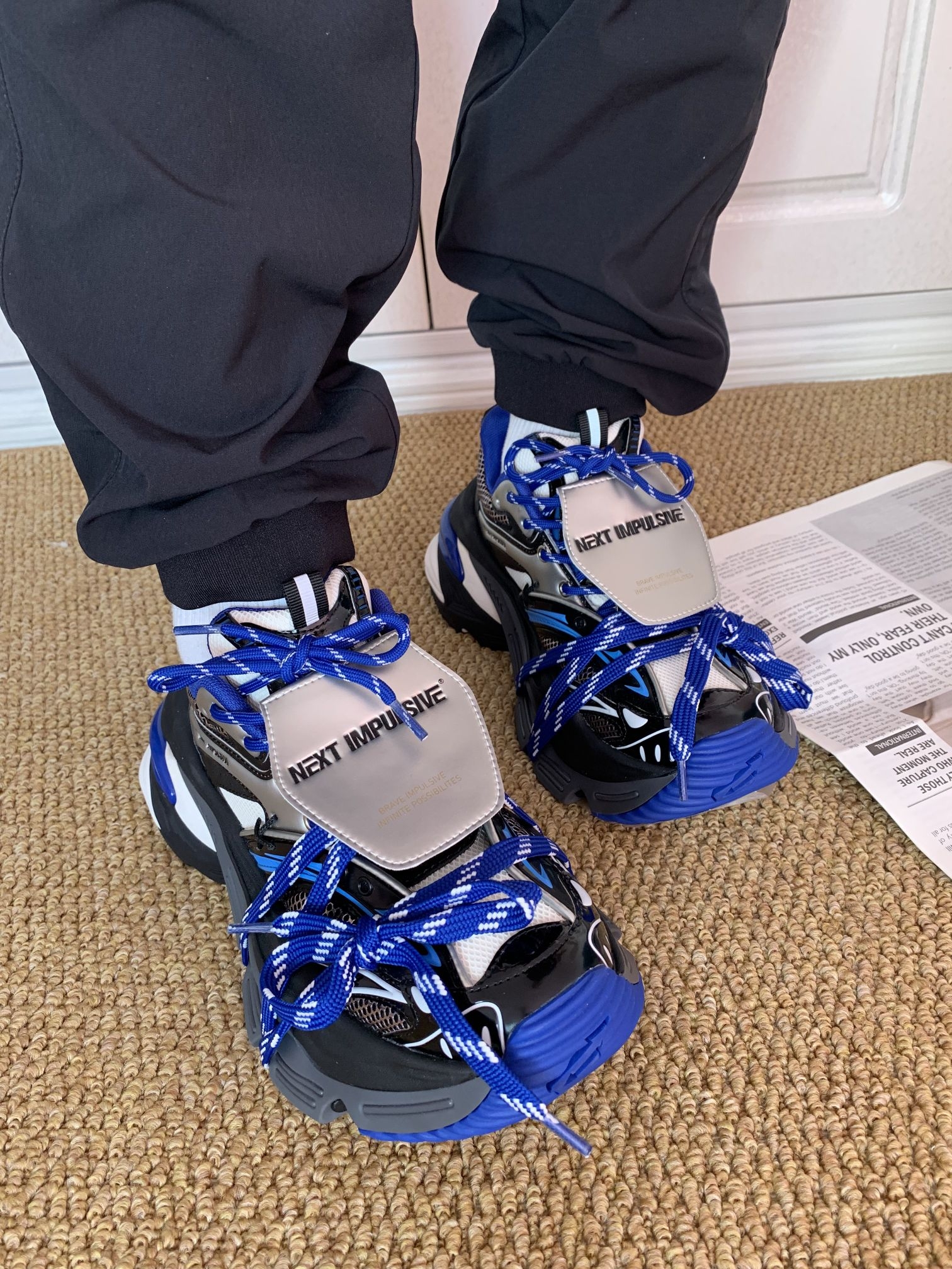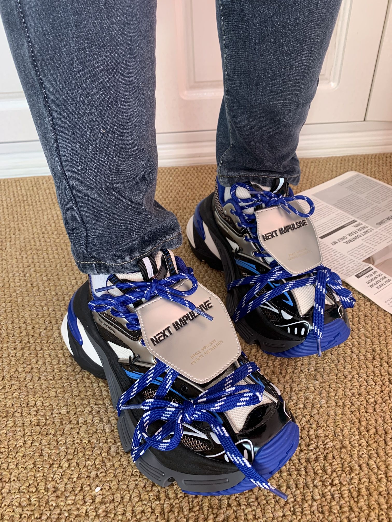 挖到宝啦!这双塞博蓝老爹鞋也泰酷了吧!蓝黑白的配色再加上箭头的设计一看就是我喜欢的风格嘞就是鞋子瞅着有点大,鞋子酷到心坎上啦㊗️ 但是上脚很舒服显得腿很细呢?鞋子高度接近7cm左右适合我这种小个子女孩纸🫶