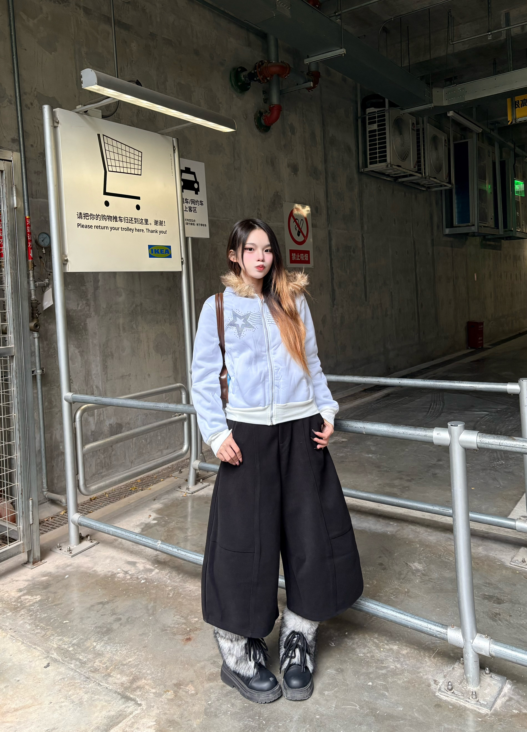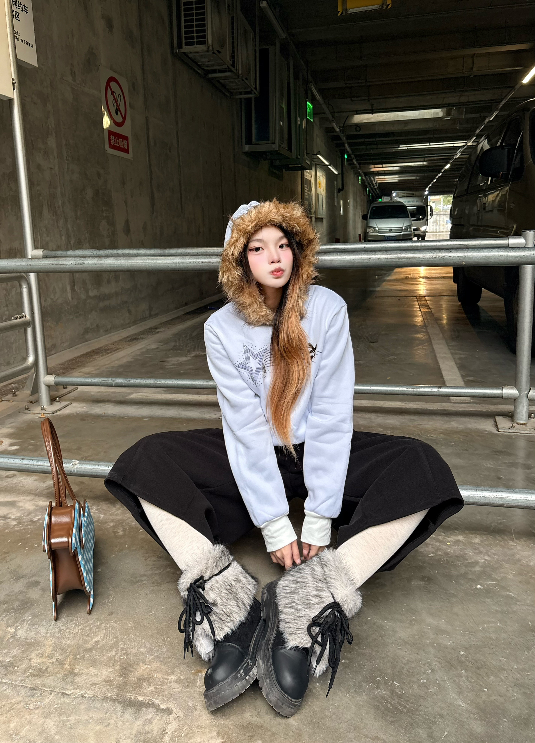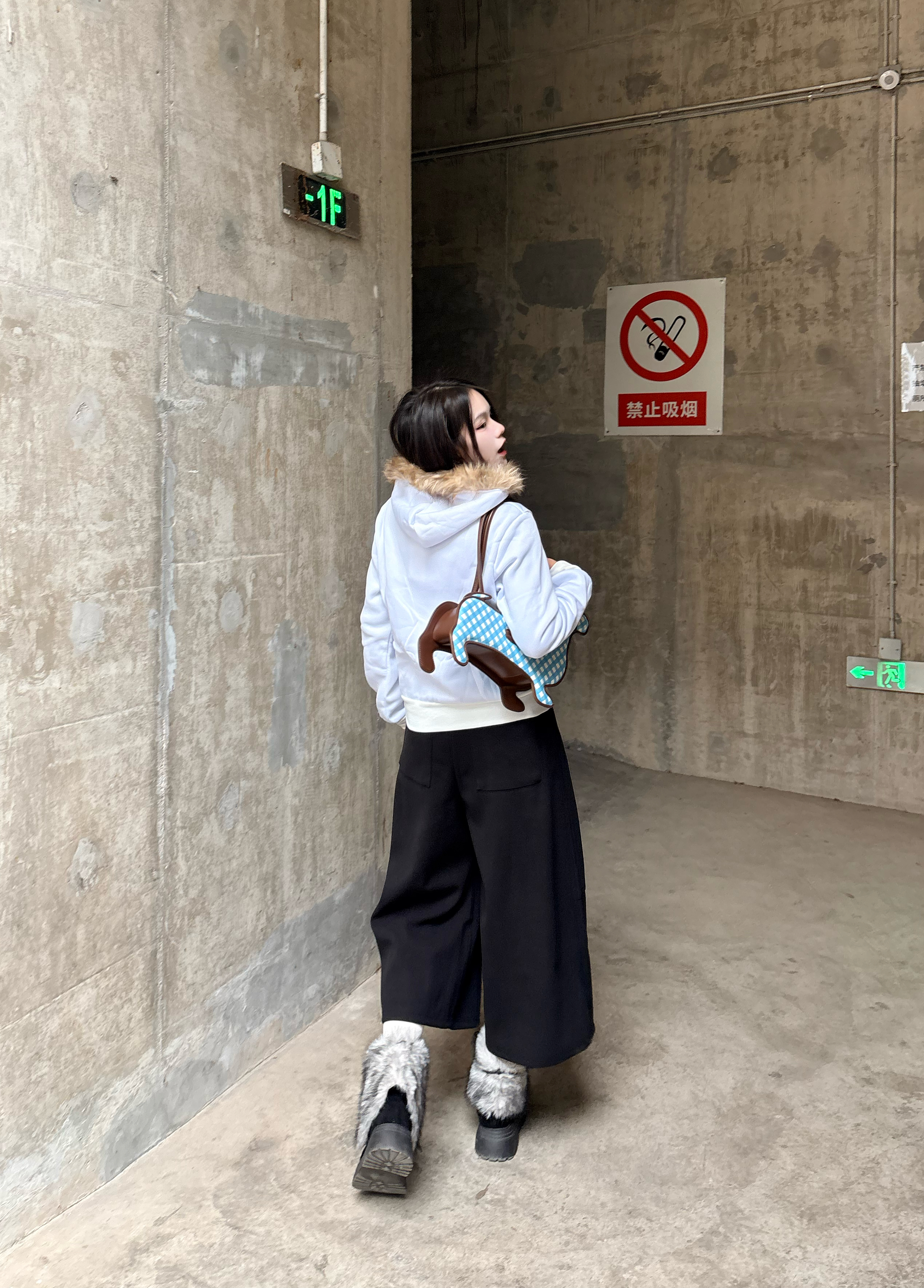 这套穿搭真的把甜酷感焊在身上了🍁 毛领卫衣+垂感黑阔腿裤,软fufu的毛领自带秋冬氛围感,宽松版型藏肉又舒服。💕 脚上这双毛绒雪地靴,踩上去像踩棉花一样,搭配蓝格纹小狗包,直接把甜妹氛围拉满❄️ 💡 我的懒人搭配思路: • 卫衣+阔腿裤+雪地靴 → 5分钟搞定出门✨ • 小狗包作为亮点点缀 → 复古甜妹感拉满 • 宽松裤型藏肉又显腿长,小个子也能轻松驾驭☑️